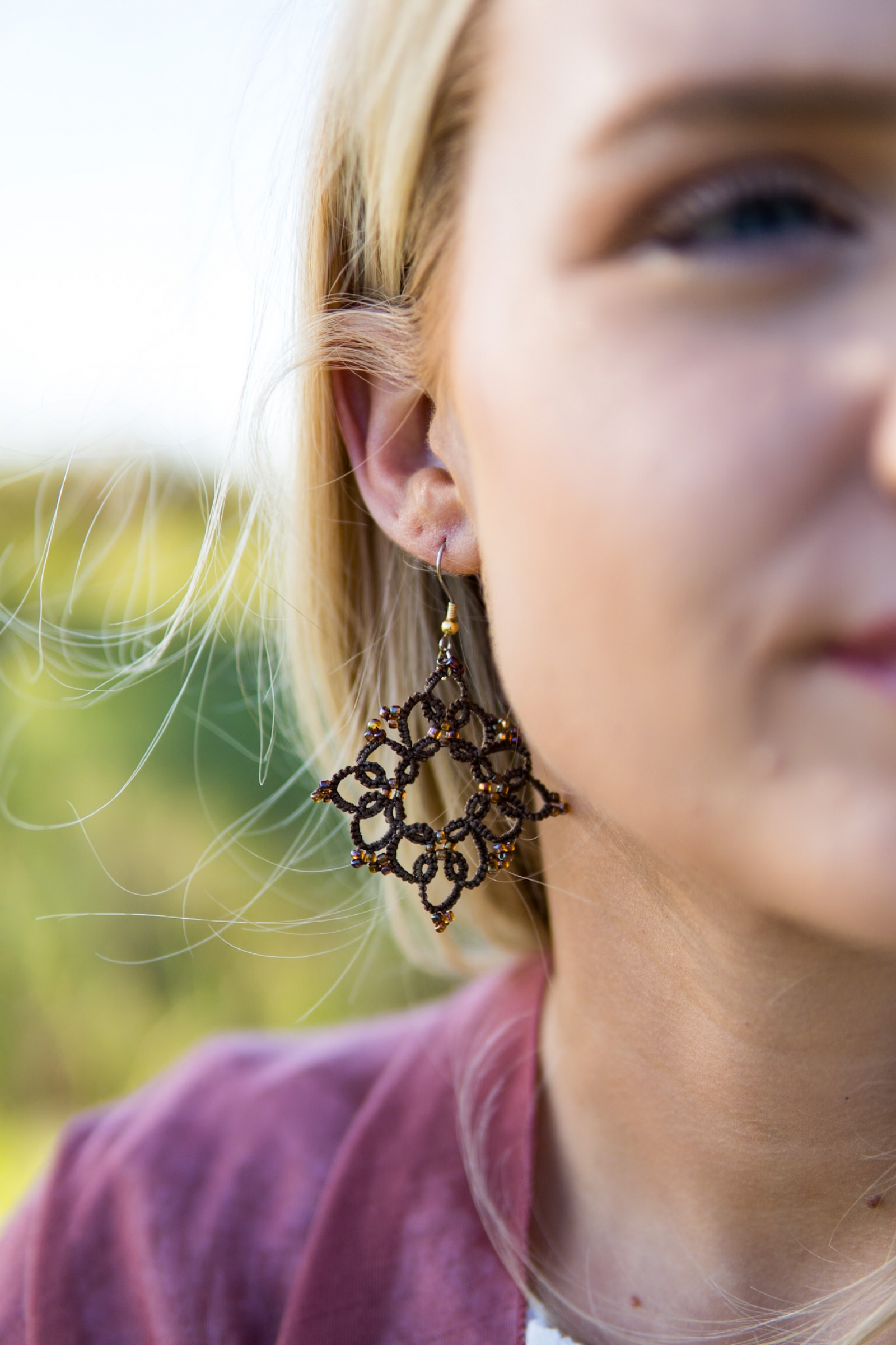 Designed from a pattern published in 1916, these tatted earrings are made in Italian polyester thread, are accented with small glass beads, and measure approximately 1.5" square.