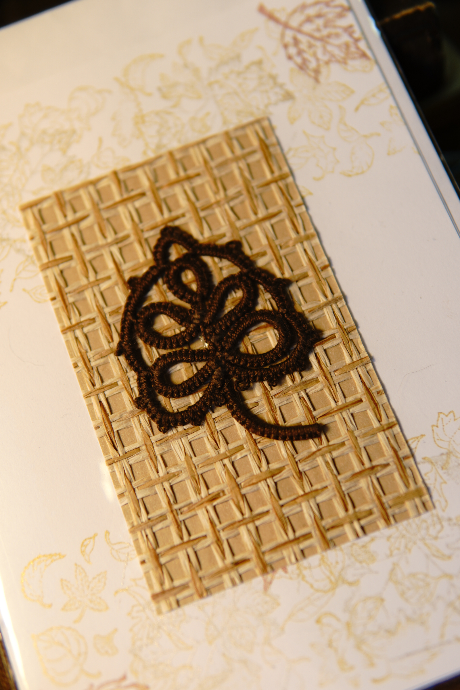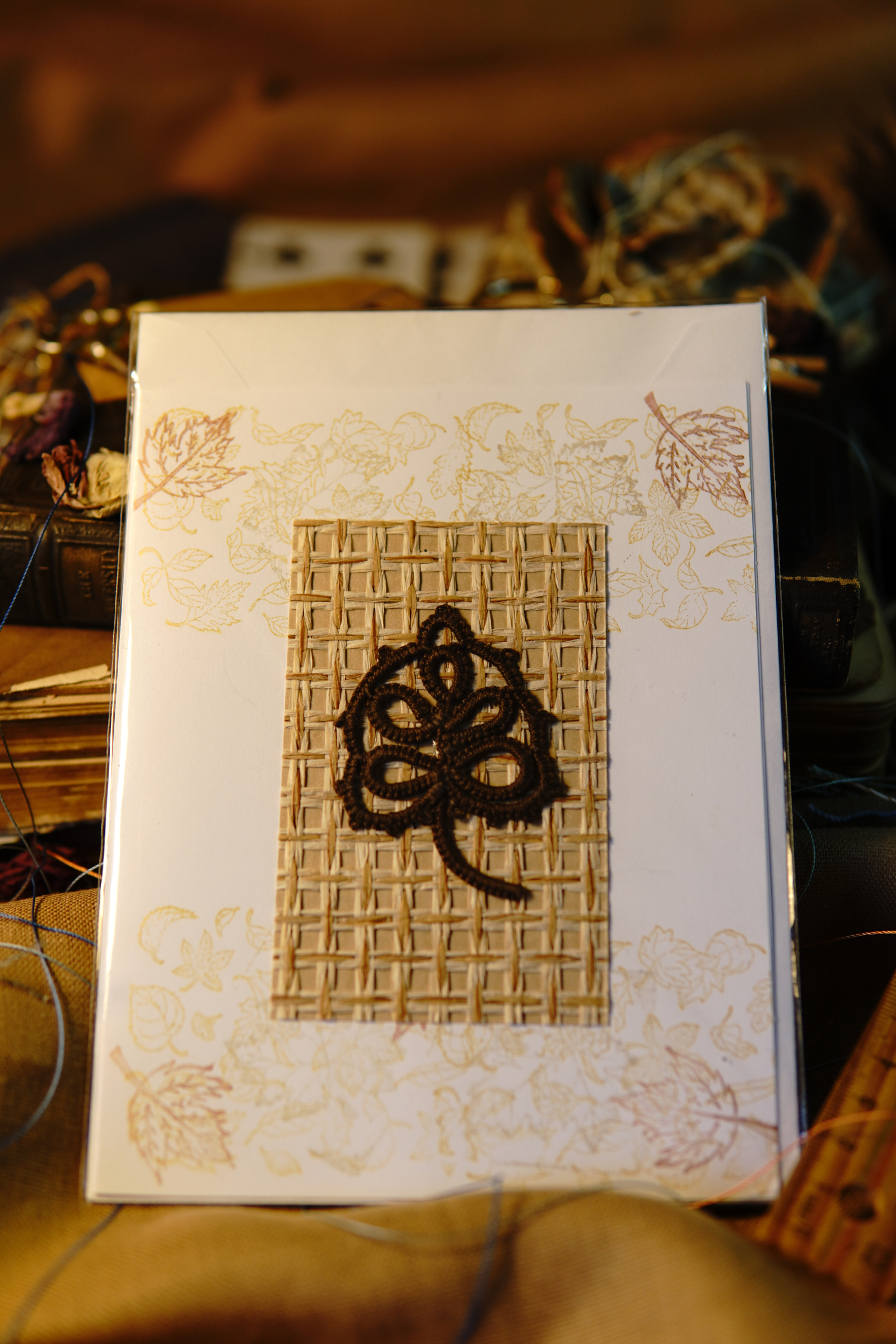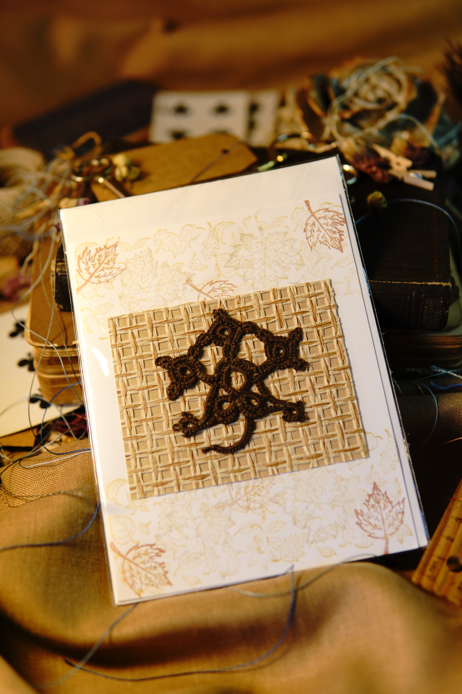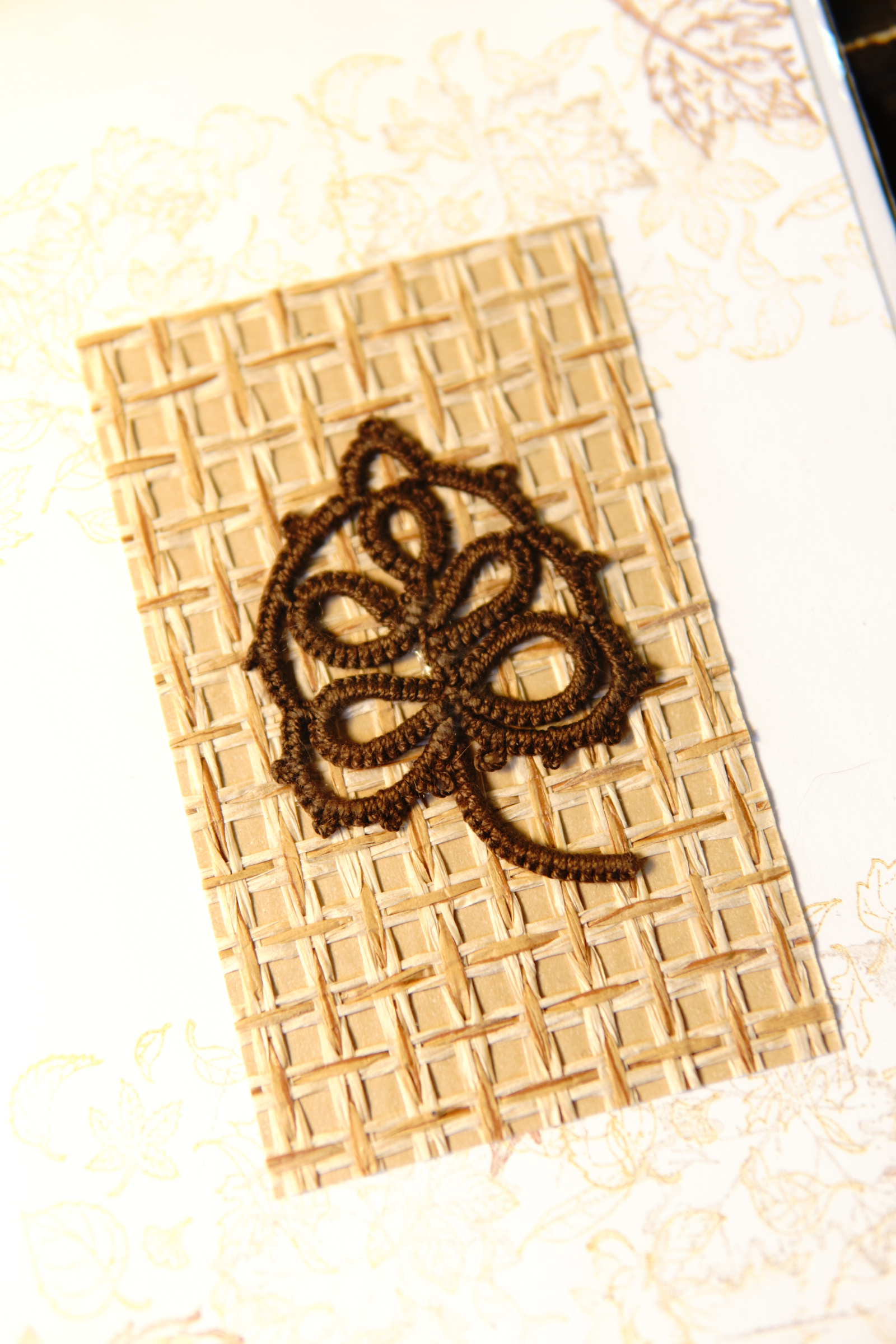 Autumn Leaf Notes blends handmade fiber art with timeless stationery. Each card features a tatted lace leaf motif crafted in rich brown thread, mounted on a woven natural paper insert.