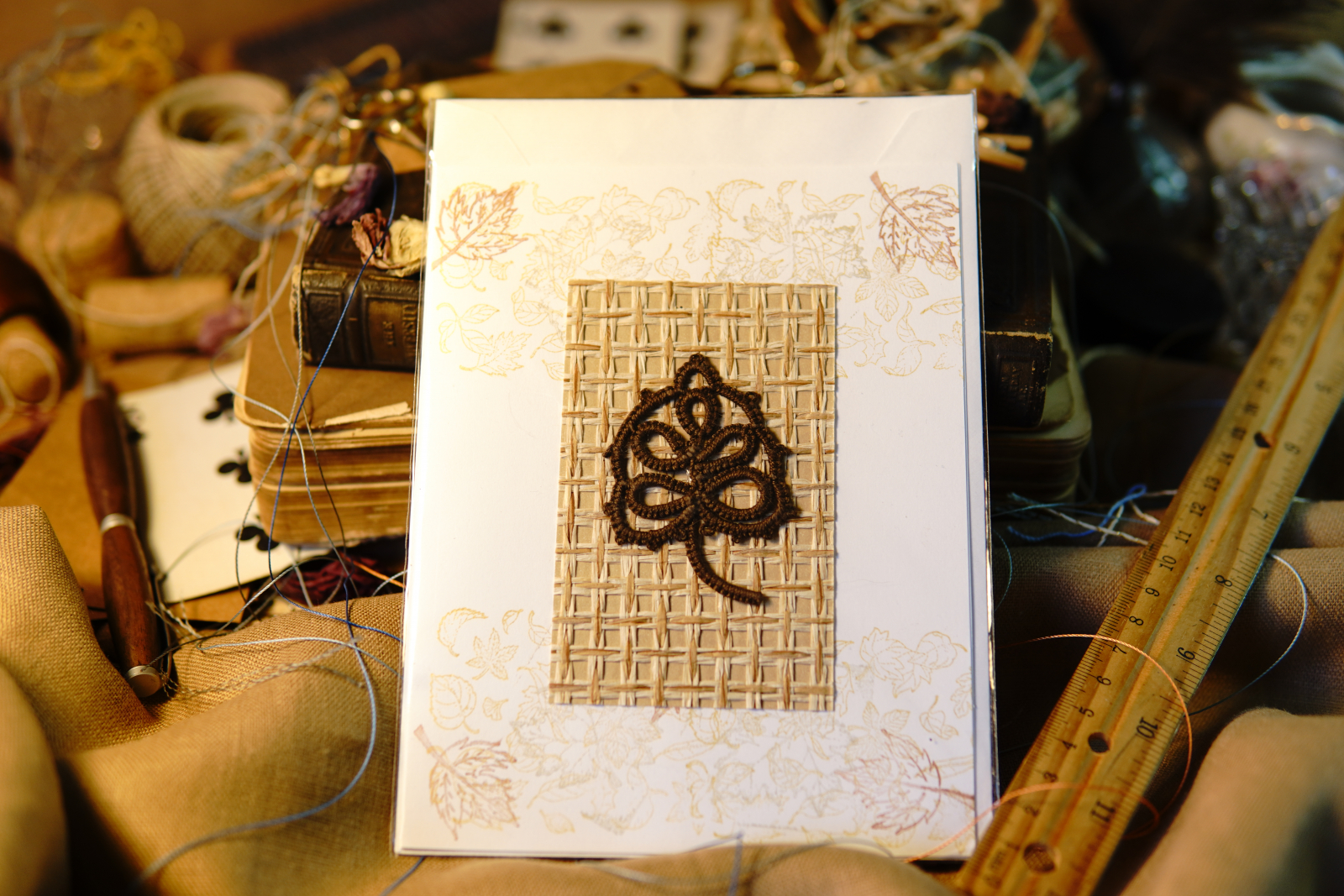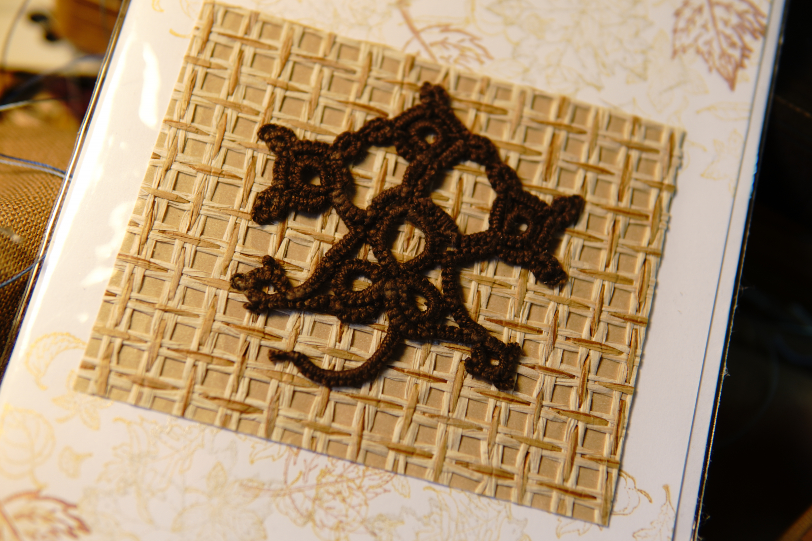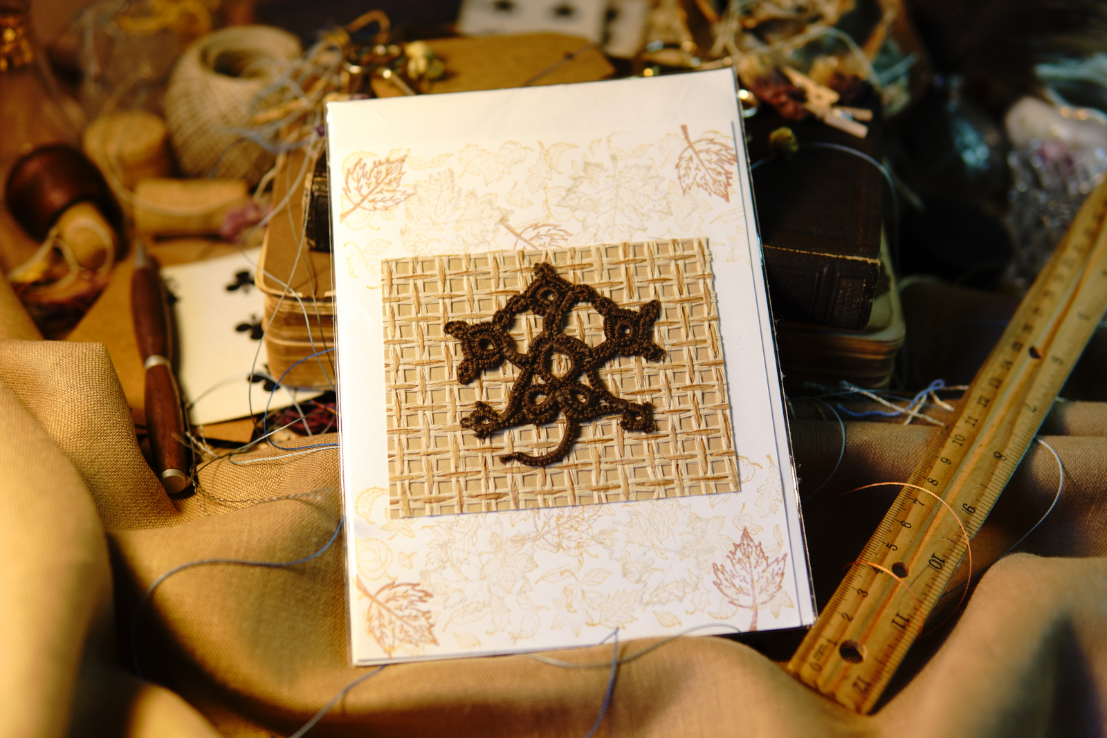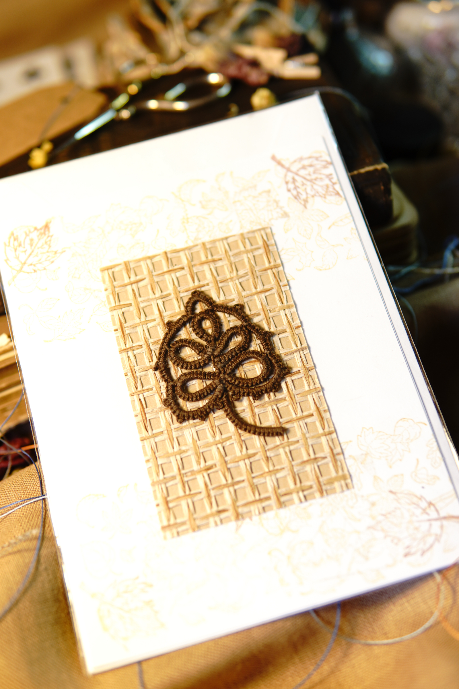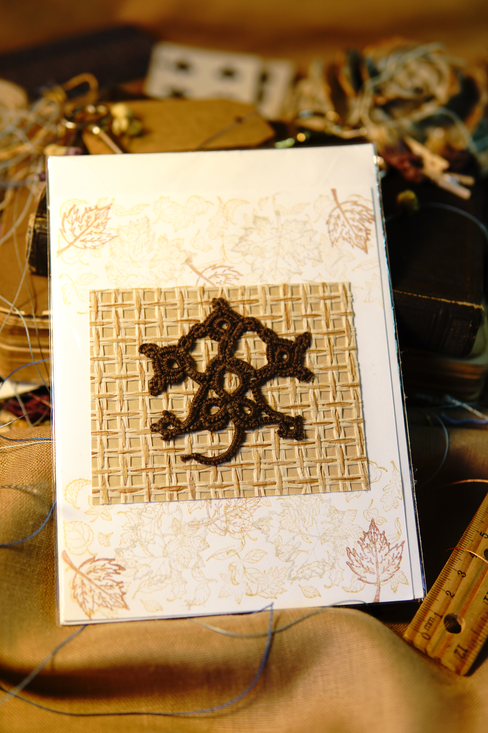 Autumn Leaf Notes blends handmade fiber art with timeless stationery. Each card features a tatted lace leaf motif crafted in rich brown thread, mounted on a woven natural paper insert.