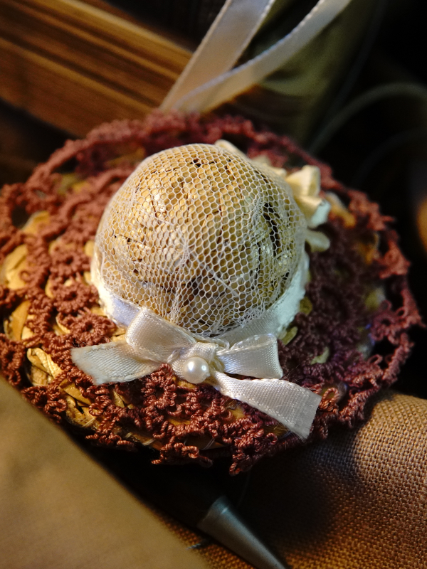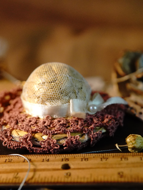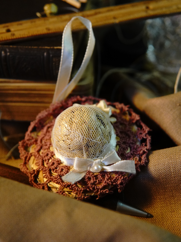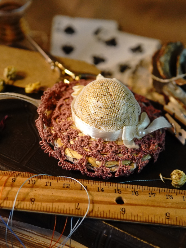 Step into vintage charm with this one-of-a-kind Edwardian Lace Hat Ornament from the Threadmarked line. Inspired by the wide-brimmed hats popular in the early 1900s, this piece blends delicate hand-tatting, soft lace, and nostalgic color into a tiny work of textile art.