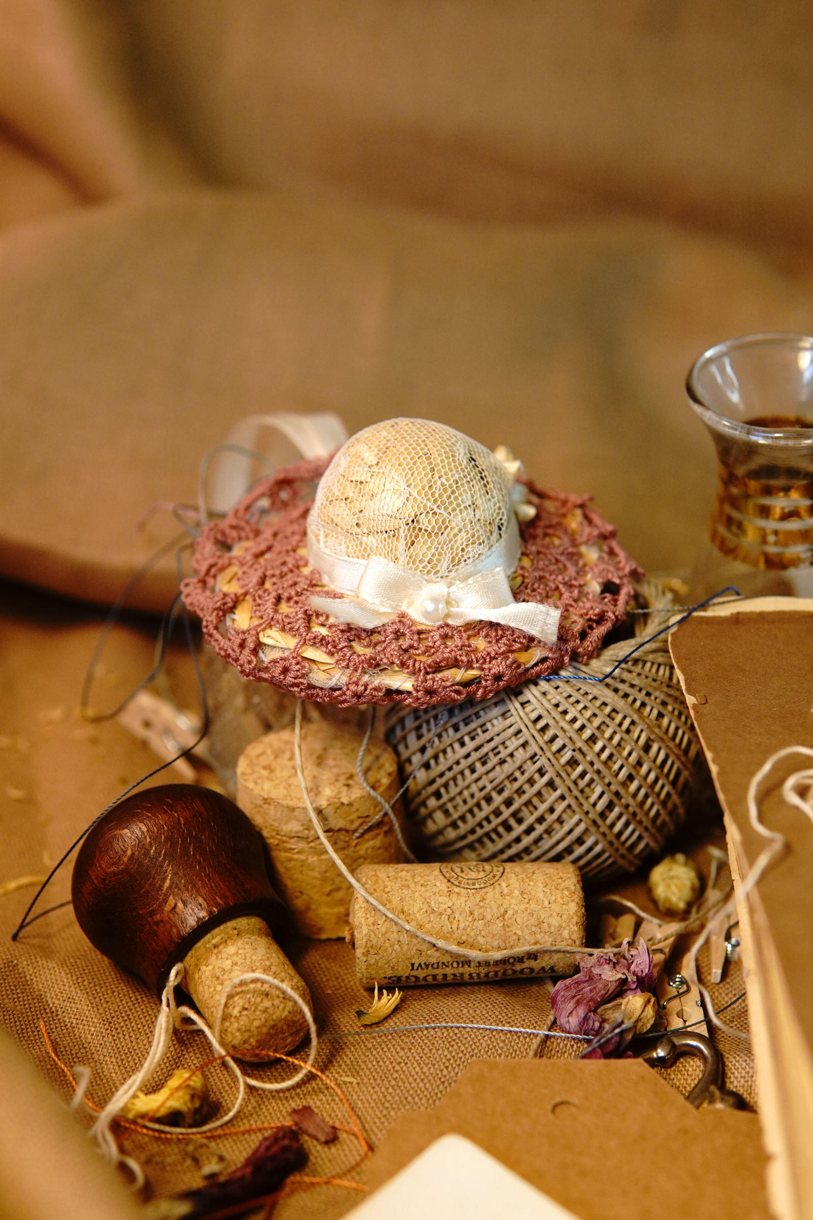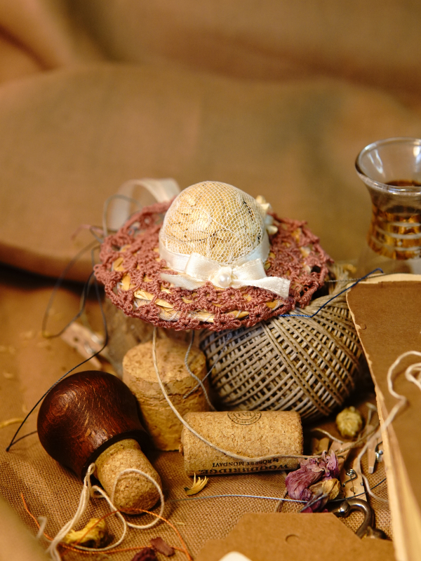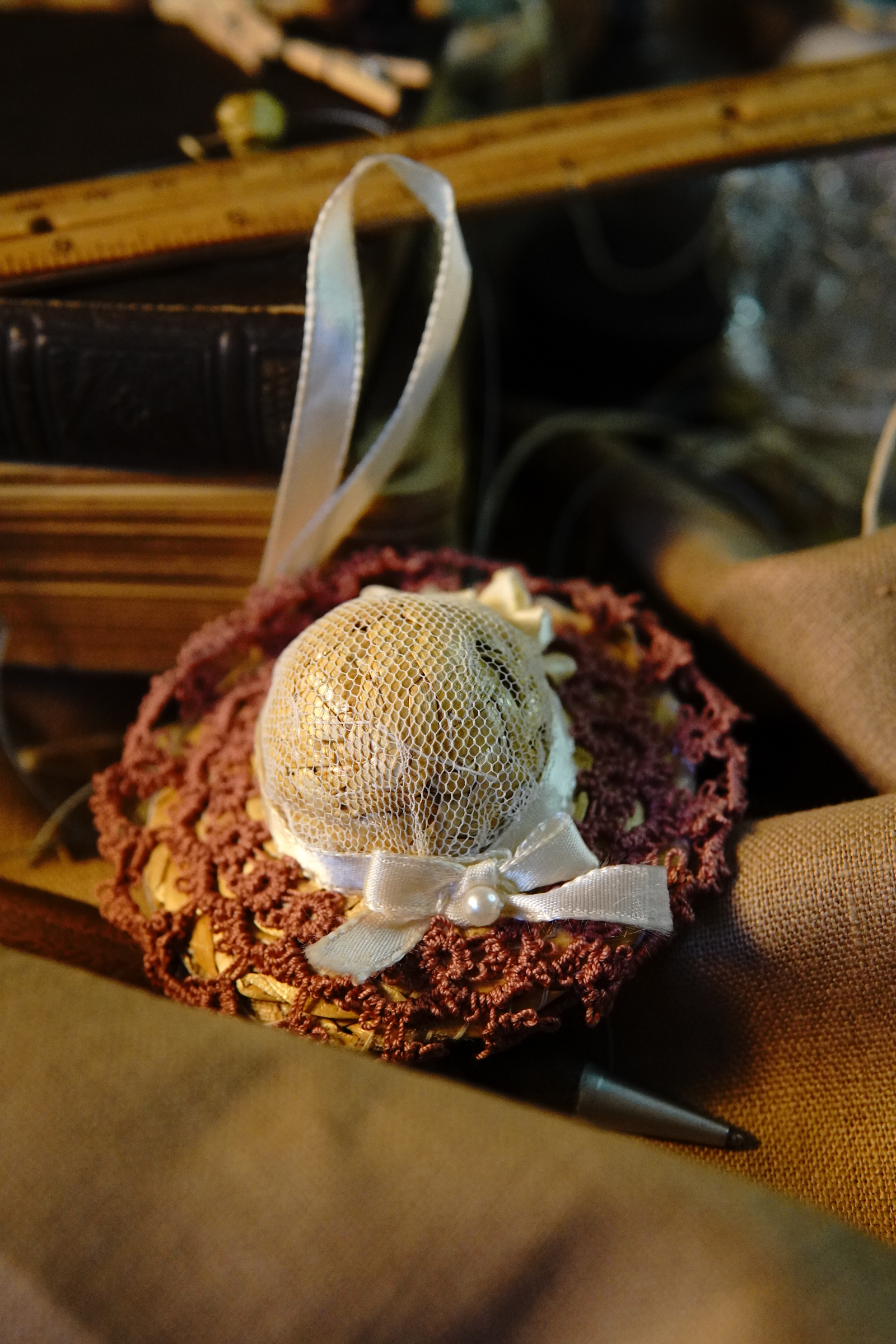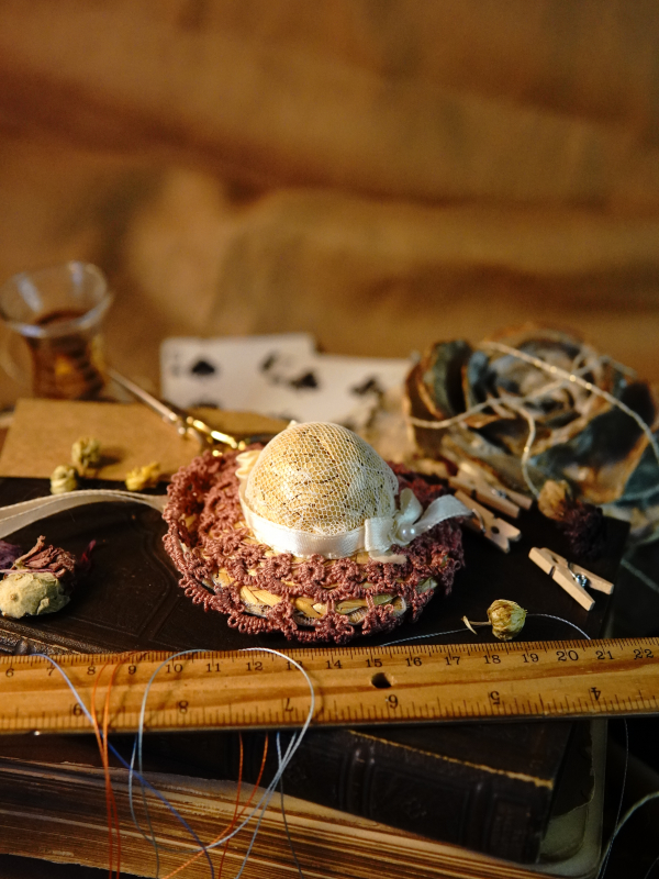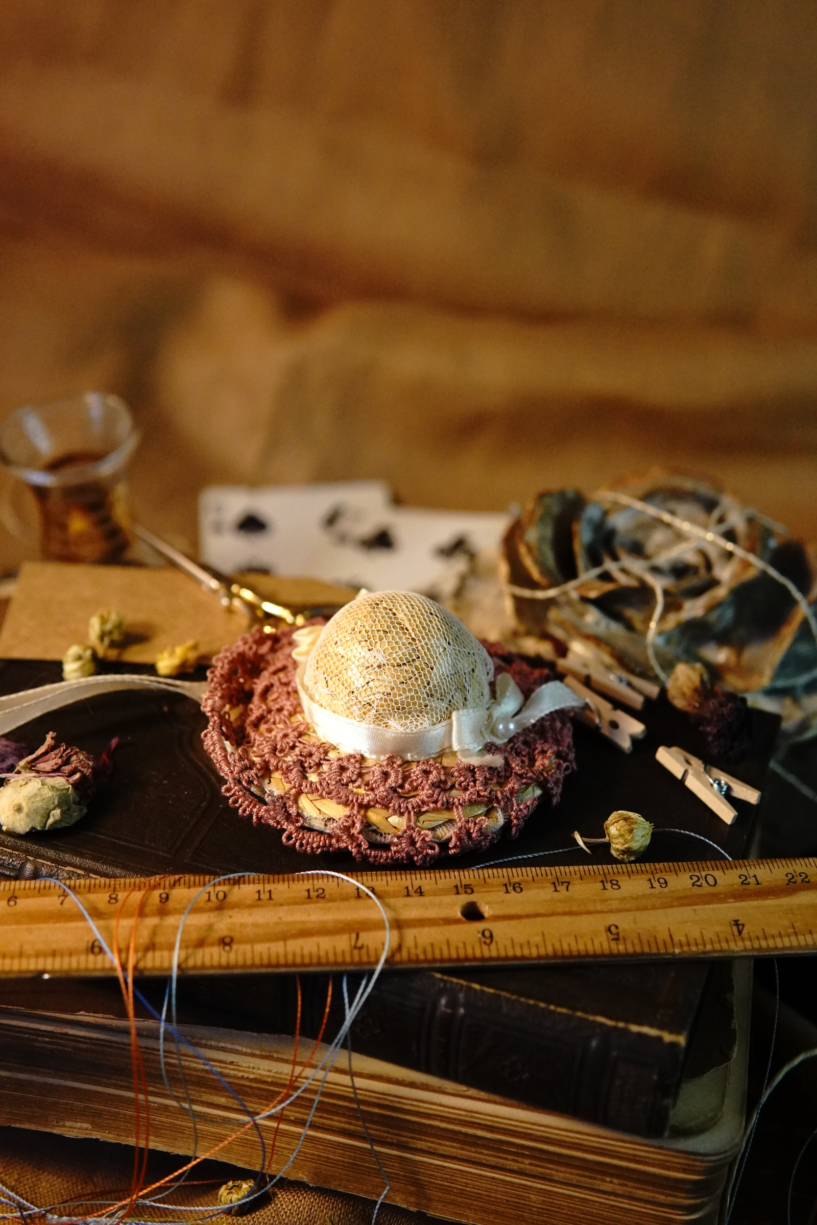 The hat is lightly filled with rose potpourri for a gentle botanical note and finished with a satin ribbon hanger for effortless display on a tree, shelf, hook, or dresser mirror. Each stitch and knot was crafted by hand — no two will ever be the same.