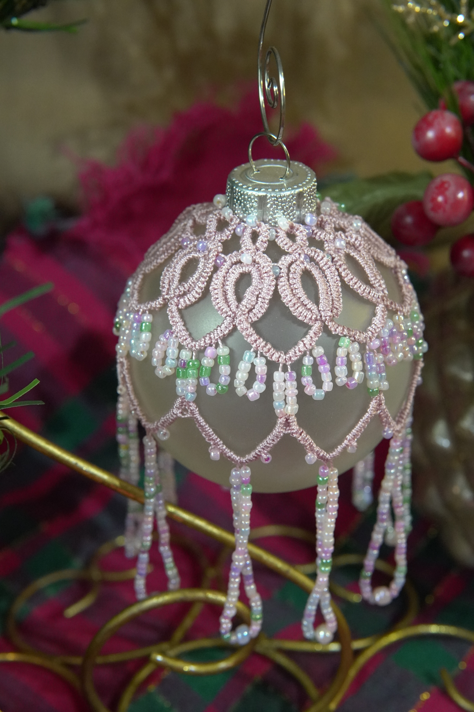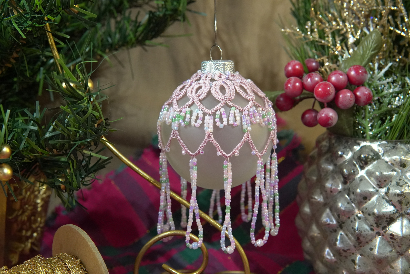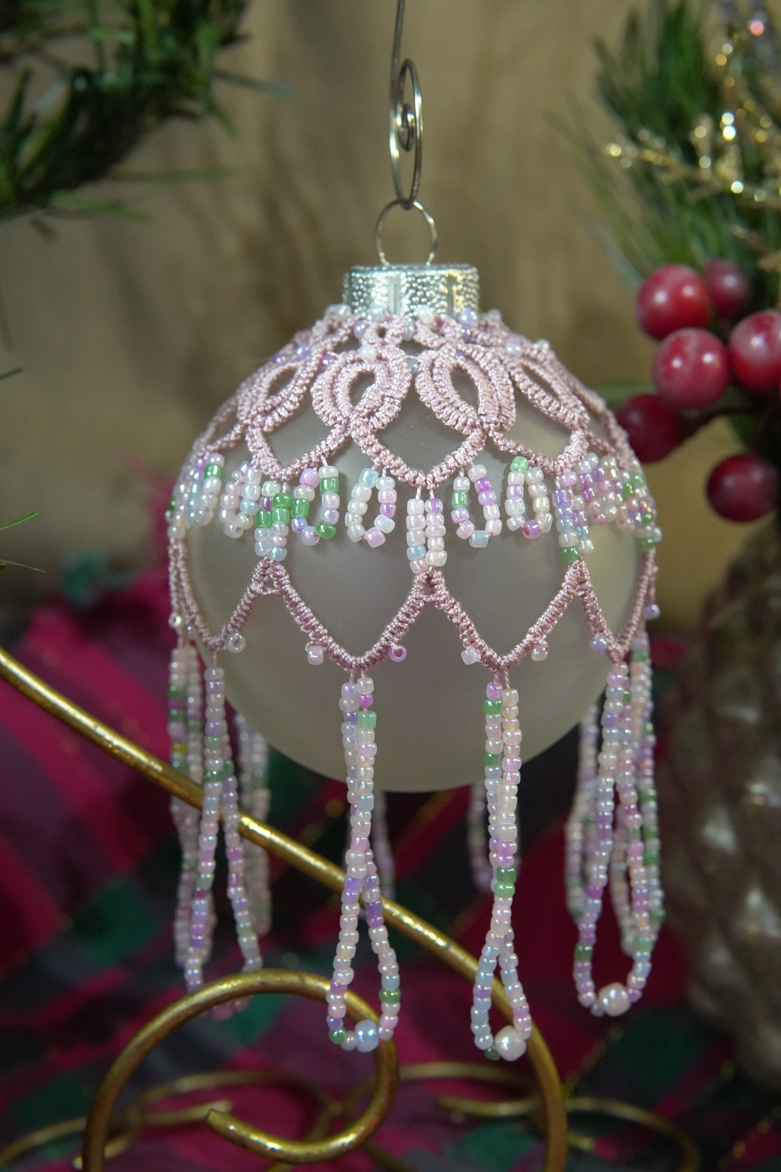 Elevate your tree with the Frosted Roselight Cascade Ornament—a breathtaking, one-of-a-kind heirloom created in soft pink tatted lace, pearlescent beads, and a frosted glass globe. Each stitch forms a delicate crown of rings and chains that bloom into cascading strands of shimmering pastels, catching every glint of firelight and holiday sparkle.