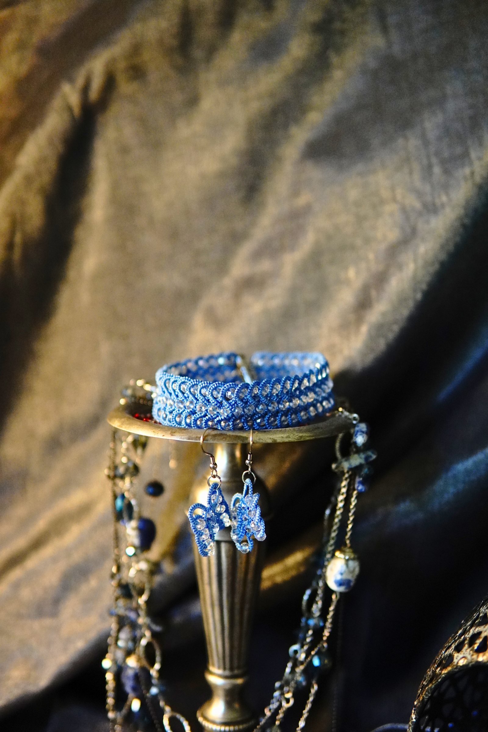 These earrings echo the circlet worn by the sentinels of the wind-beaten outposts: guardians not of borders, but of one another. Blue frost-thread and clear crystal rondelles form small badges of endurance — quiet, steadfast, unbroken.