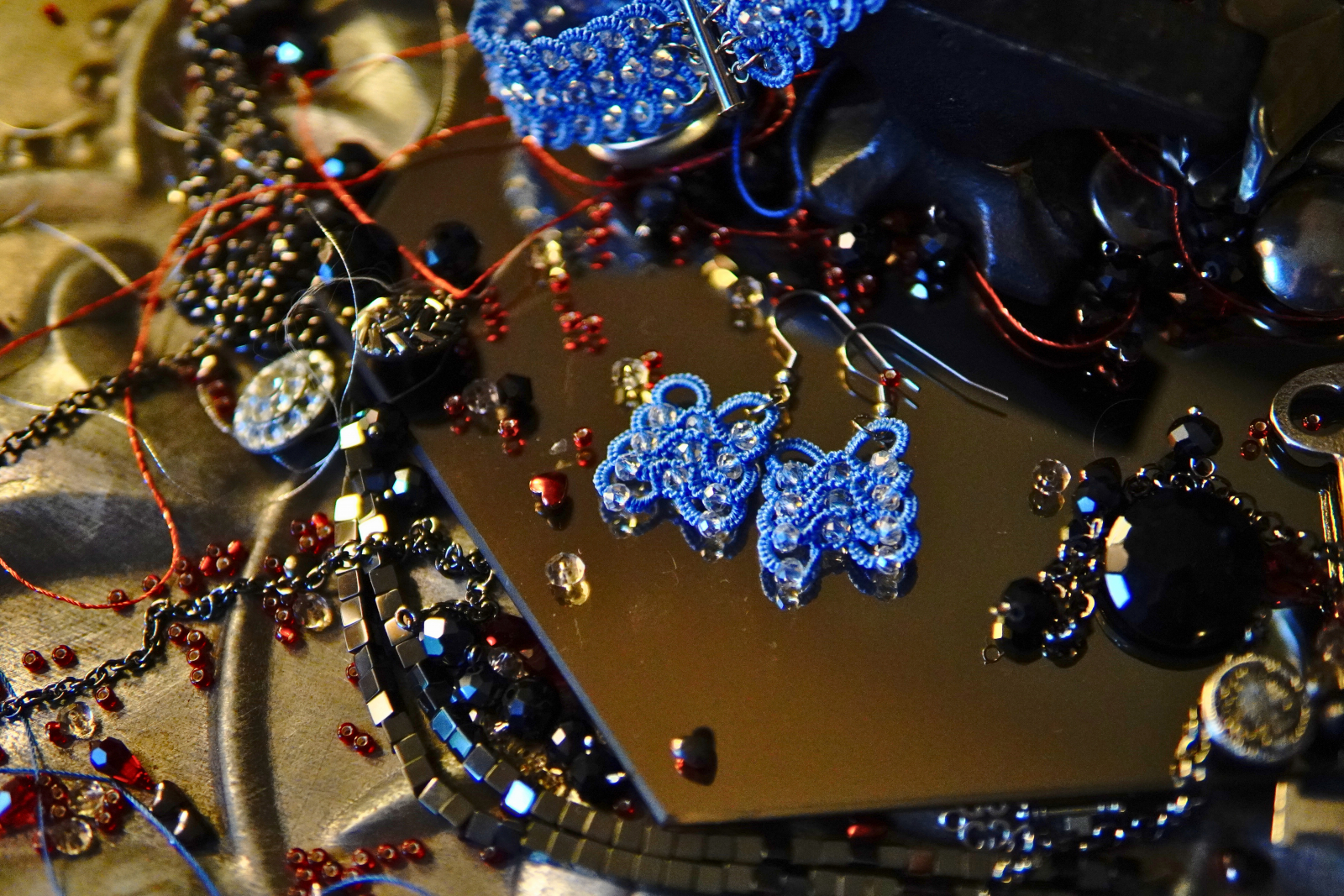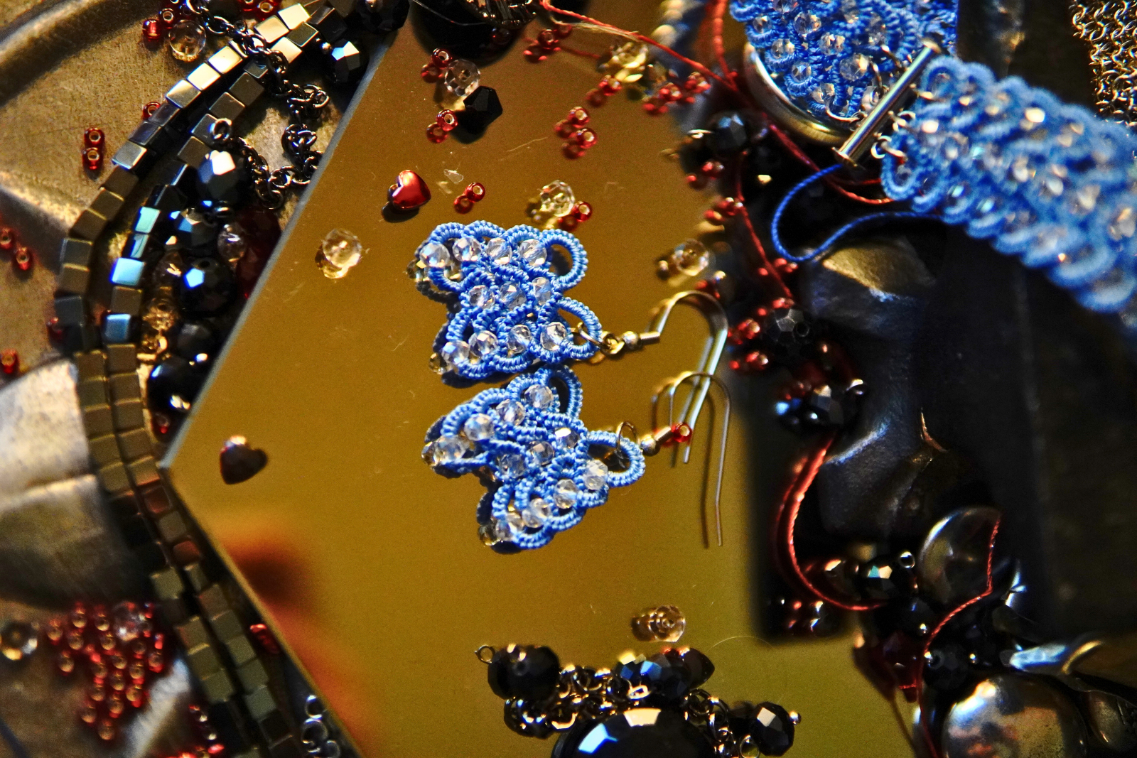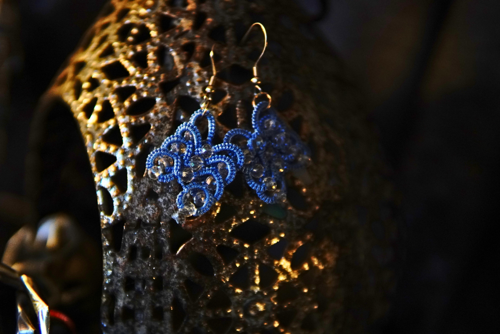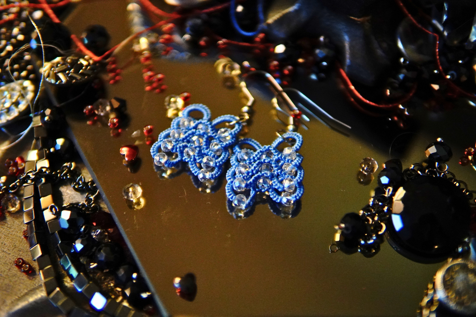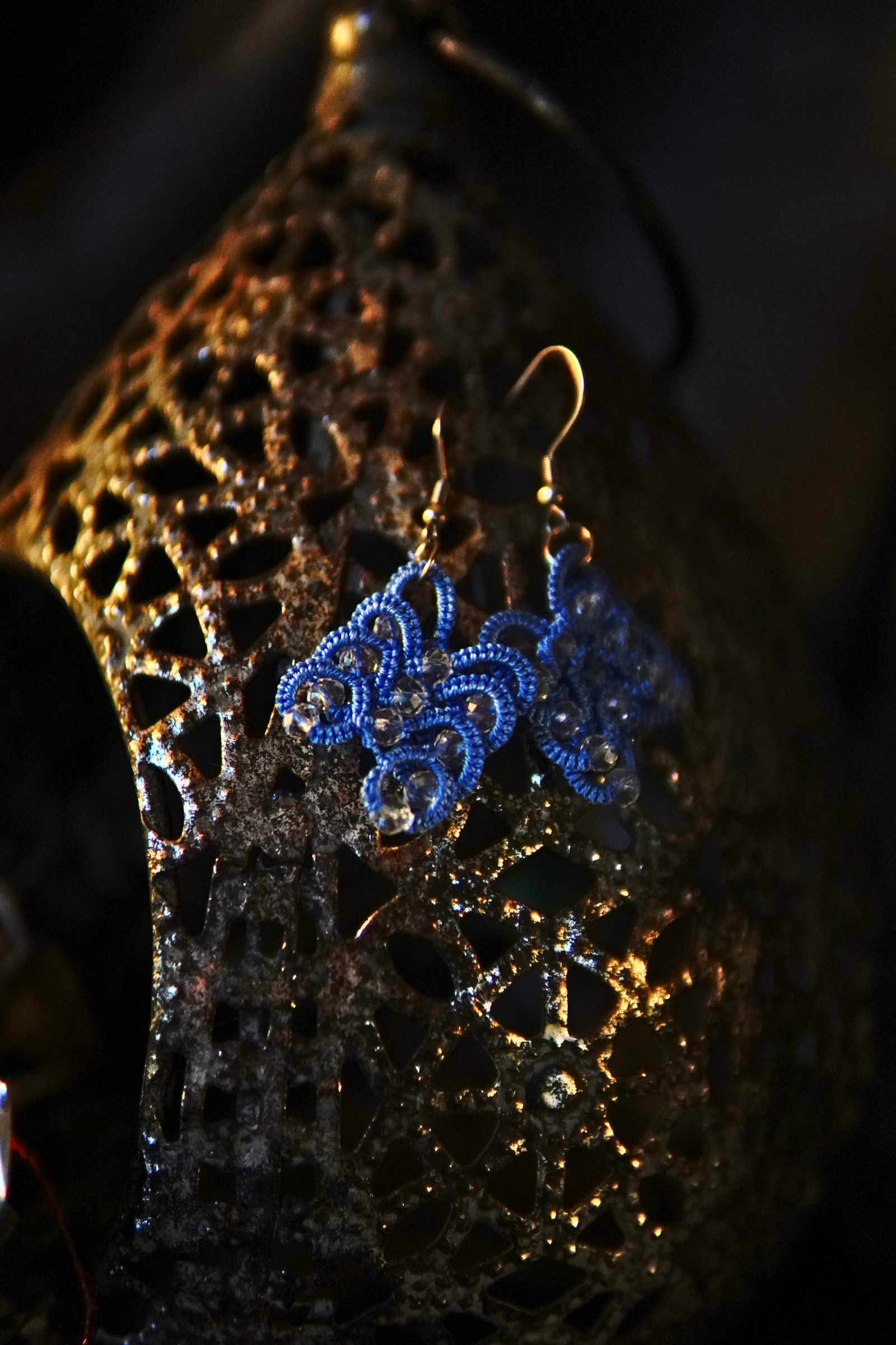 The earrings pictured are tatted in blue thread #608 with clear crystal rondelles. Each measures approx. 0.75” wide × 1” long.