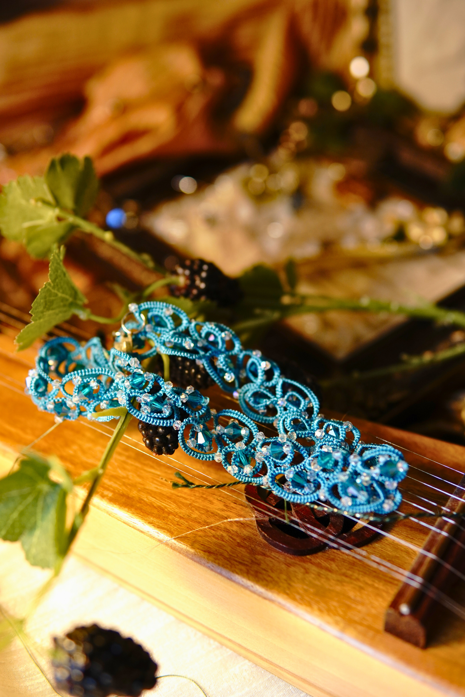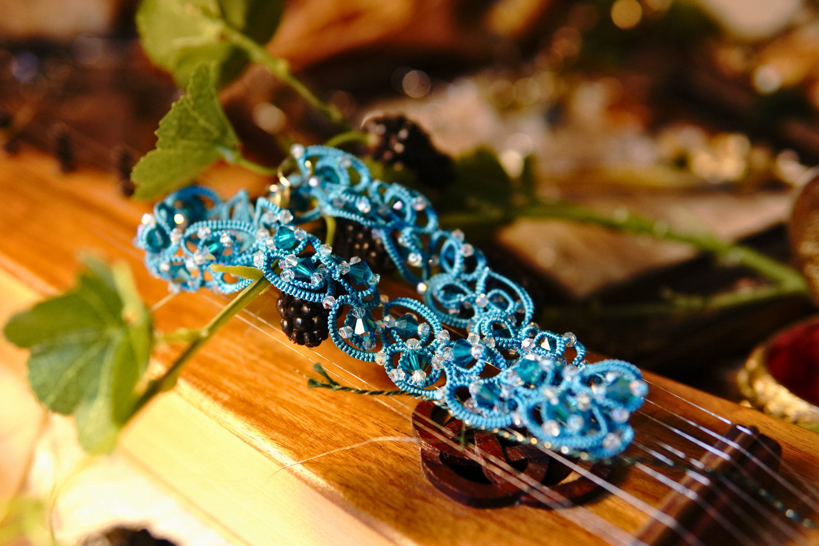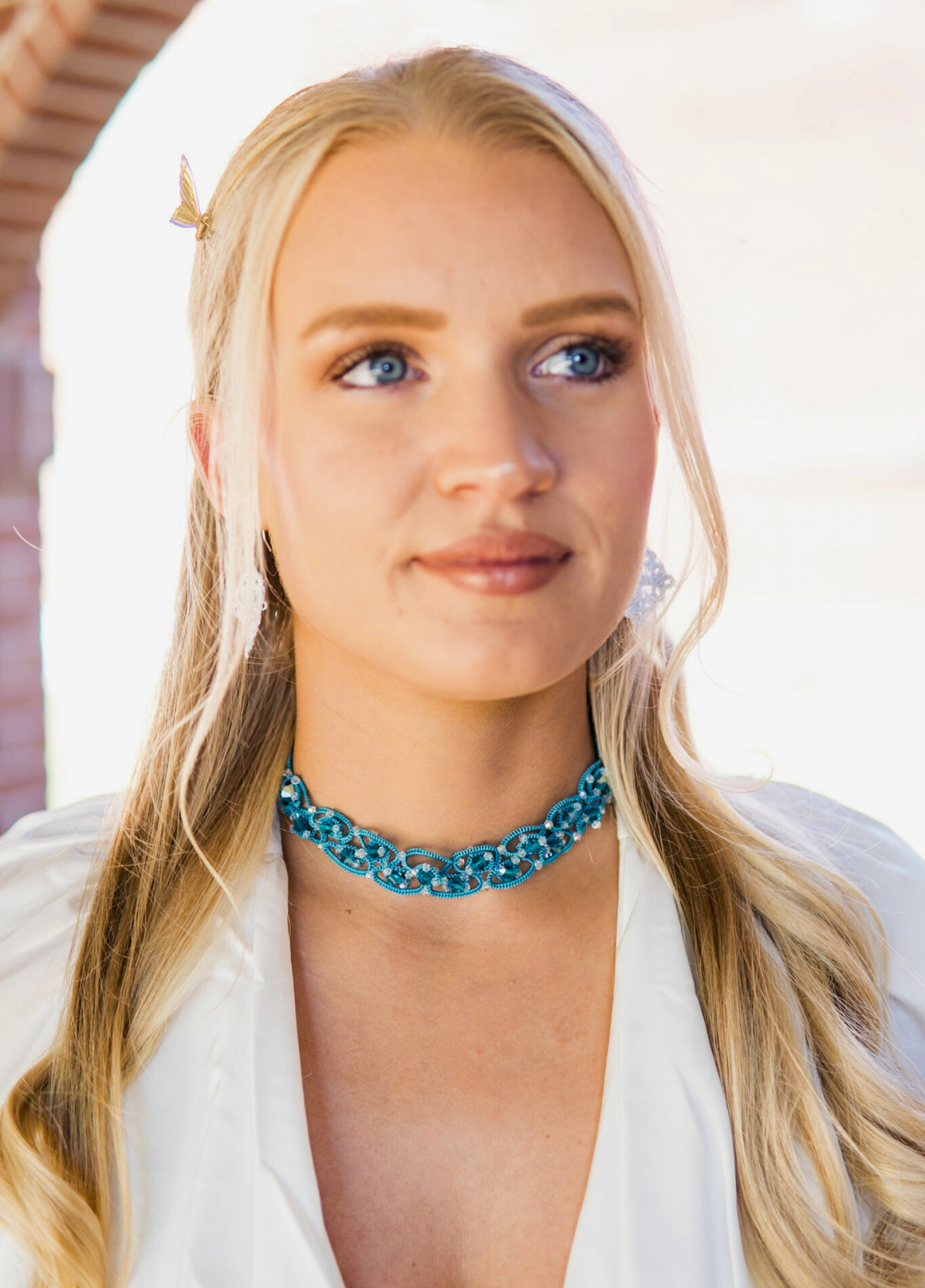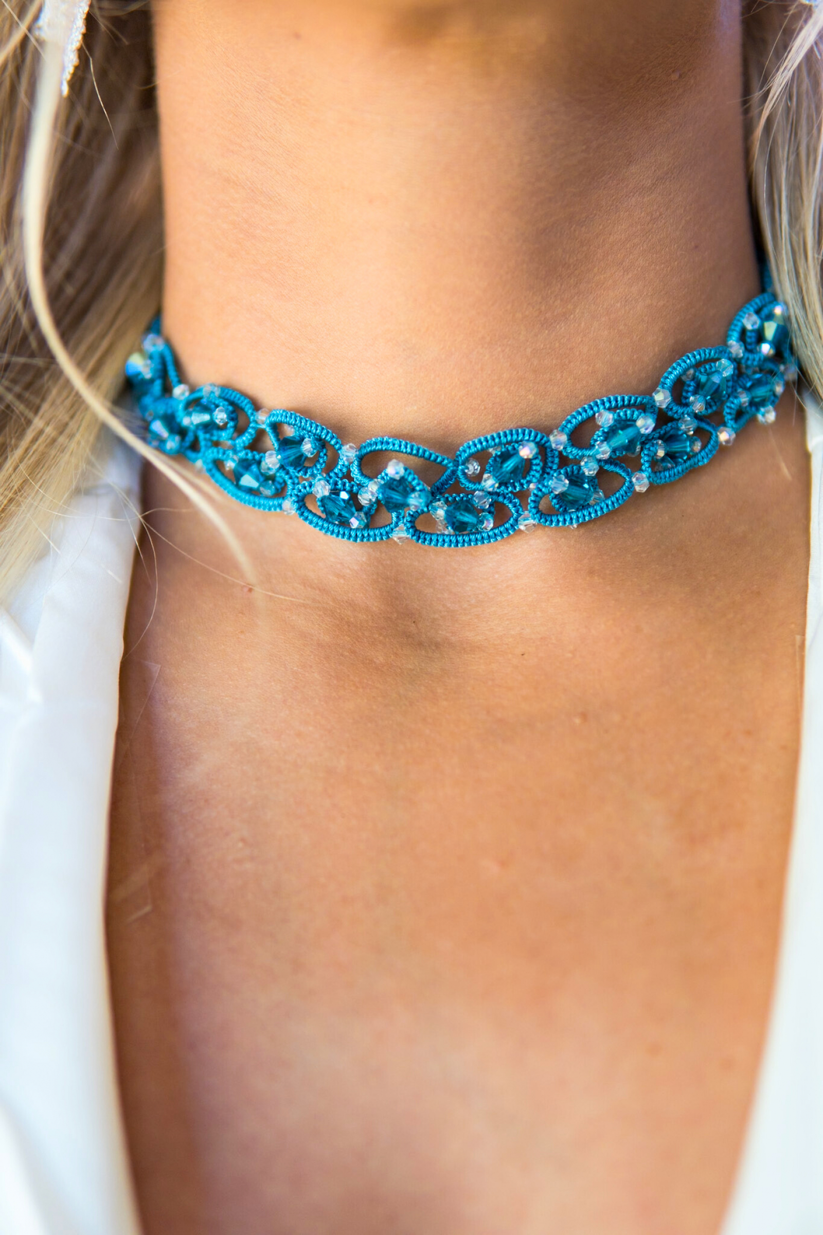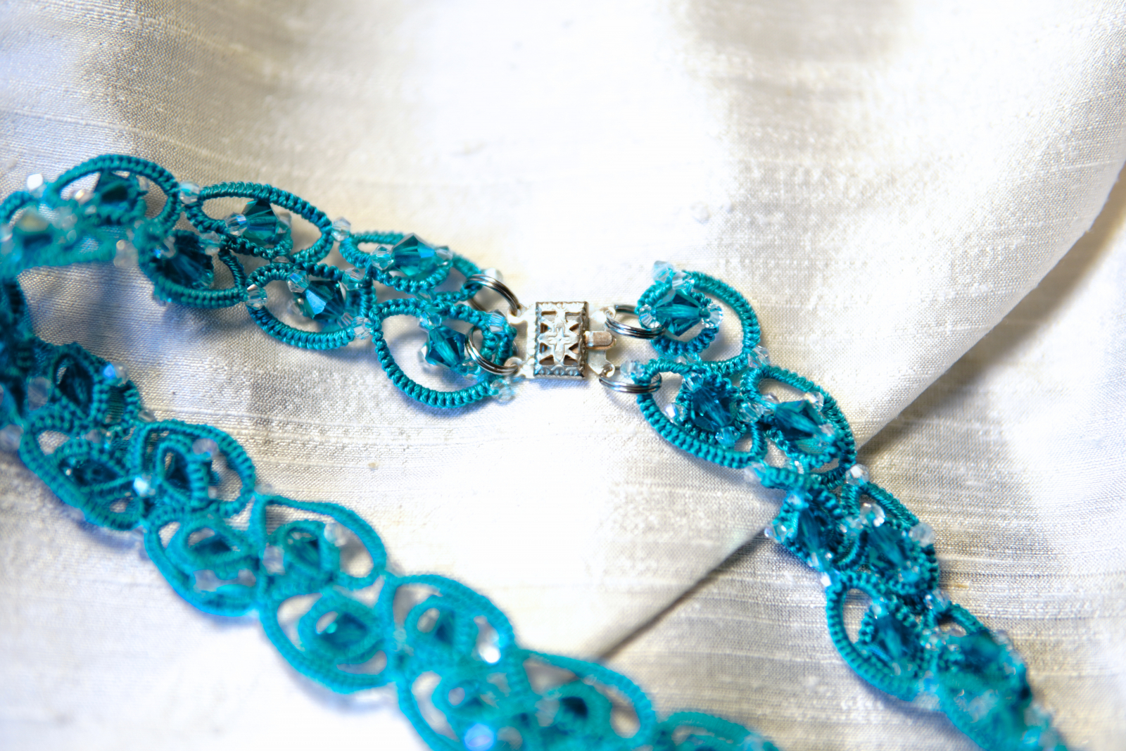Needle-tatted choker featuring Arianna polyester thread, with Swarovski gemstones incorporated into the piece as it was made, adding strength. Silverplated Box Clasp.
