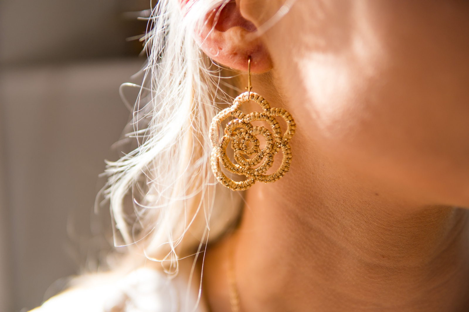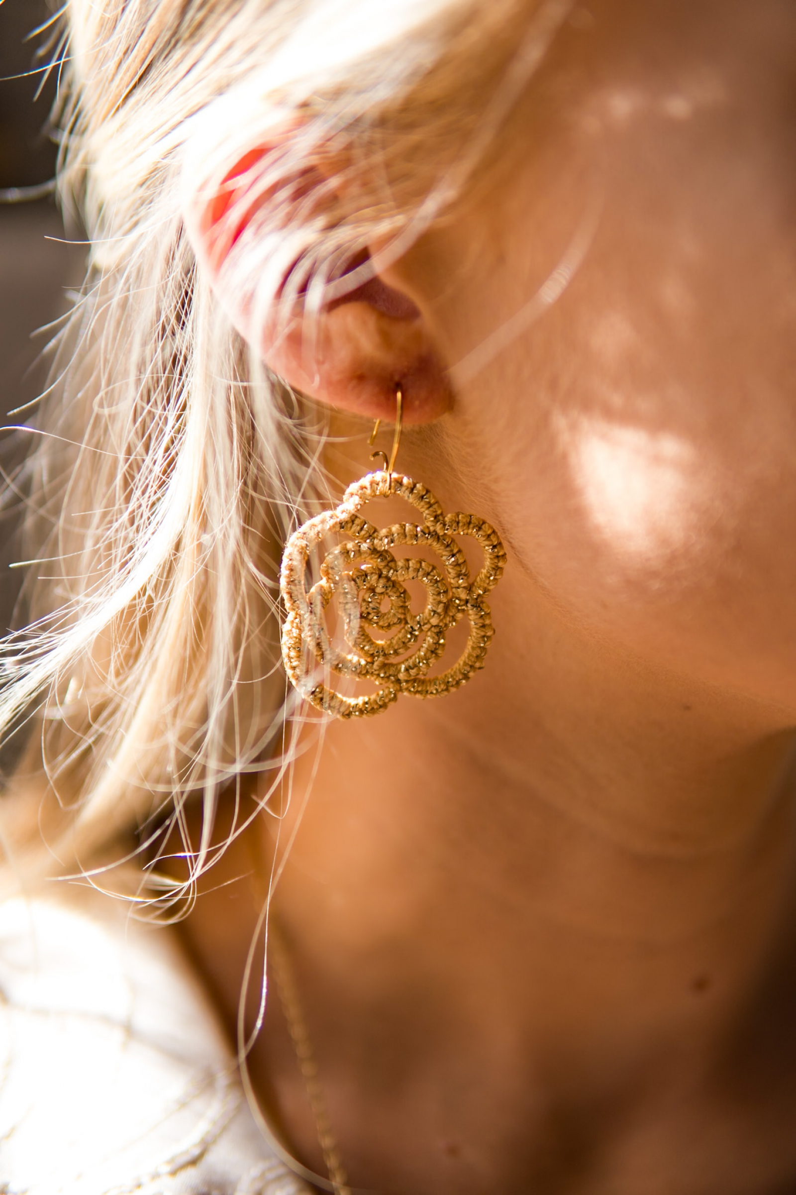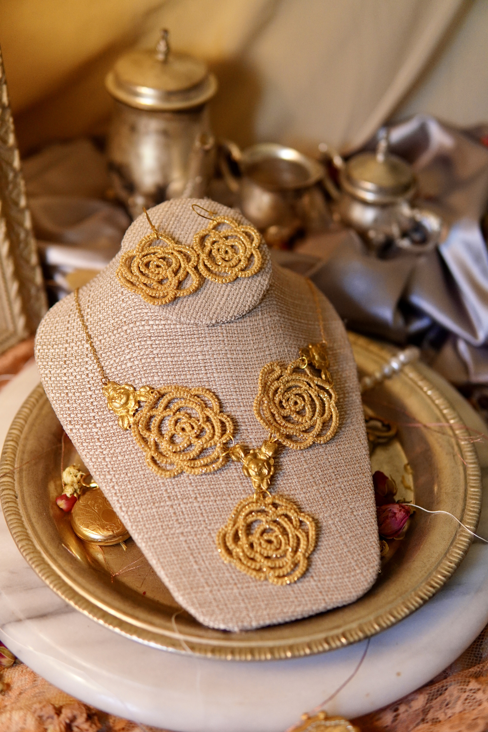 Tatted in rich golden thread and finished with vintage-style brass findings, the Golden Blooms earrings carry the quiet glow of sun-warmed parlors and well-loved heirloom letters. Each rose unfurls in soft spirals—gentle, timeless, and full of the warmth only memory can hold. These earrings feel like a moment paused in amber: elegant, sentimental, and endlessly wearable.