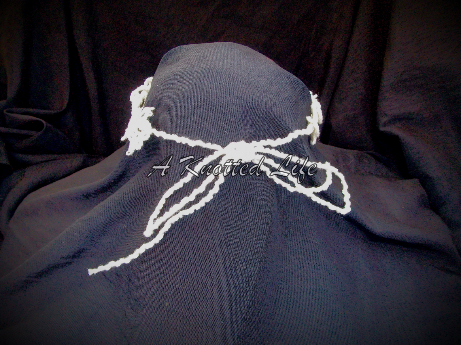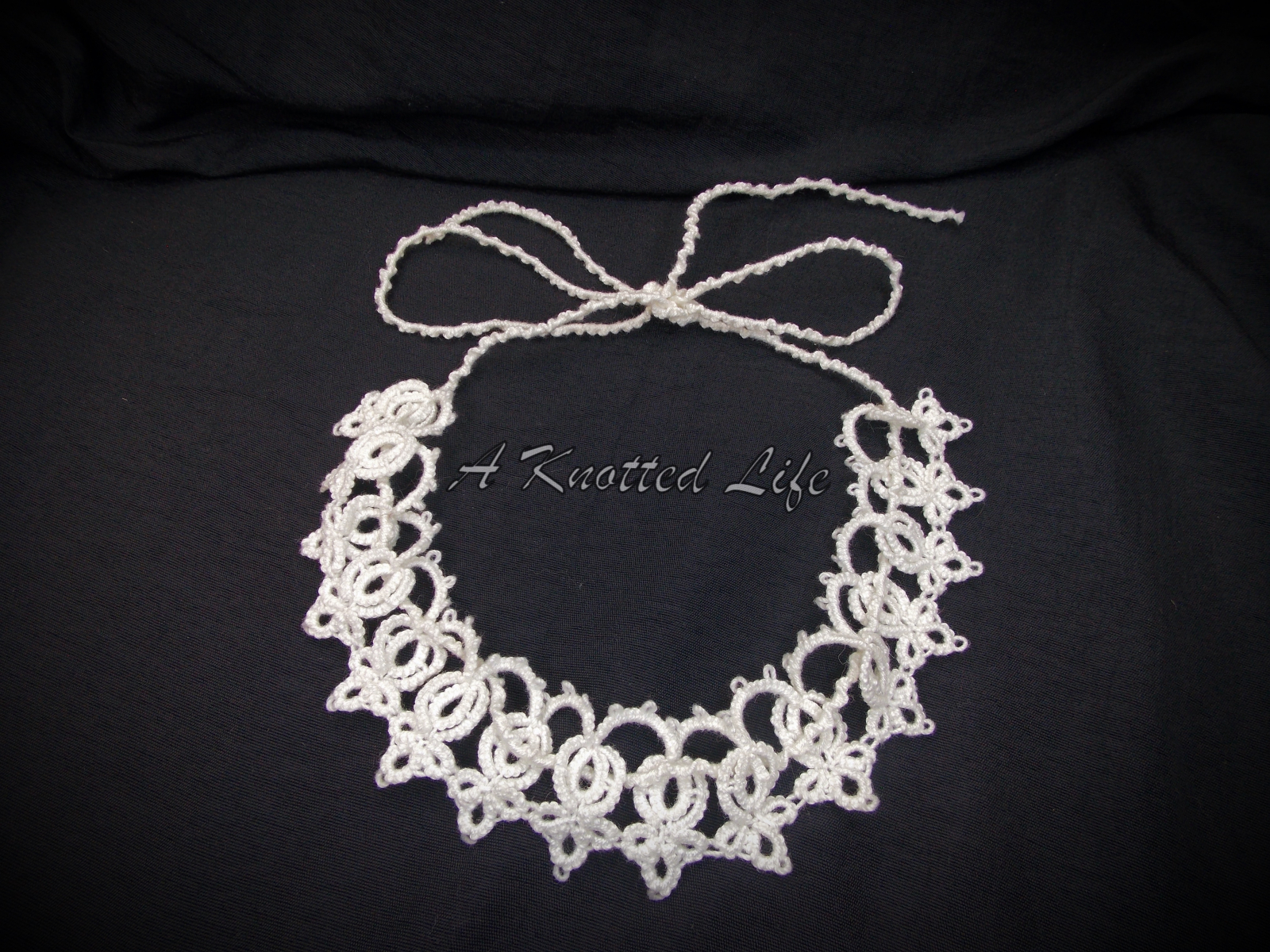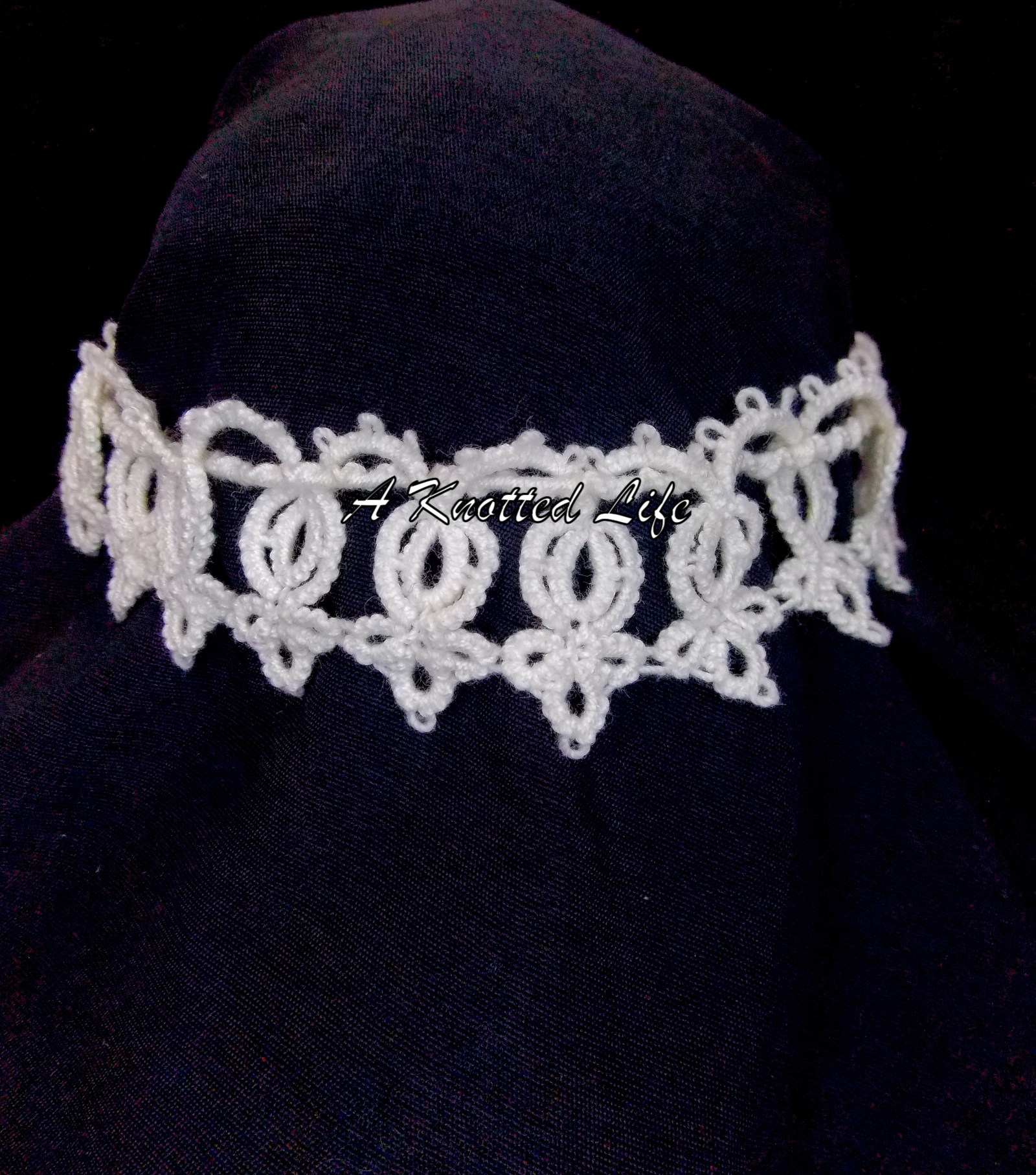 This choker is needle-tatted in crisp white cotton thread using the classic onion-ring lace motif. It ties comfortably at the neck with matching tatted cords, allowing an adjustable fit.