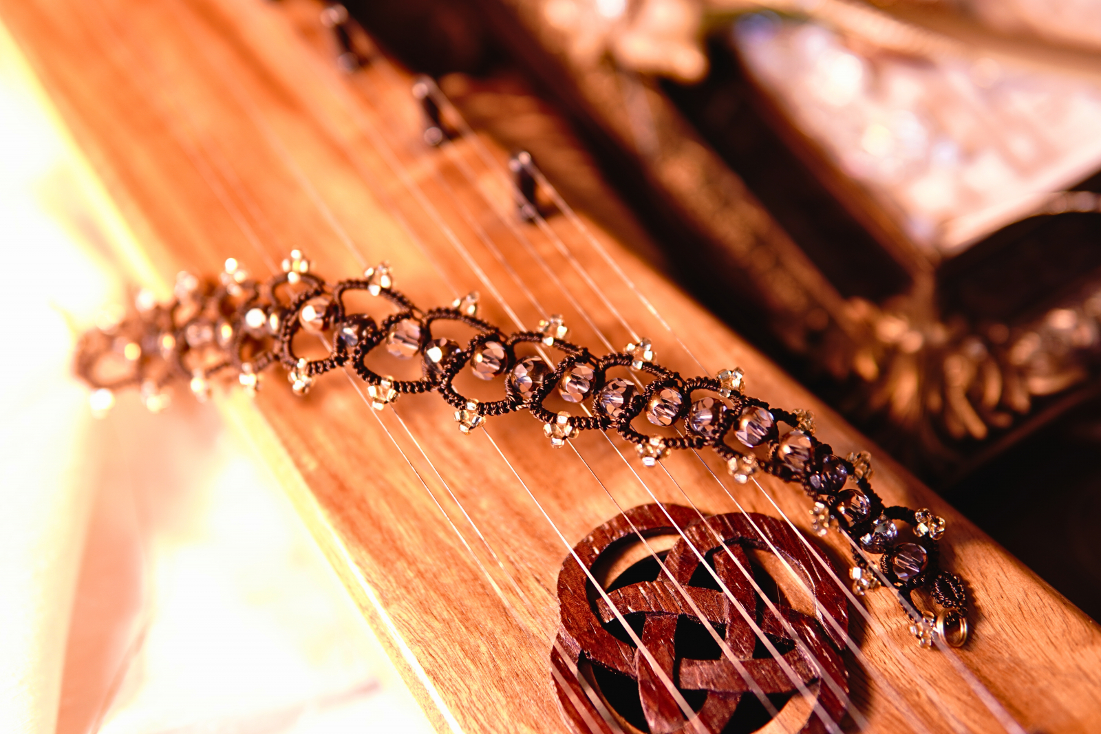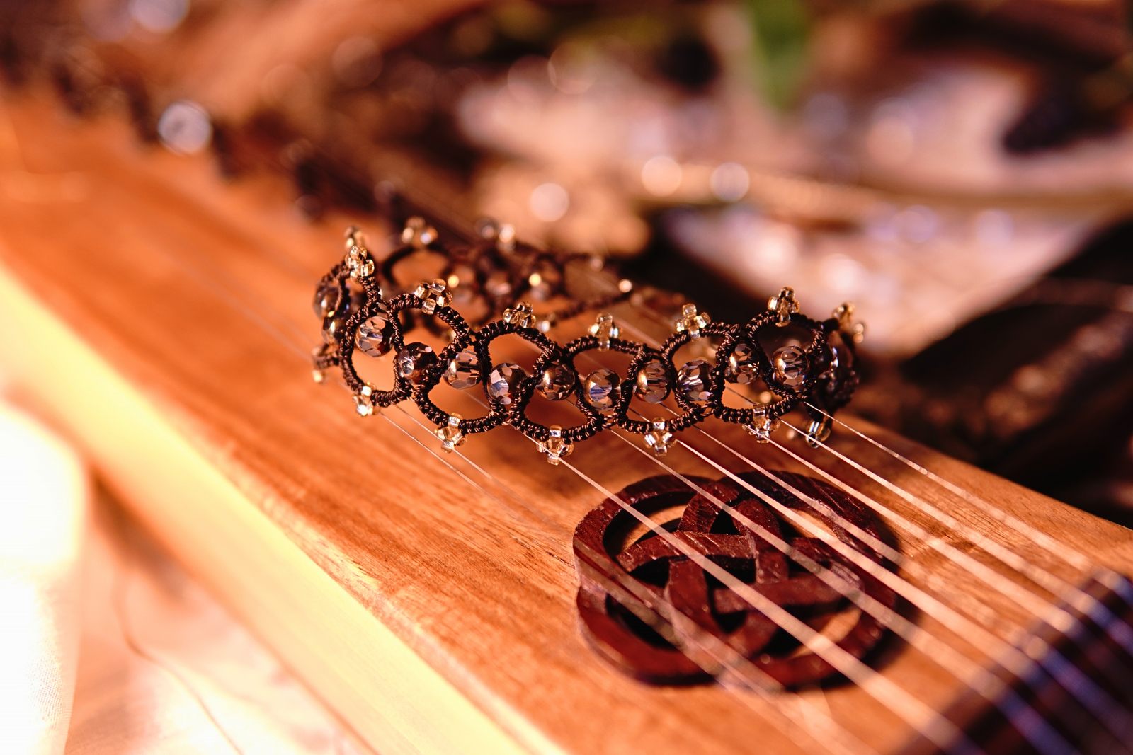 Rich brown tatting holds antique gold–tipped crystals, each bead a tiny ember suspended in a lattice of shadowed thread. The effect is soft but steady—like a rootlight shimmering beneath moss, or a hidden lantern waiting in the hush of the deep woods.