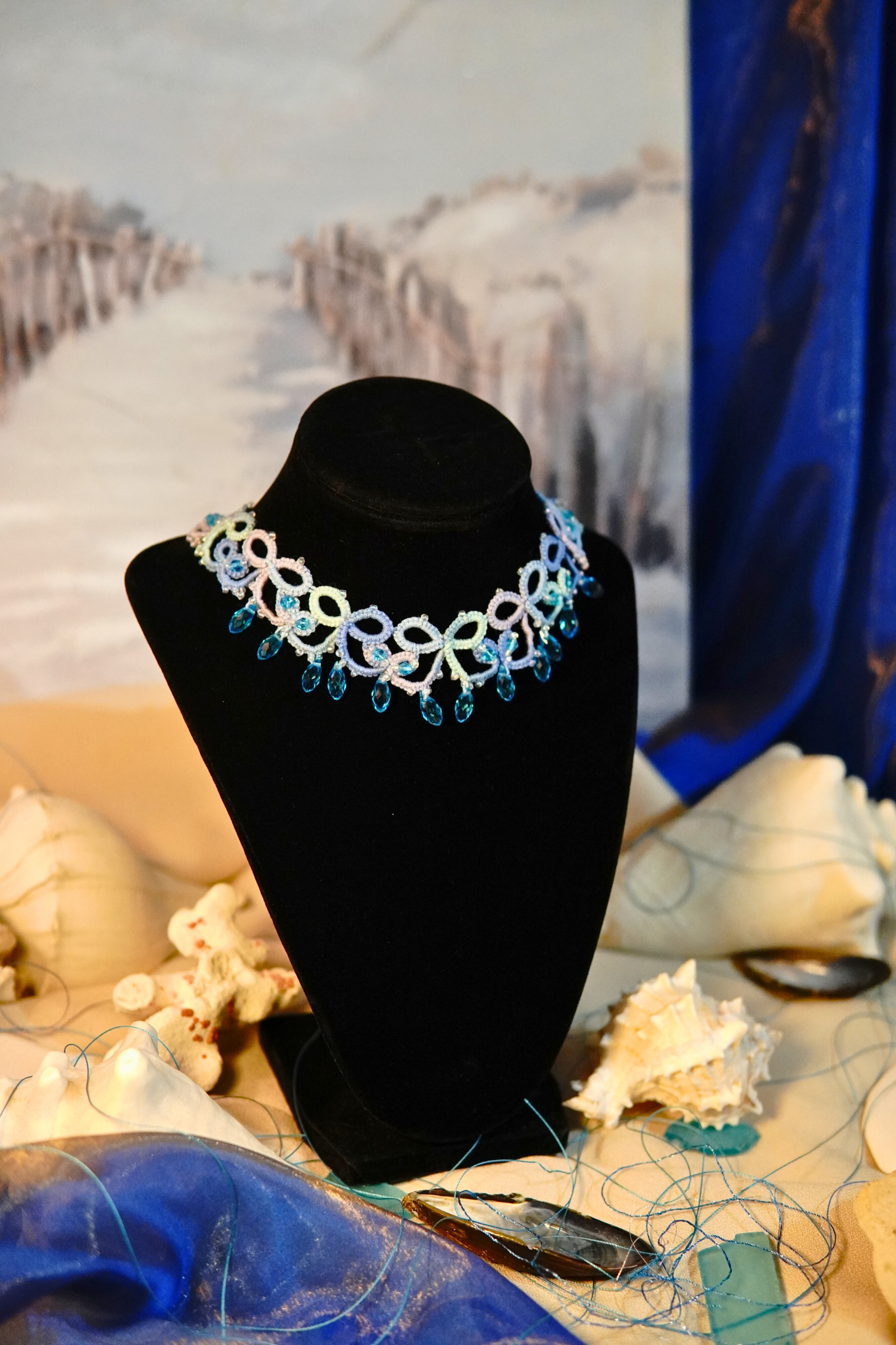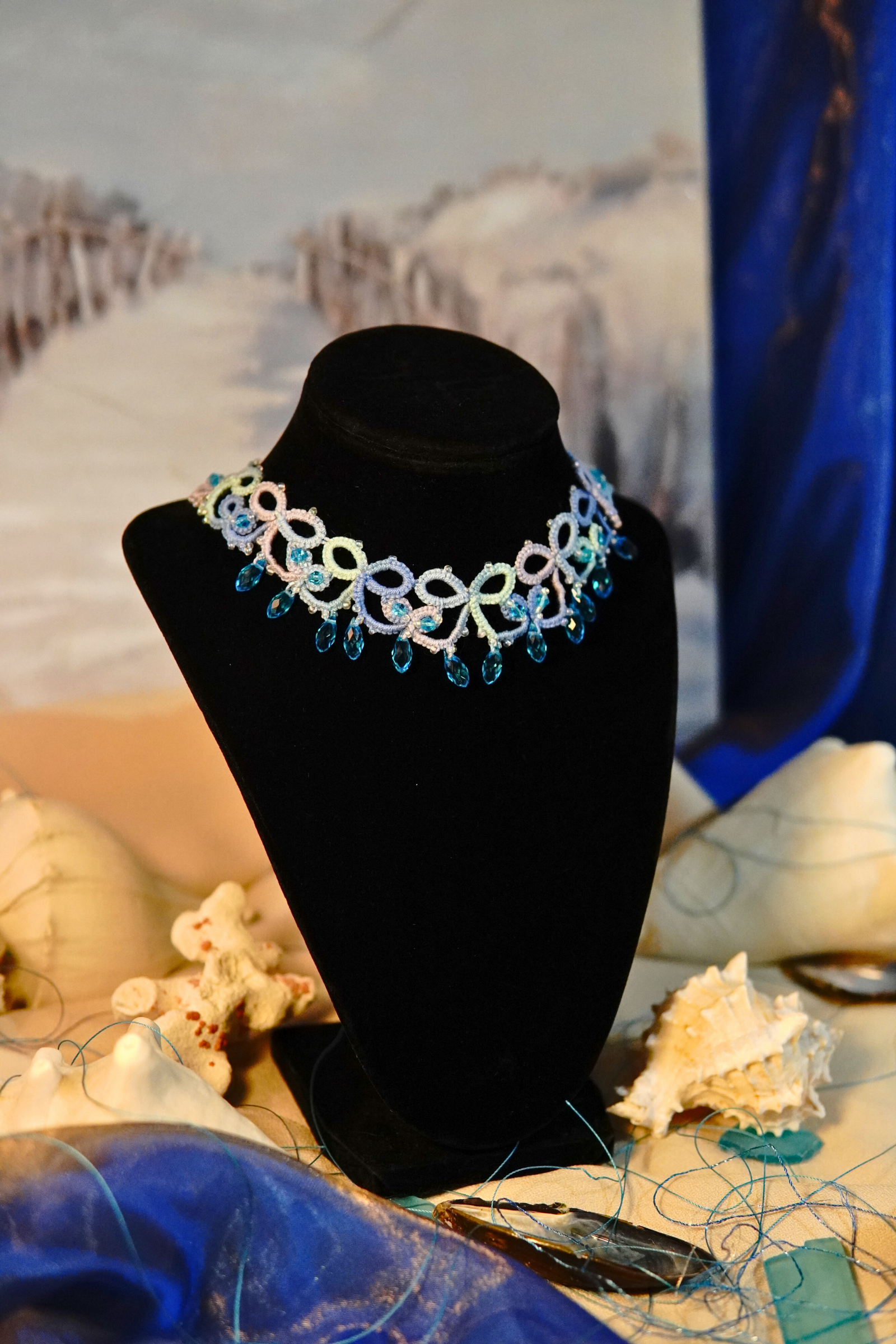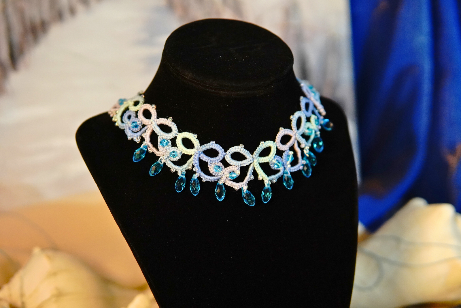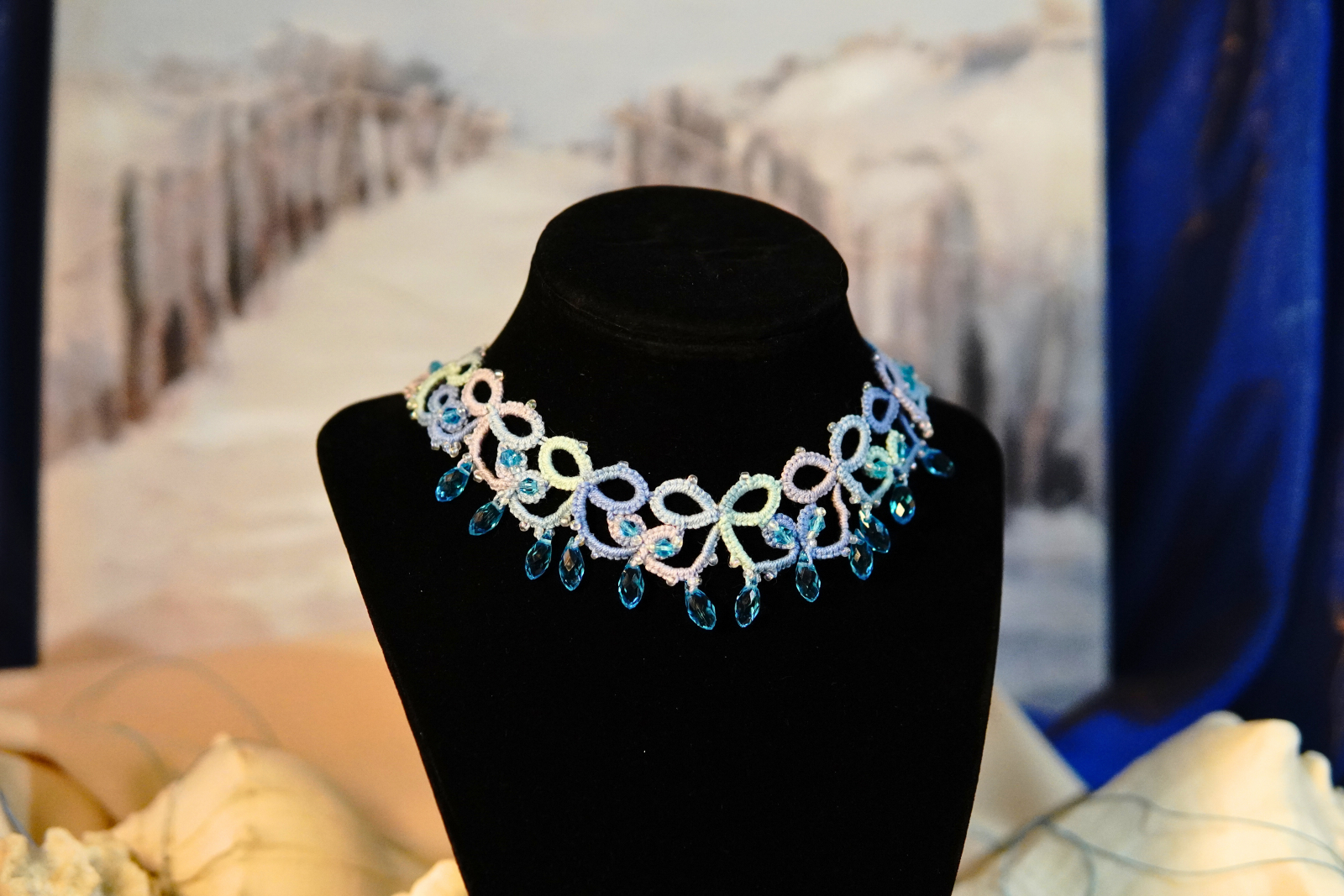 Tatted in ocean-washed hues of variegated cotton, this necklace shimmers with multifaceted aqua teardrops and bicone beads - each one catching the light like scattered rain. Aurora borealis seed beads glint like sea spray. The silver lobster clasp and adjustable chain allow a length of 17 to 20 inches.