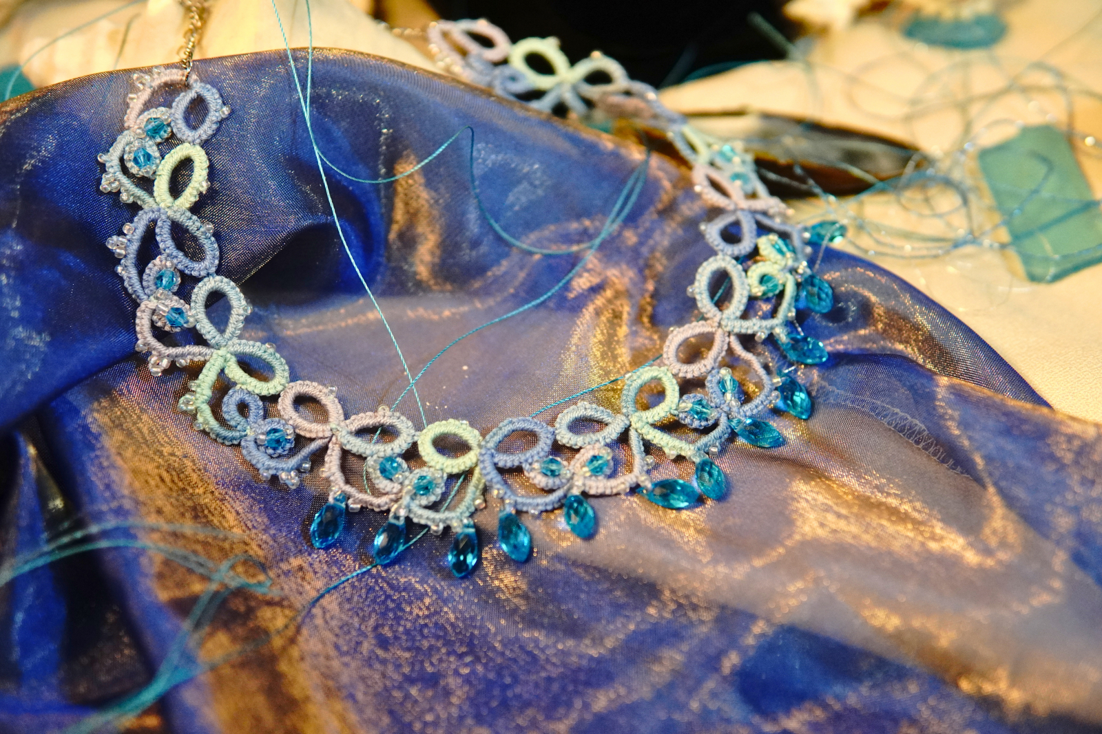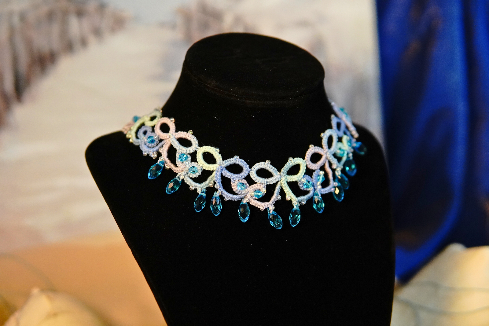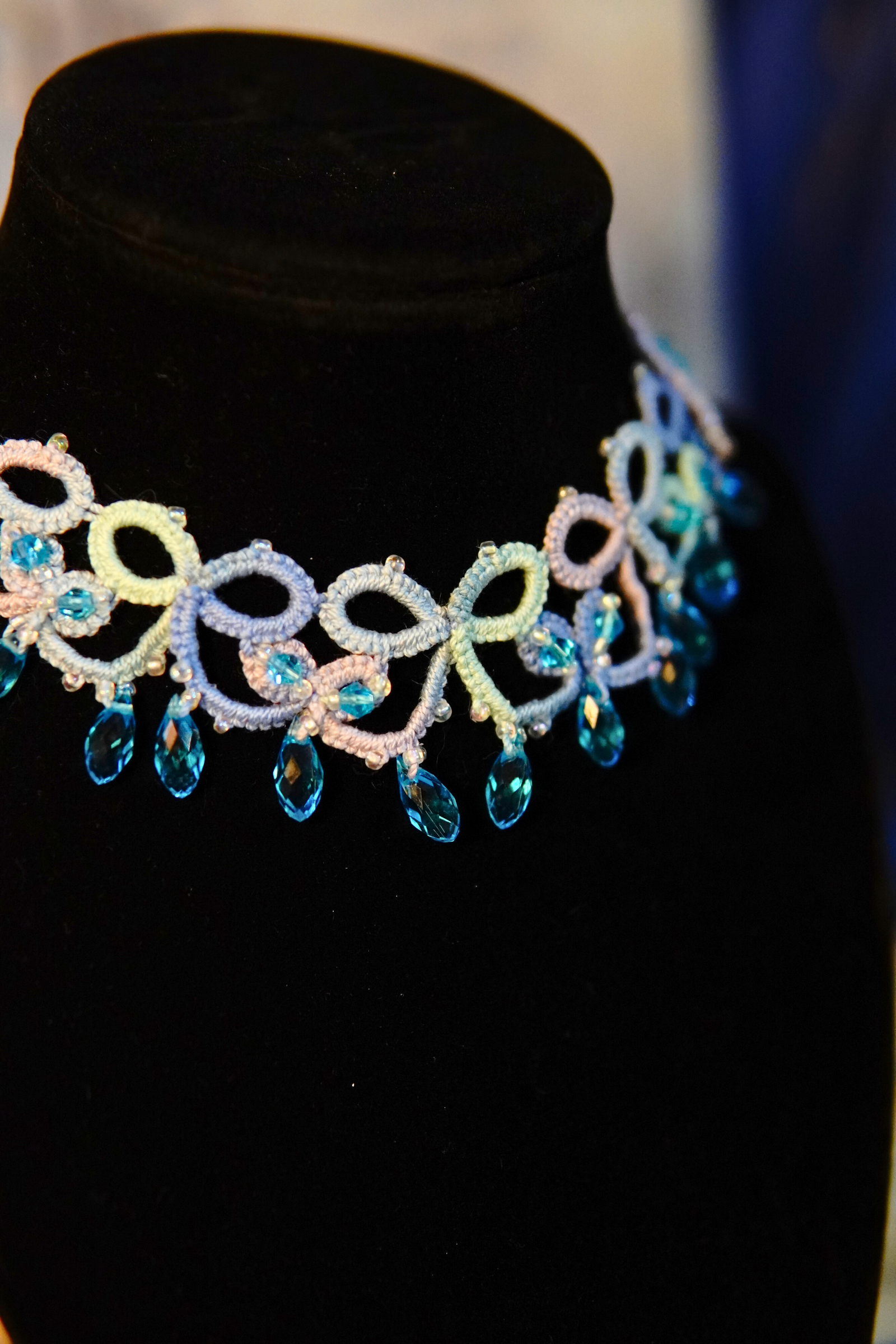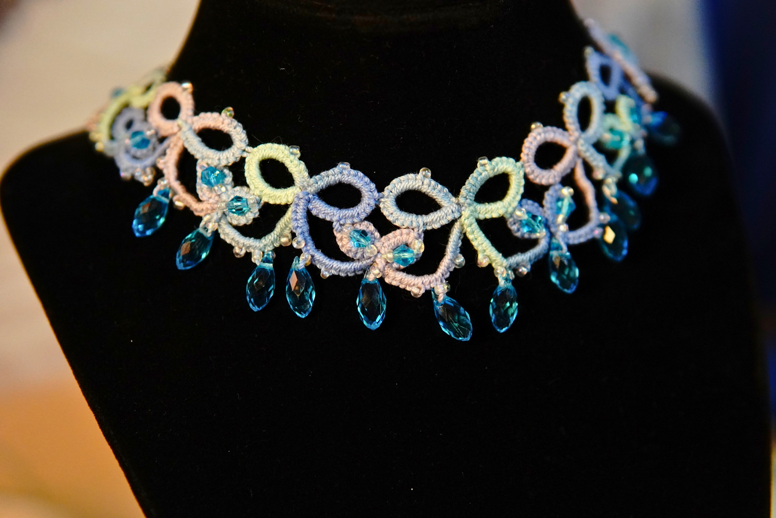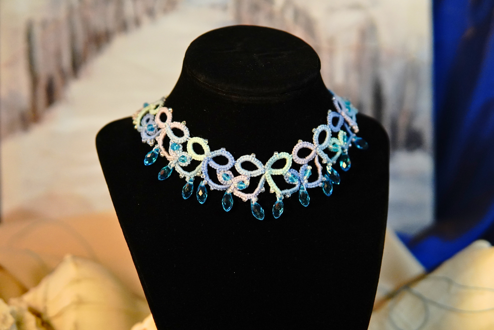 Tatted in ocean-washed hues of variegated cotton, this necklace shimmers with multifaceted aqua teardrops and bicone beads - each one catching the light like scattered rain. Aurora borealis seed beads glint like sea spray. The silver lobster clasp and adjustable chain allow a length of 17 to 20 inches.