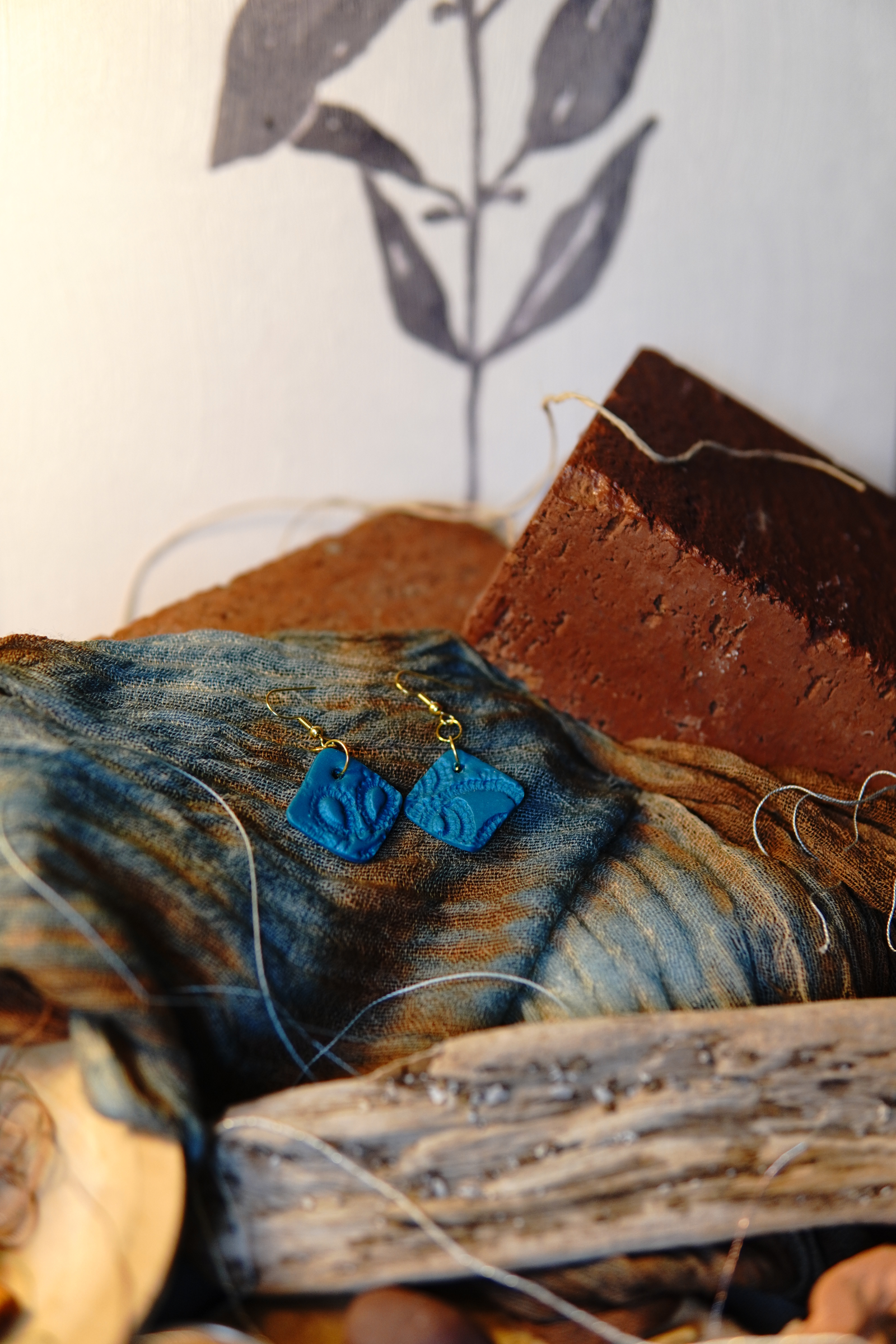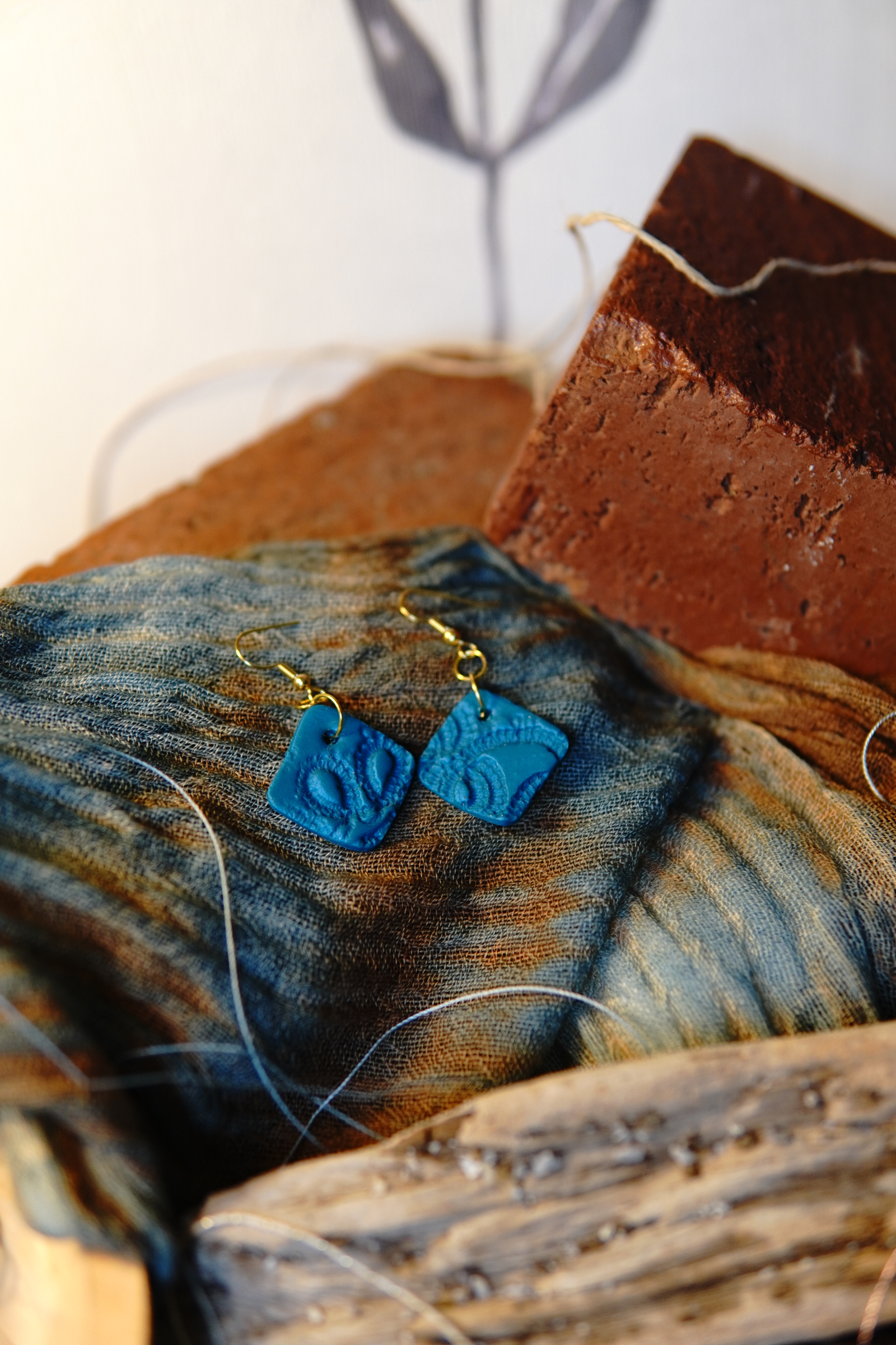 These Seafoam Impressions earrings are created by pressing hand-tatted lace into softly tinted seafoam clay, capturing each intricate loop and curve in dimensional relief. Once cured, the lace is lifted away, leaving a permanent impression of delicate texture transformed into sculptural form.