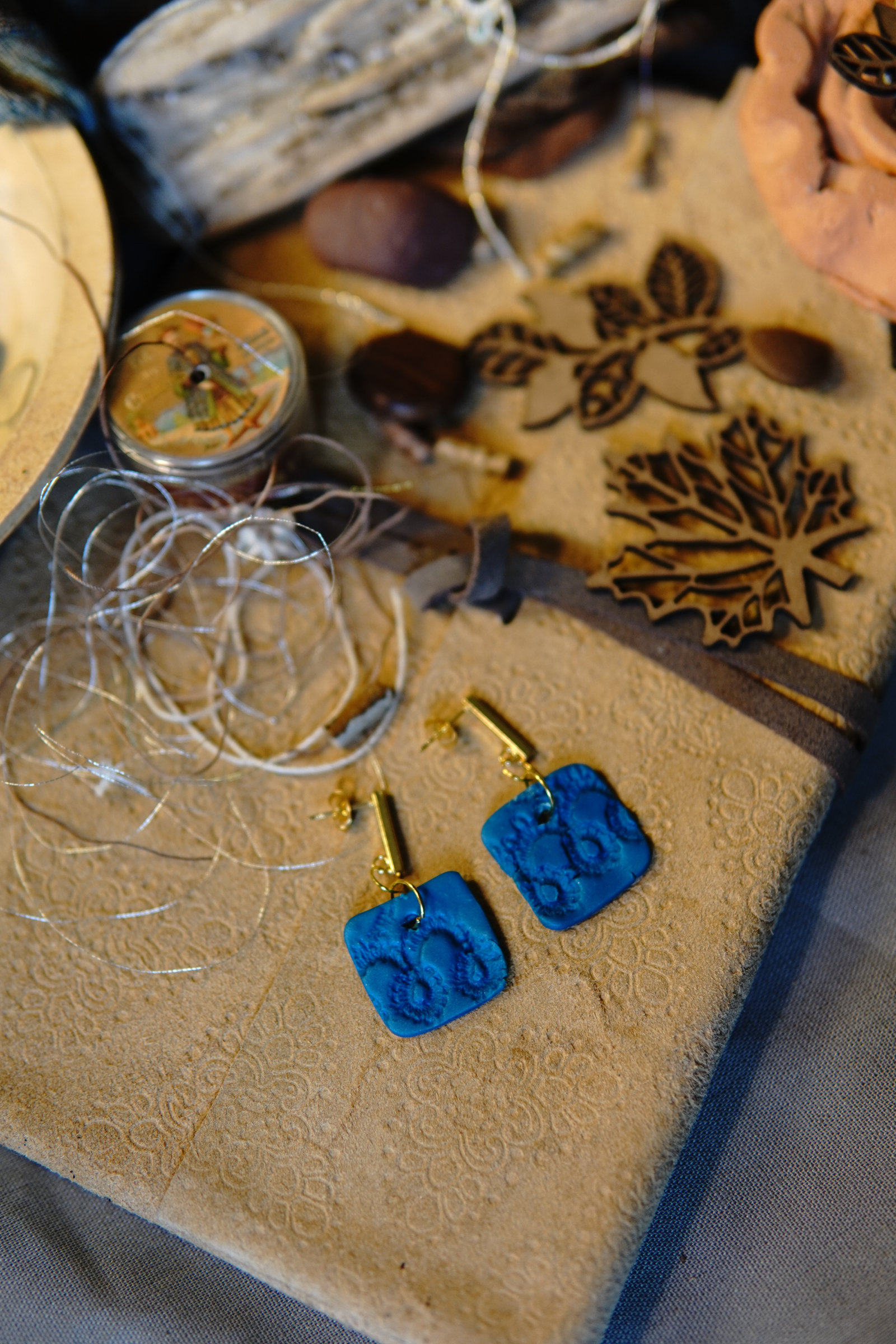 These Seafoam Impressions earrings are created by pressing hand-tatted lace into softly tinted seafoam clay, capturing every intricate loop and curve in dimensional relief. Once cured, the lace is lifted away, leaving behind a permanent imprint of delicate thread transformed into sculptural form.