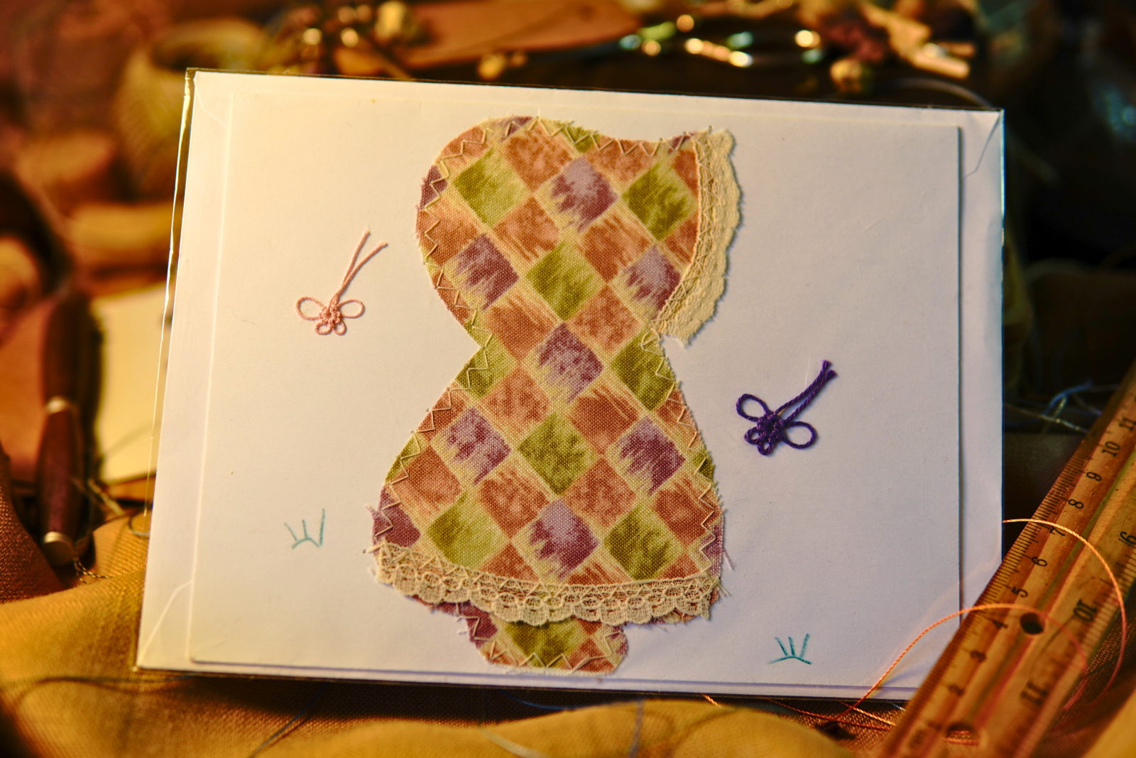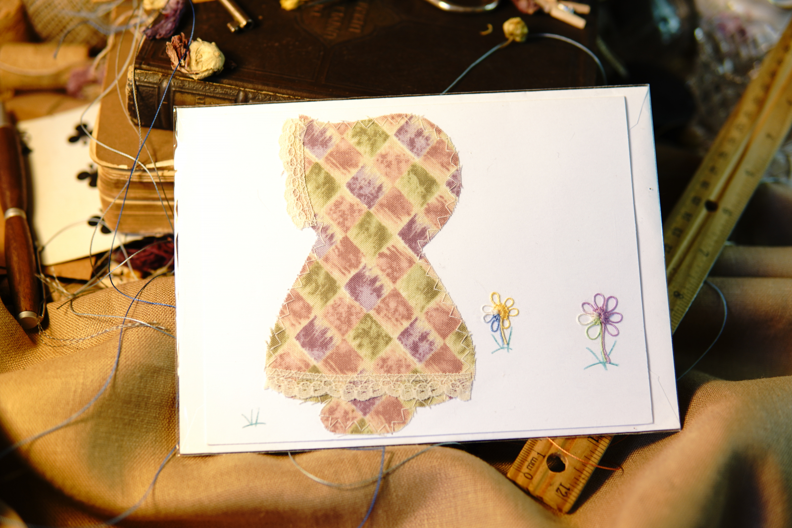 Bring a touch of soft nostalgia to your correspondence with these handmade Sunbonnet notecards. Each card features a fabric appliqué silhouette carefully sewn onto the card front, edged with delicate lace trim. Tiny tatted butterflies dance around the figure, adding a gentle thread-crafted detail unique to the Threadmarked line.