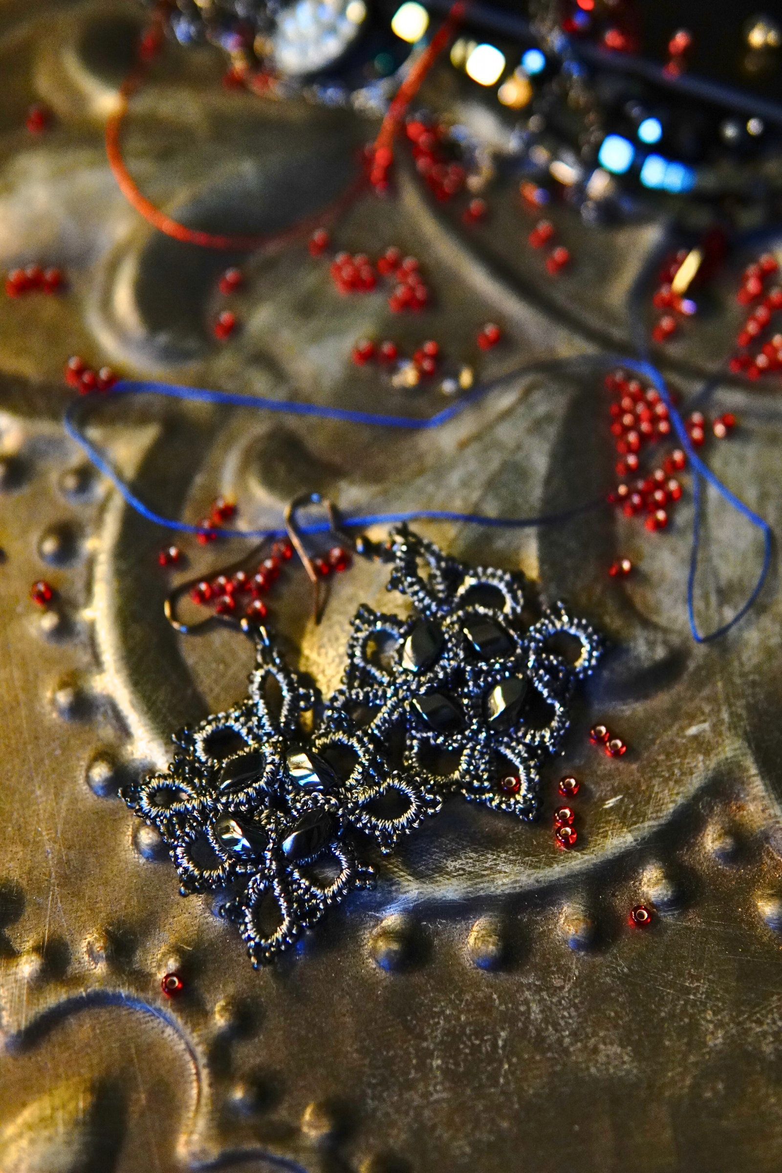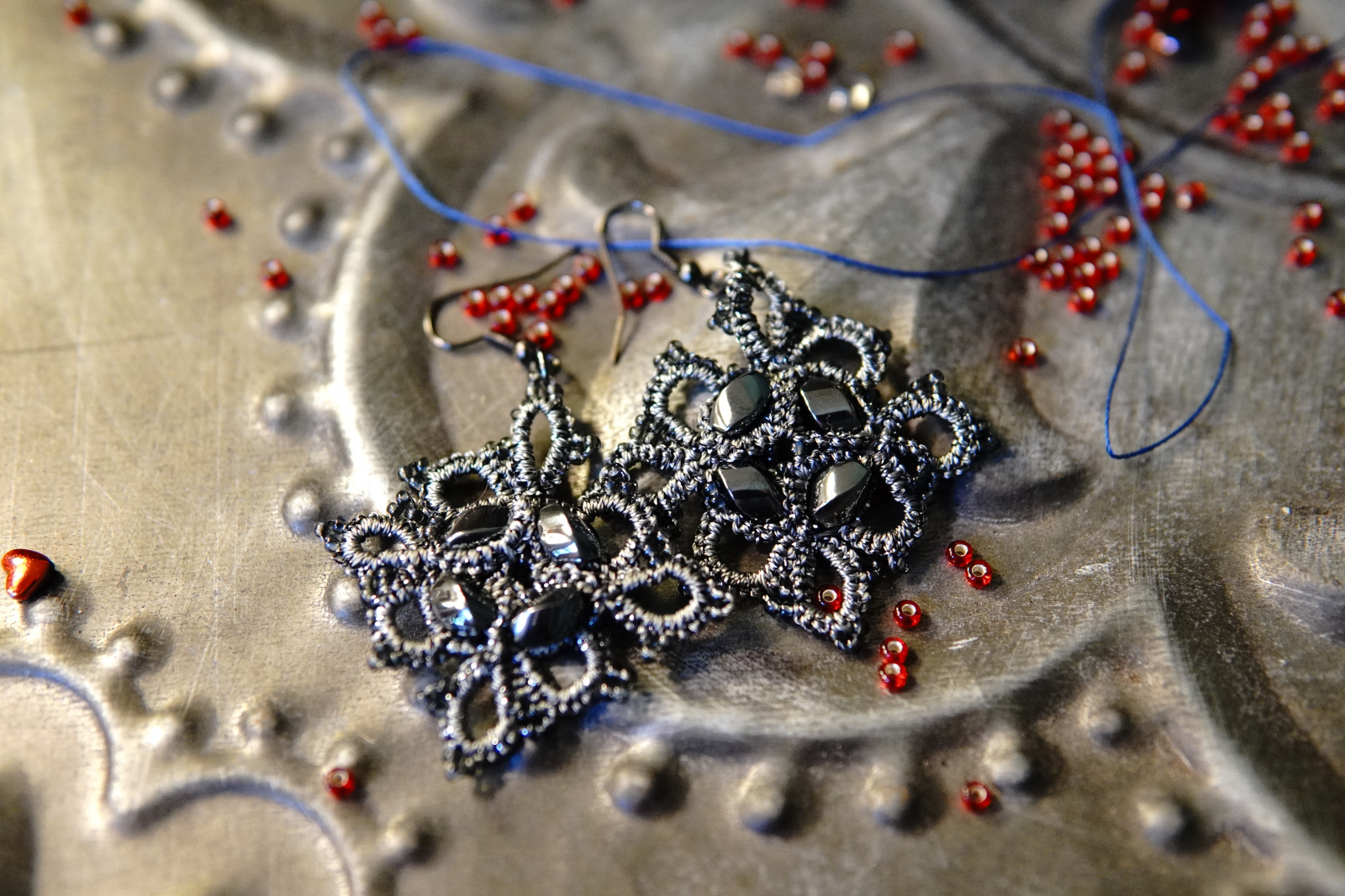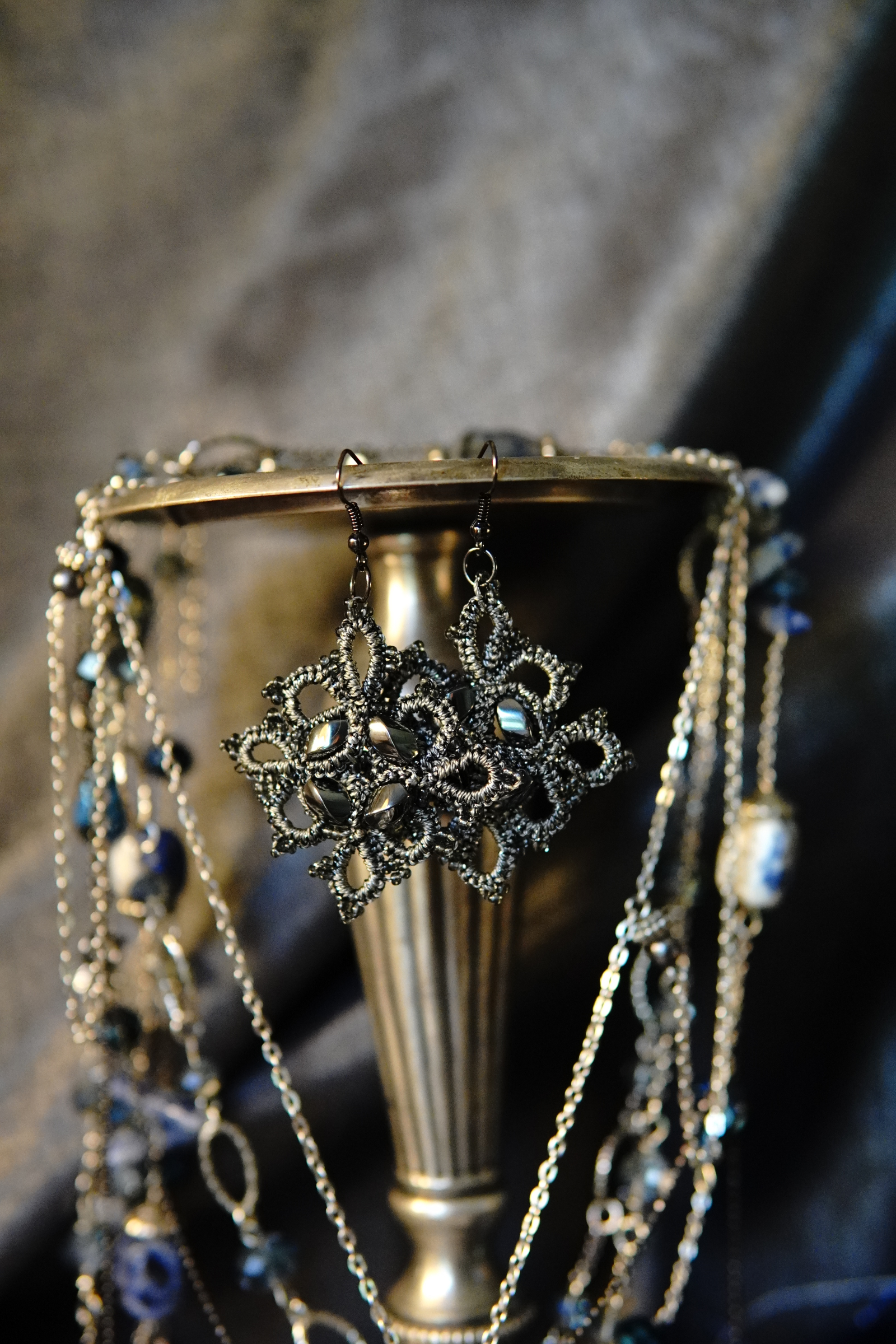 Grace etched in iron and thread, Steelwoven Grace walks the line between delicacy and resilience. Storm-grey tatting forms a lattice of interlocked rings, each cradling the weight and shimmer of hematite. These are not fragile. They are the still points of a storm held within.