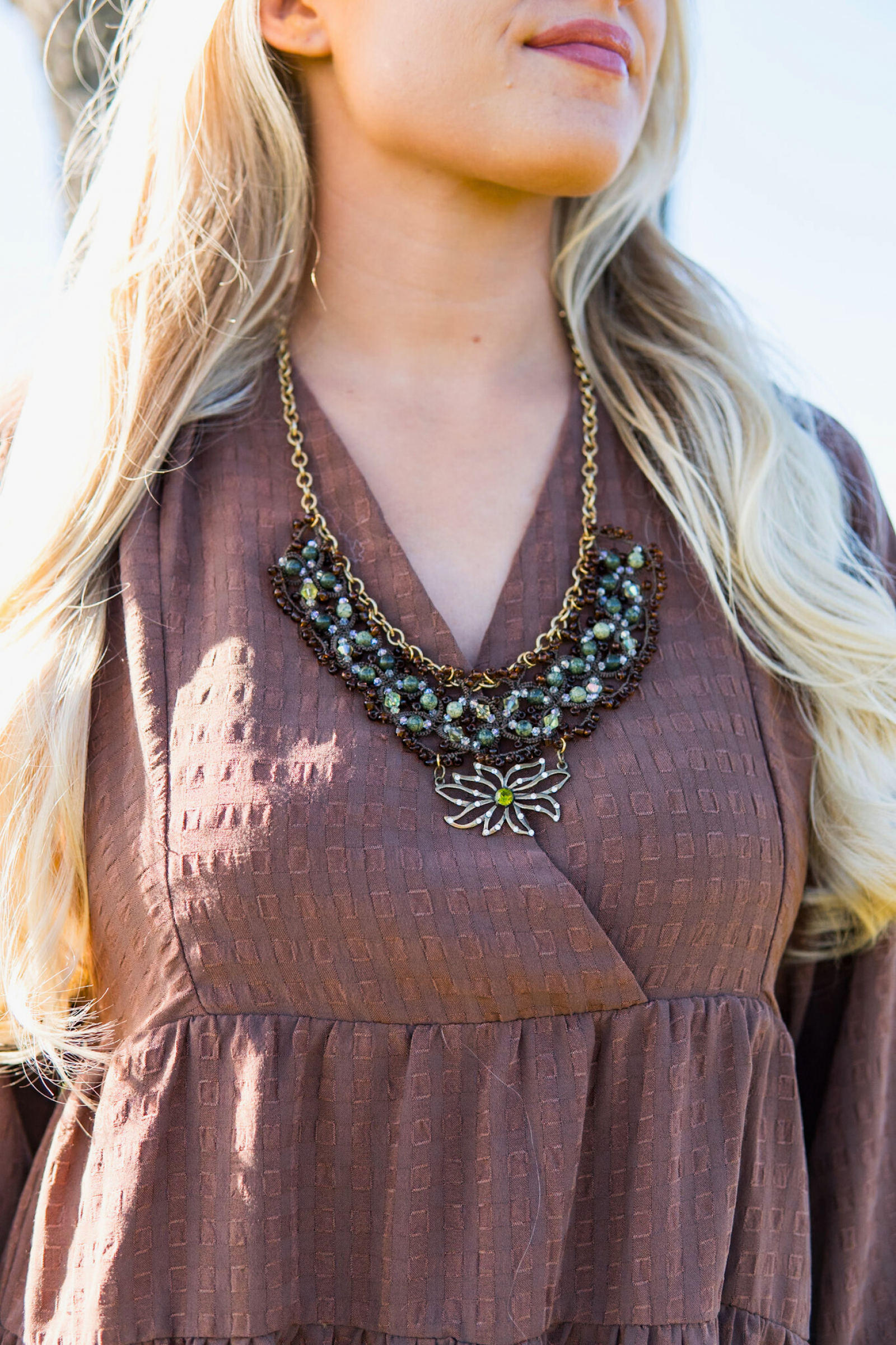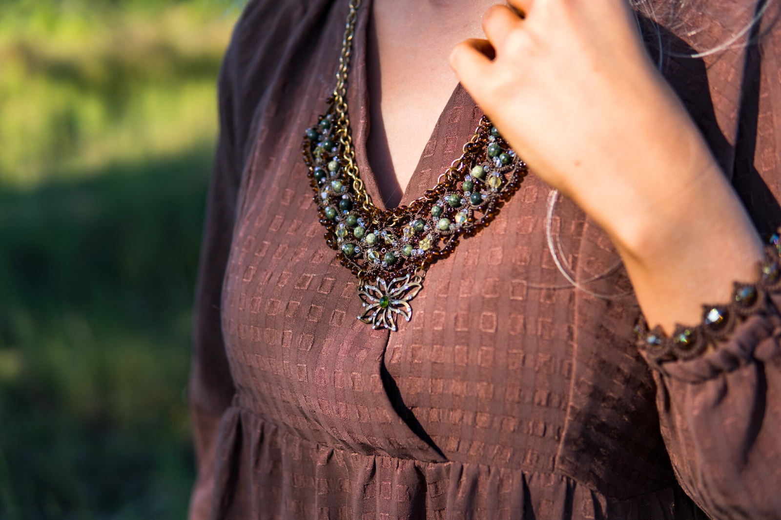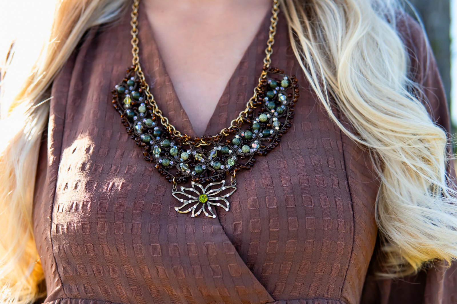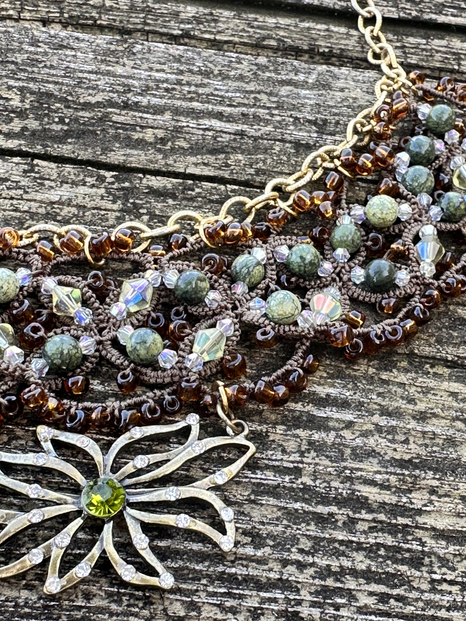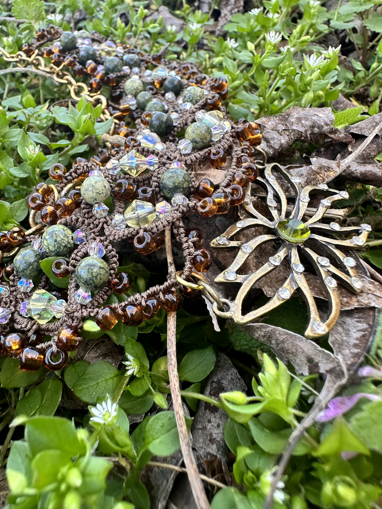 Sunlight on the Woodland Floor is an homage to that hidden world. Rich brown thread holds the memory of earth and bark. Golden beads echo scattered light. Green serpentine and peridot carry the breath of new life rising from deep roots. Crystals shimmer like dew at dawn, and the bloom at its heart marks the moment light finds the forest.