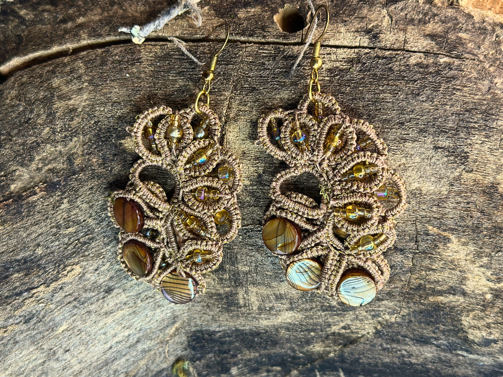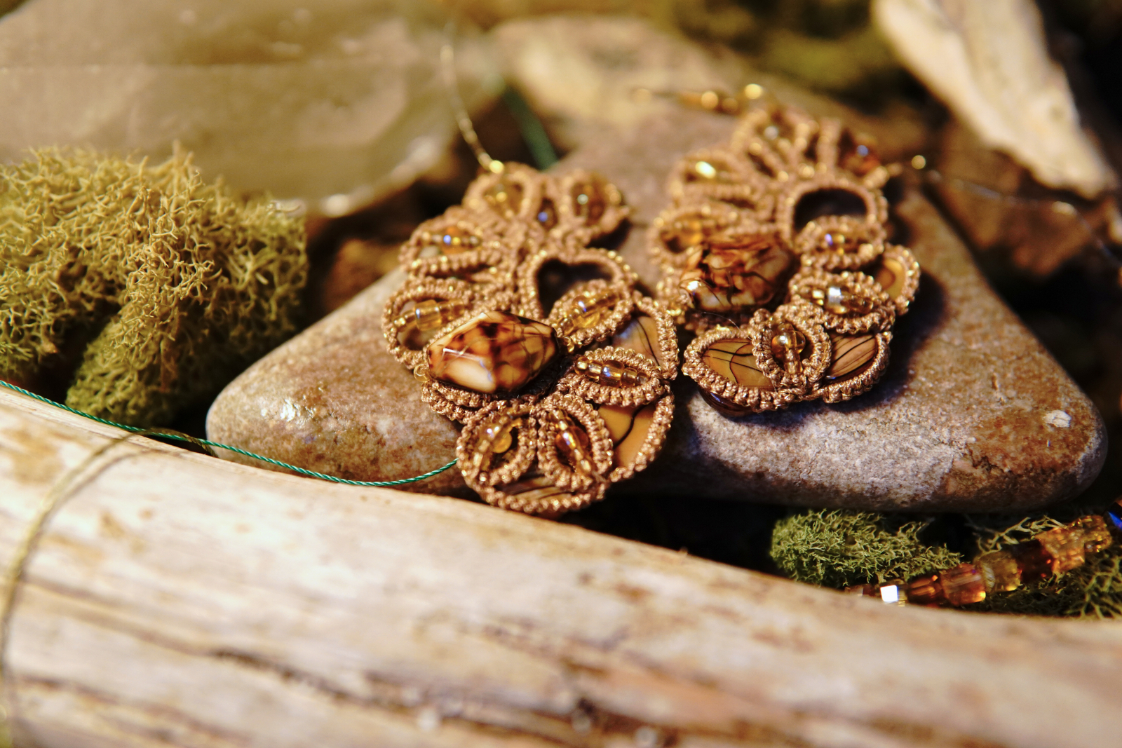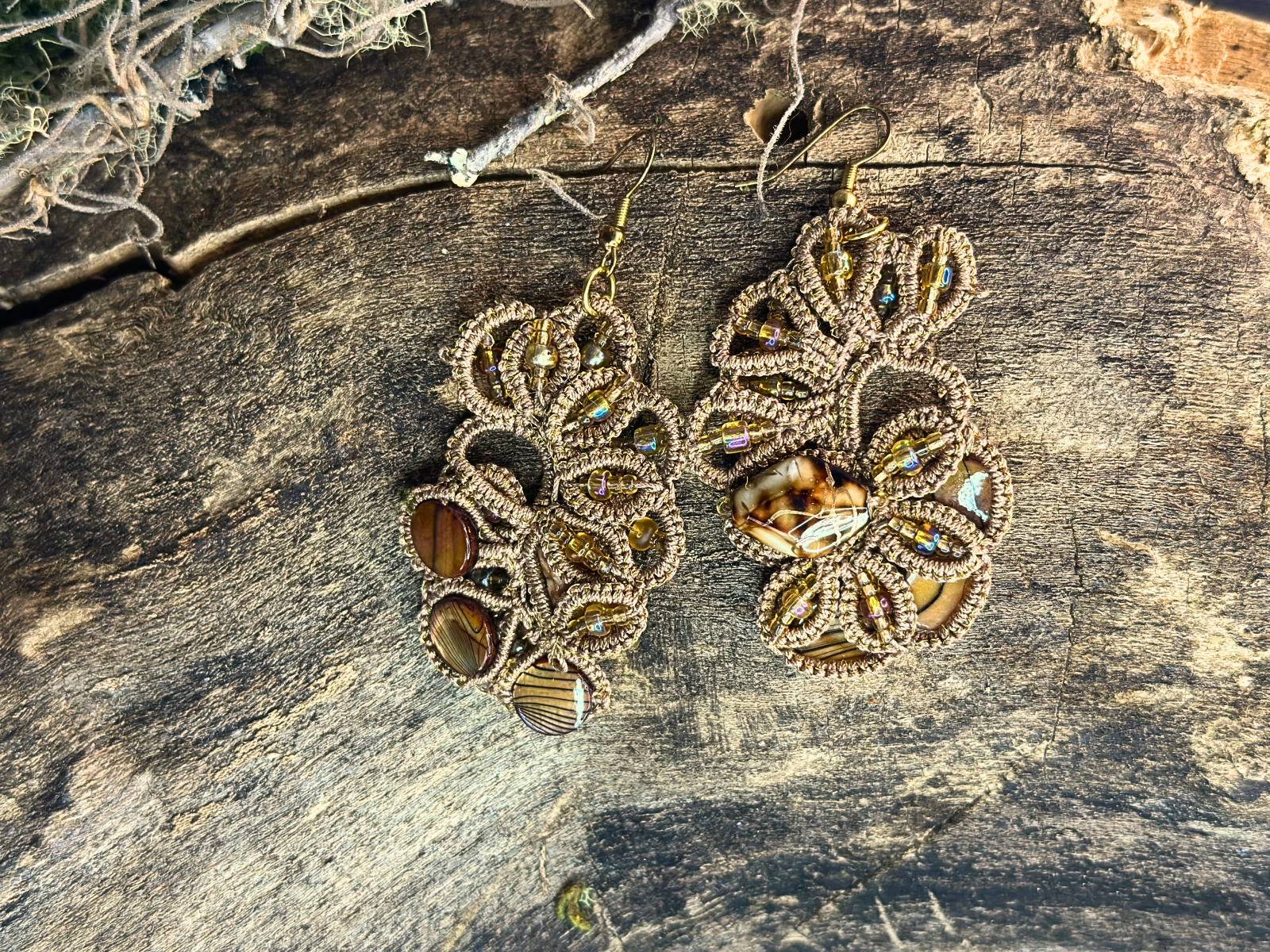 Golden light filters through autumn’s canopy, catching on leaves not yet fallen and casting long, warm shadows on the forest floor. These earrings echo that fleeting moment—tatted in soft brown thread accented with golden filament, strung with beads like flickers of sun. Larger plastic beads offer a warm focal glow, while flat glass rounds add depth and shimmer. Every loop holds the hush between day and night—the quiet warmth before the chill.