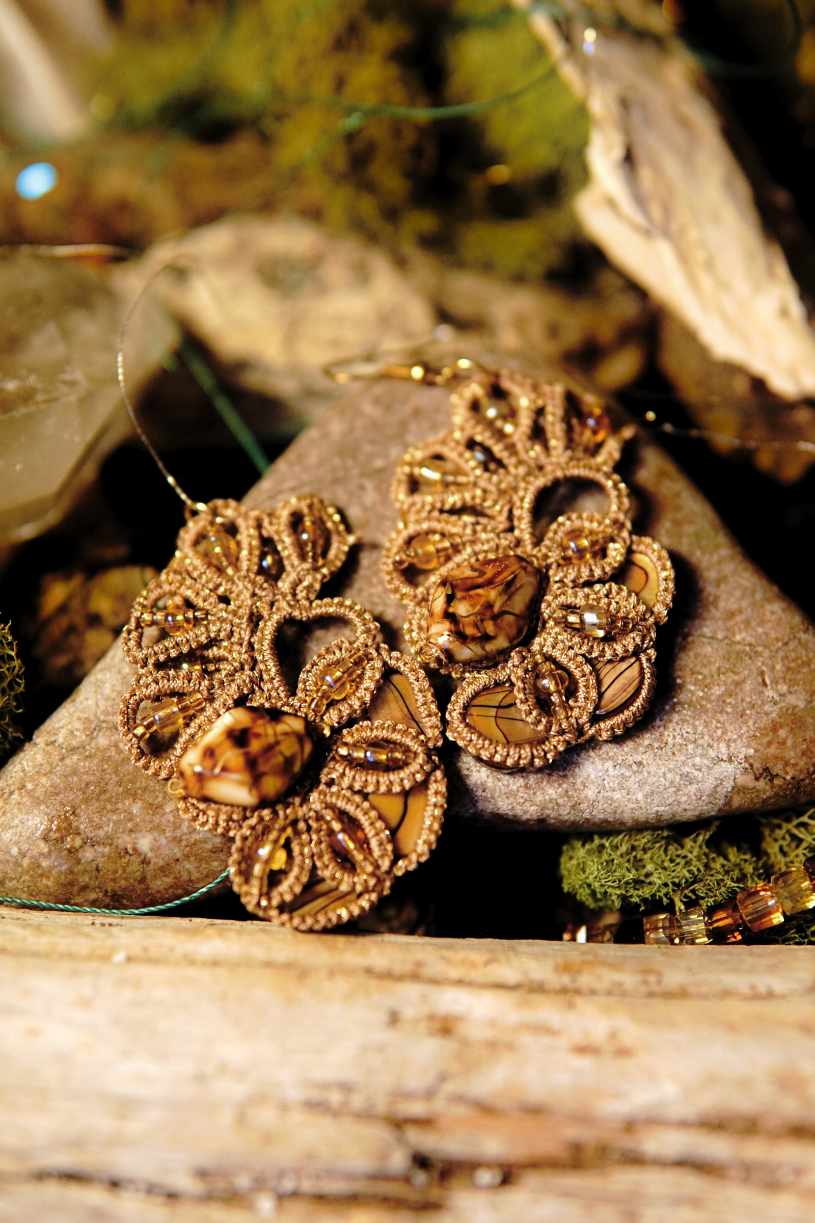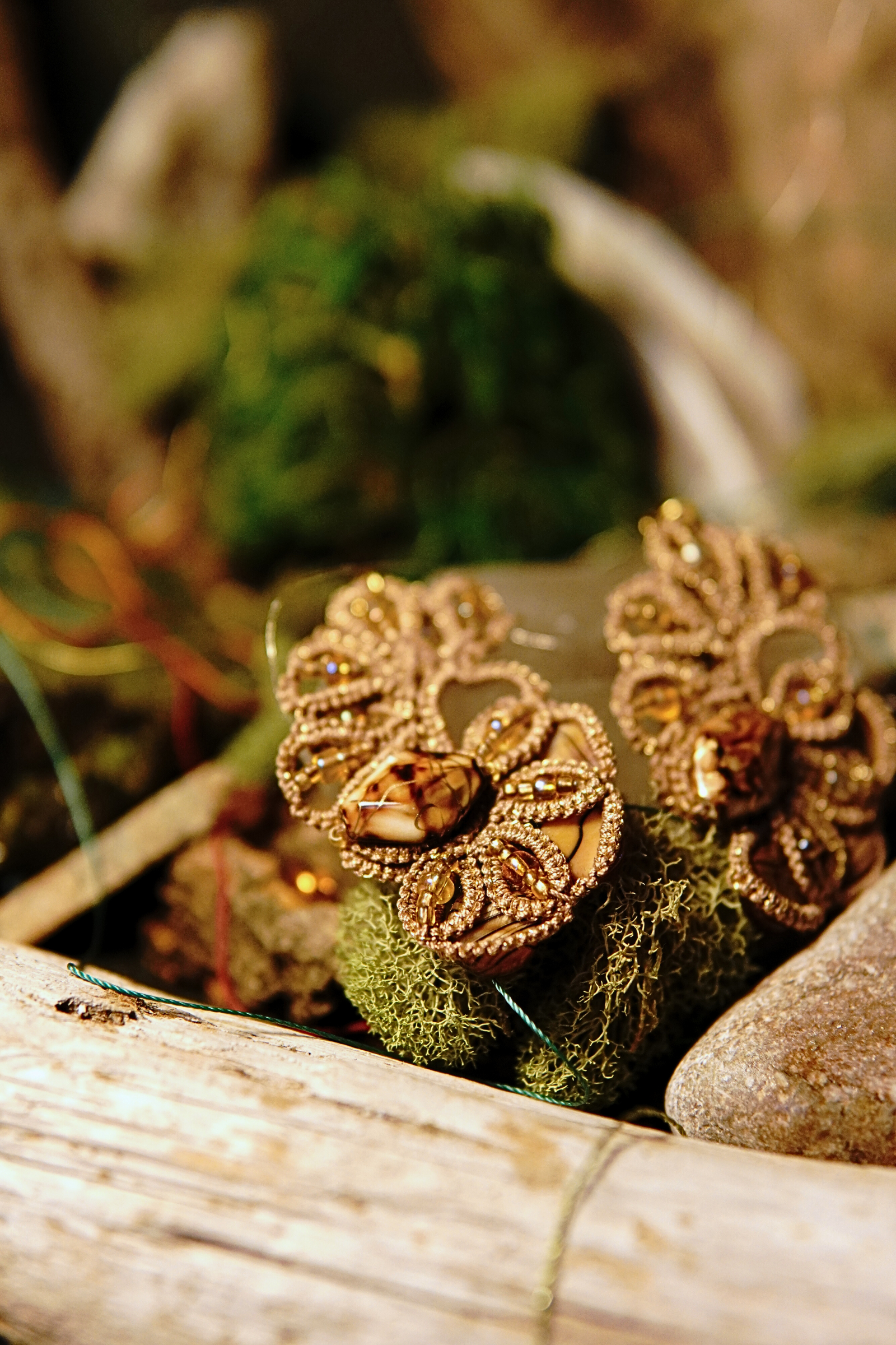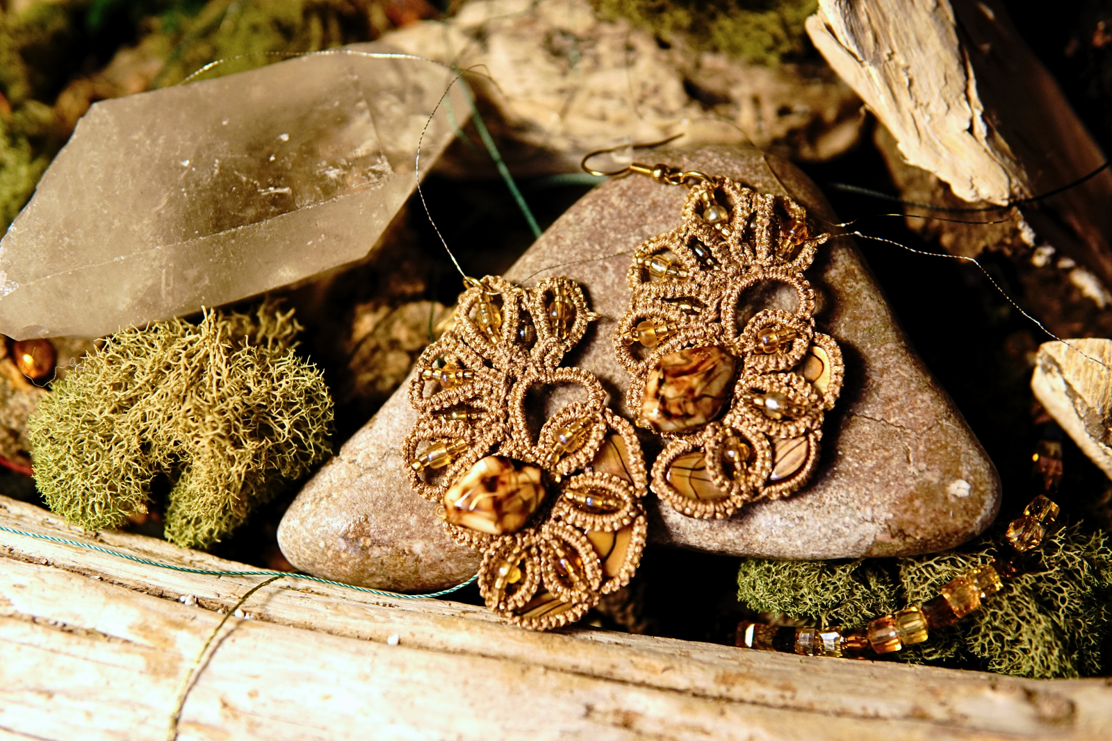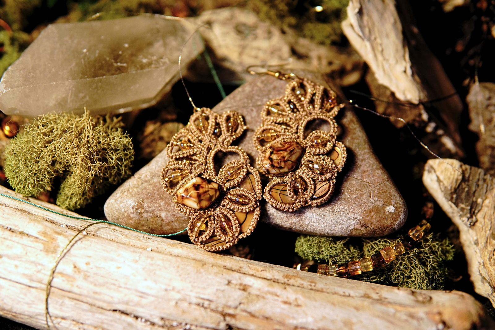 Golden light filters through autumn’s canopy, catching on leaves not yet fallen and casting long, warm shadows on the forest floor. These earrings echo that fleeting moment—tatted in soft brown thread accented with golden filament, strung with beads like flickers of sun. Larger plastic beads offer a warm focal glow, while flat glass rounds add depth and shimmer. Every loop holds the hush between day and night—the quiet warmth before the chill.