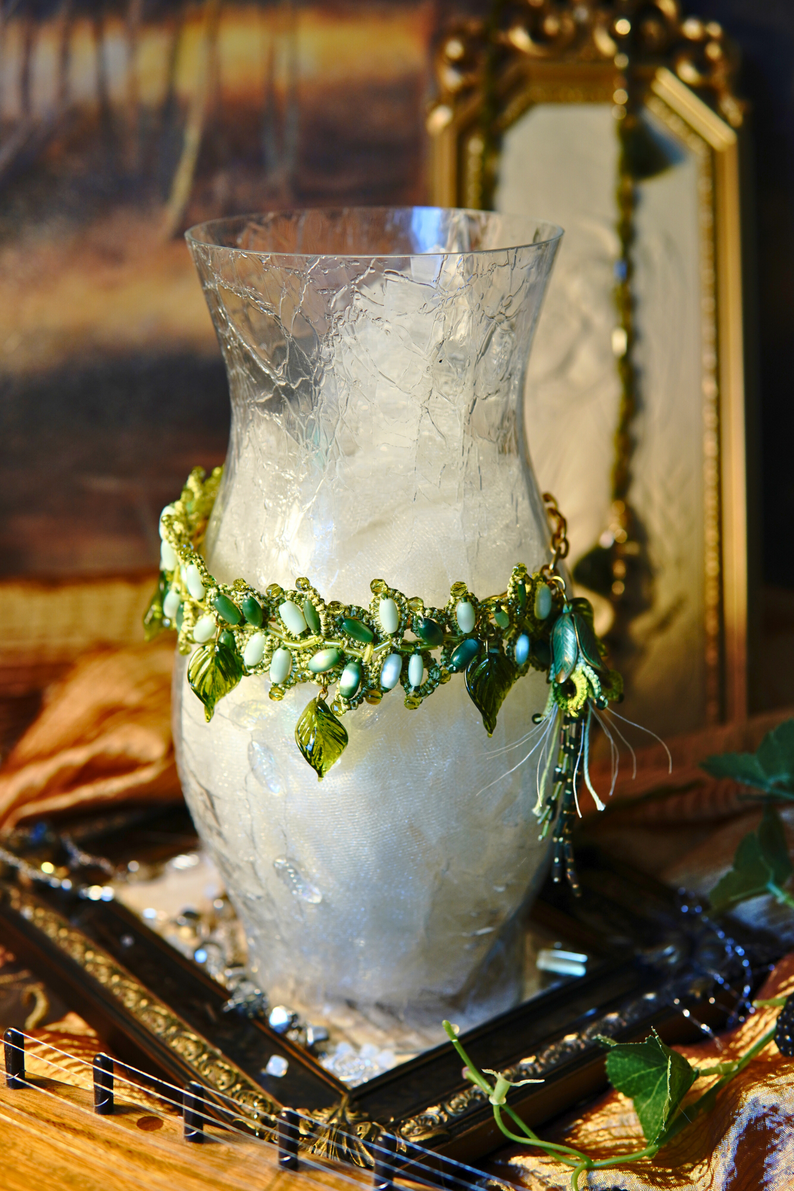 This necklace, crowned with leaf and glint, is believed to be her gift—a fragment of her spirit caught in crystal and thread, bestowed only upon one who walks with quiet reverence and a heart rooted deep.