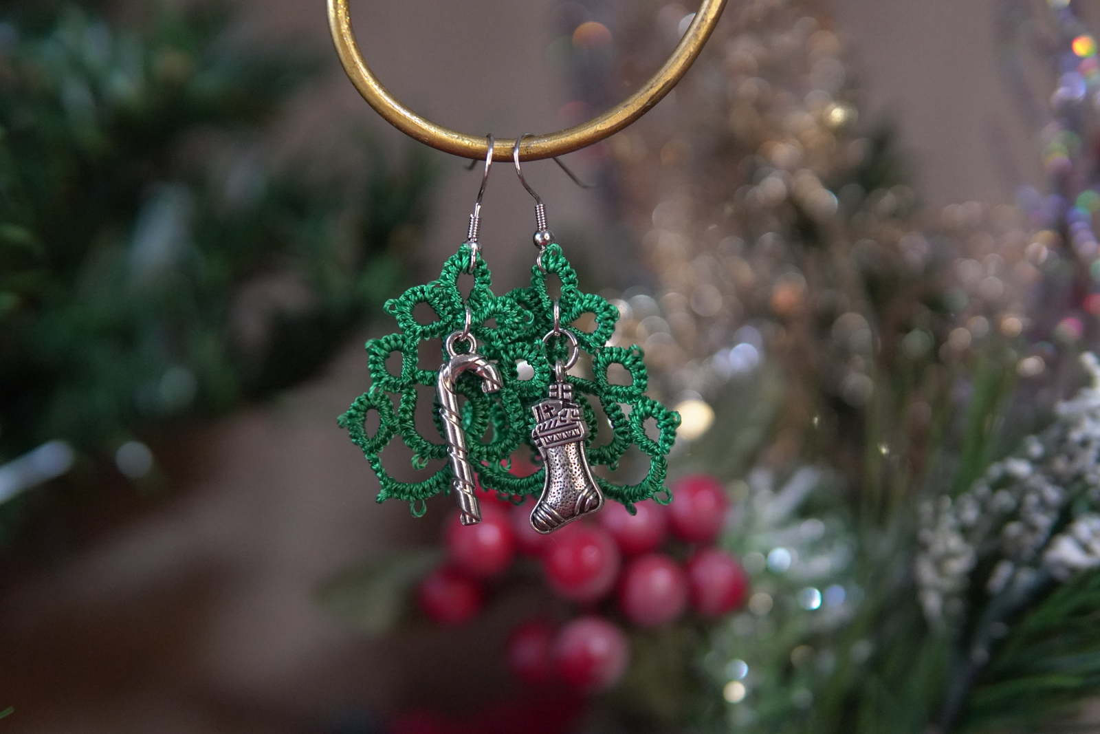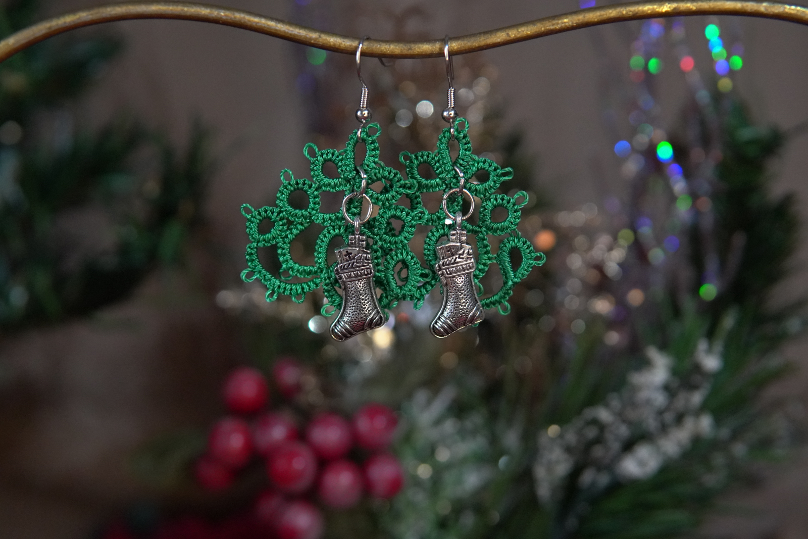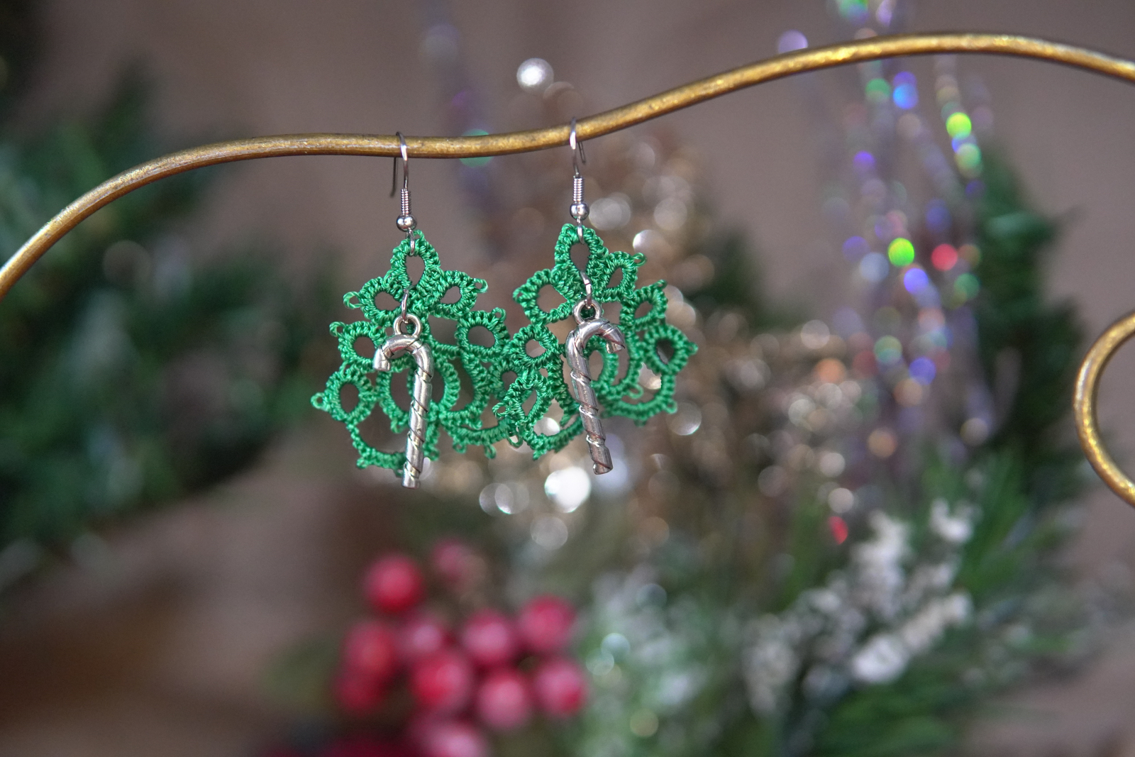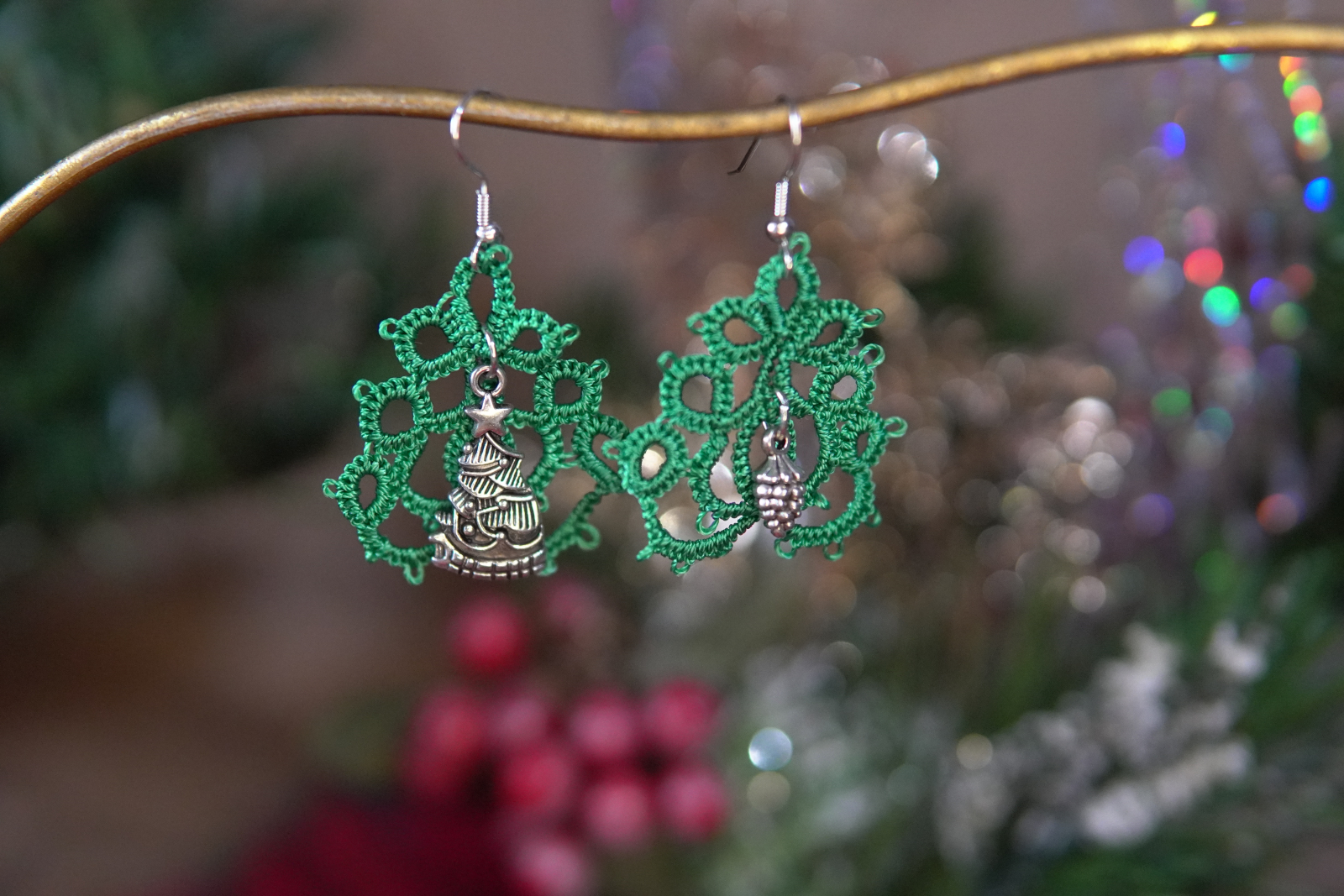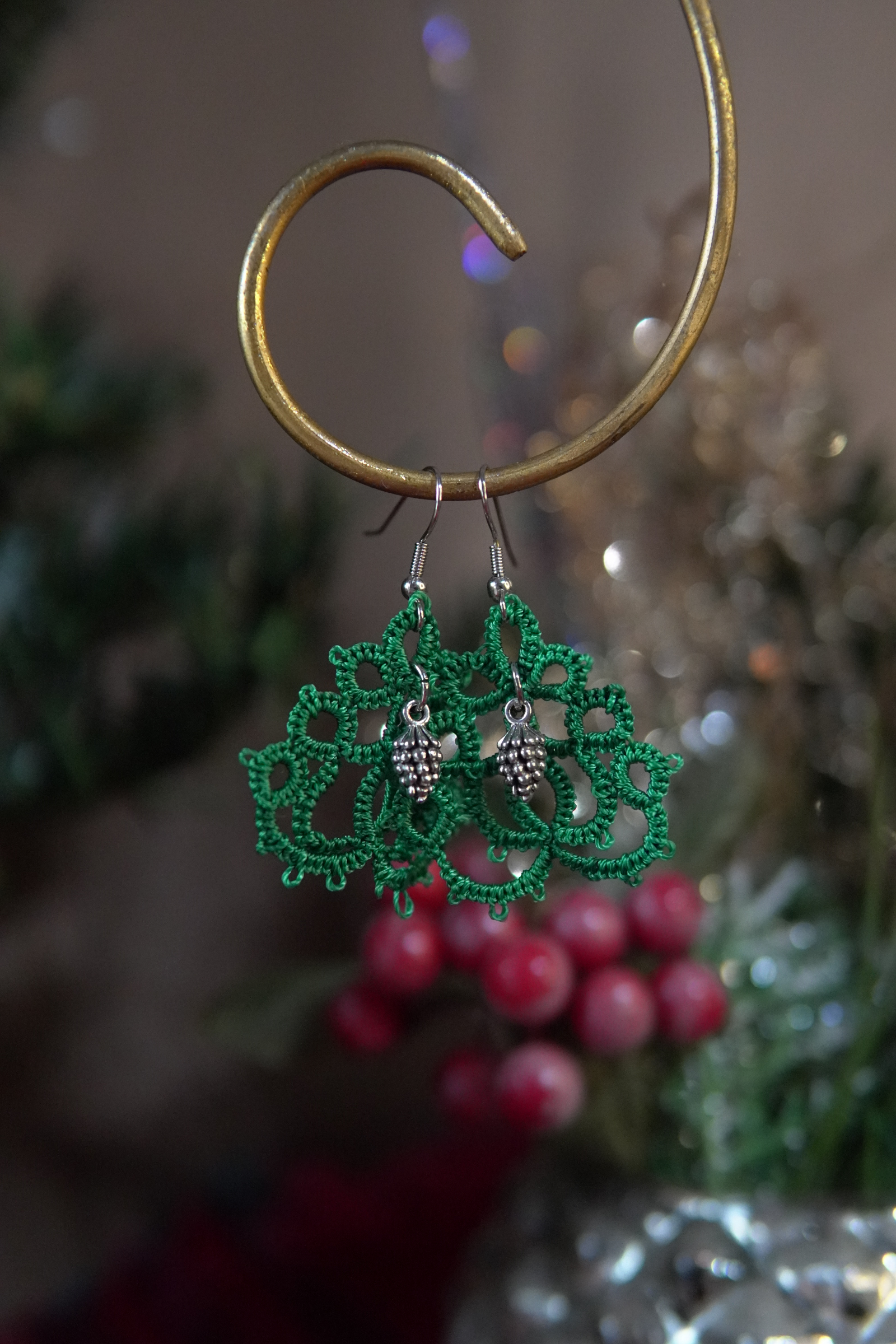 These festive tatted Christmas tree earrings blend delicate lacework with classic holiday charm. Each pair is hand-tatted in rich evergreen thread and finished with detailed silver-tone charms that celebrate the season. Lightweight and full of personality, these earrings bring cheerful sparkle to Christmas gatherings, winter outings, or everyday December wear.