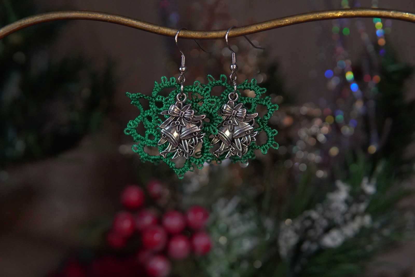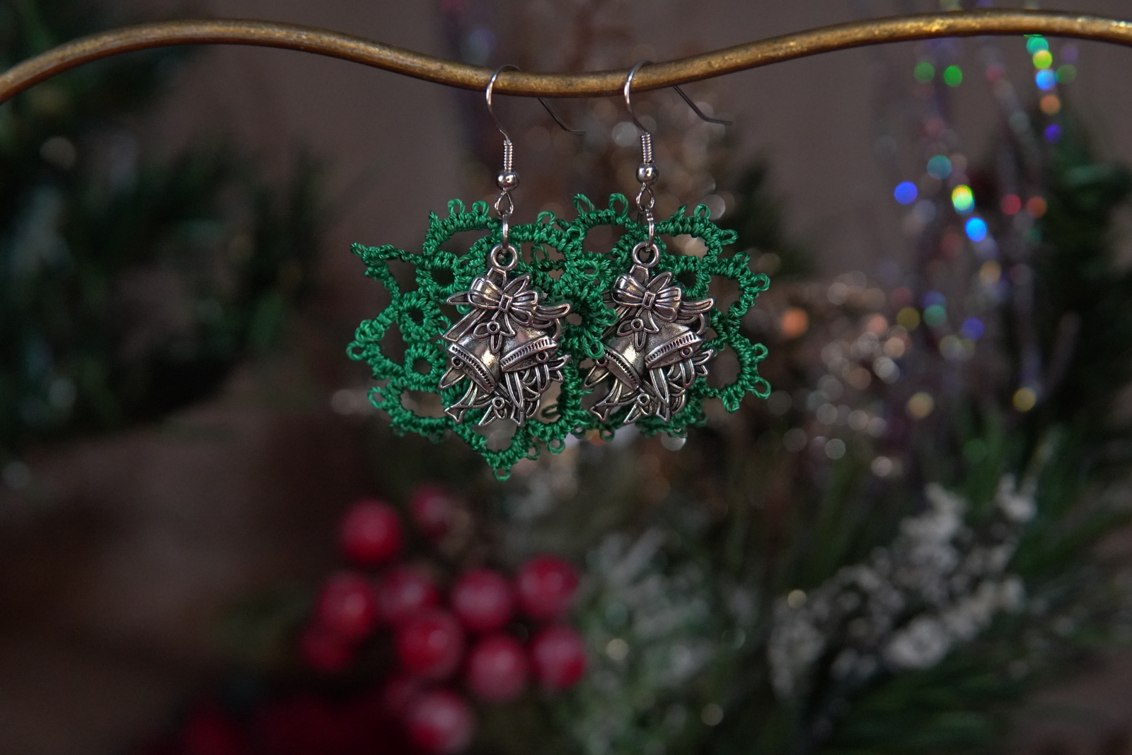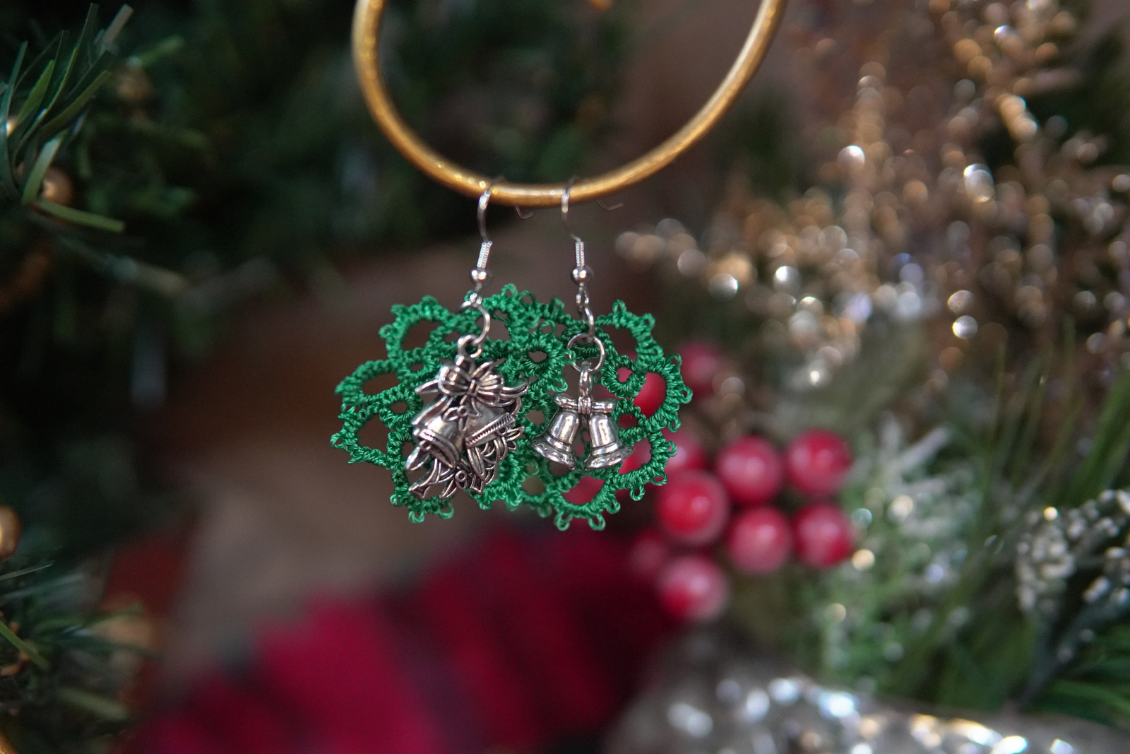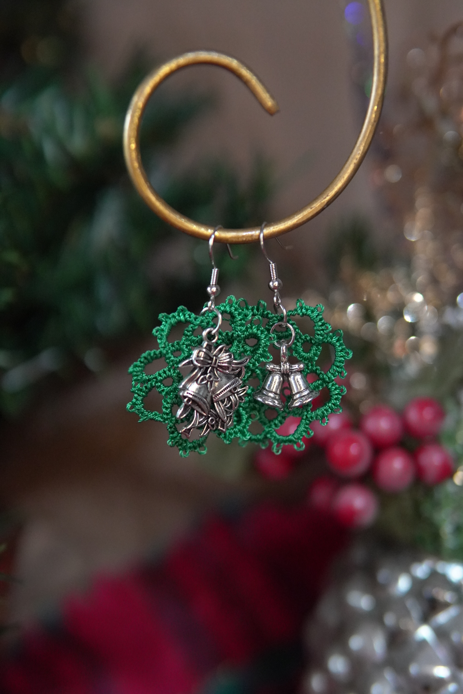 These festive tatted wreath earrings bring classic Christmas charm to your winter wardrobe. Hand-tatted in deep green thread, each wreath is detailed with lacework loops and finished with silver-tone bell charms. Choose between coordinating matched bells or an accent bell pair for a playful, unique look.
