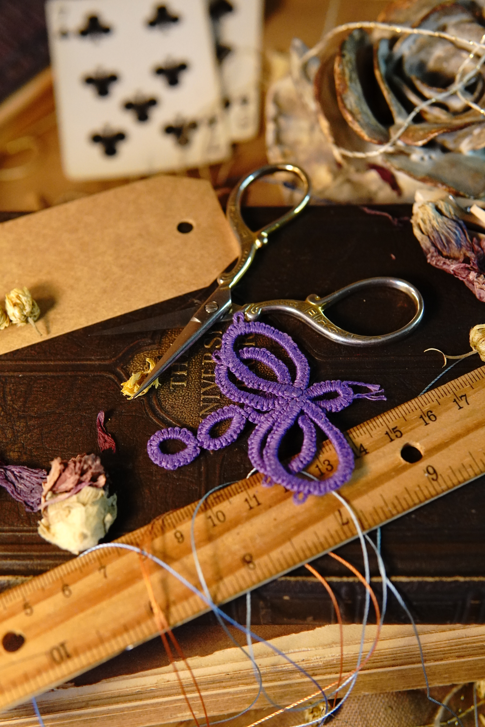 Add a touch of delicate textile artistry to your creative projects with this hand-tatted dragonfly embellishment. Crafted with fine thread and shaped with careful picots and slender wings, each dragonfly brings a whimsical, airy charm to cards, scrapbooks, journals, shadow boxes, and keepsake albums.