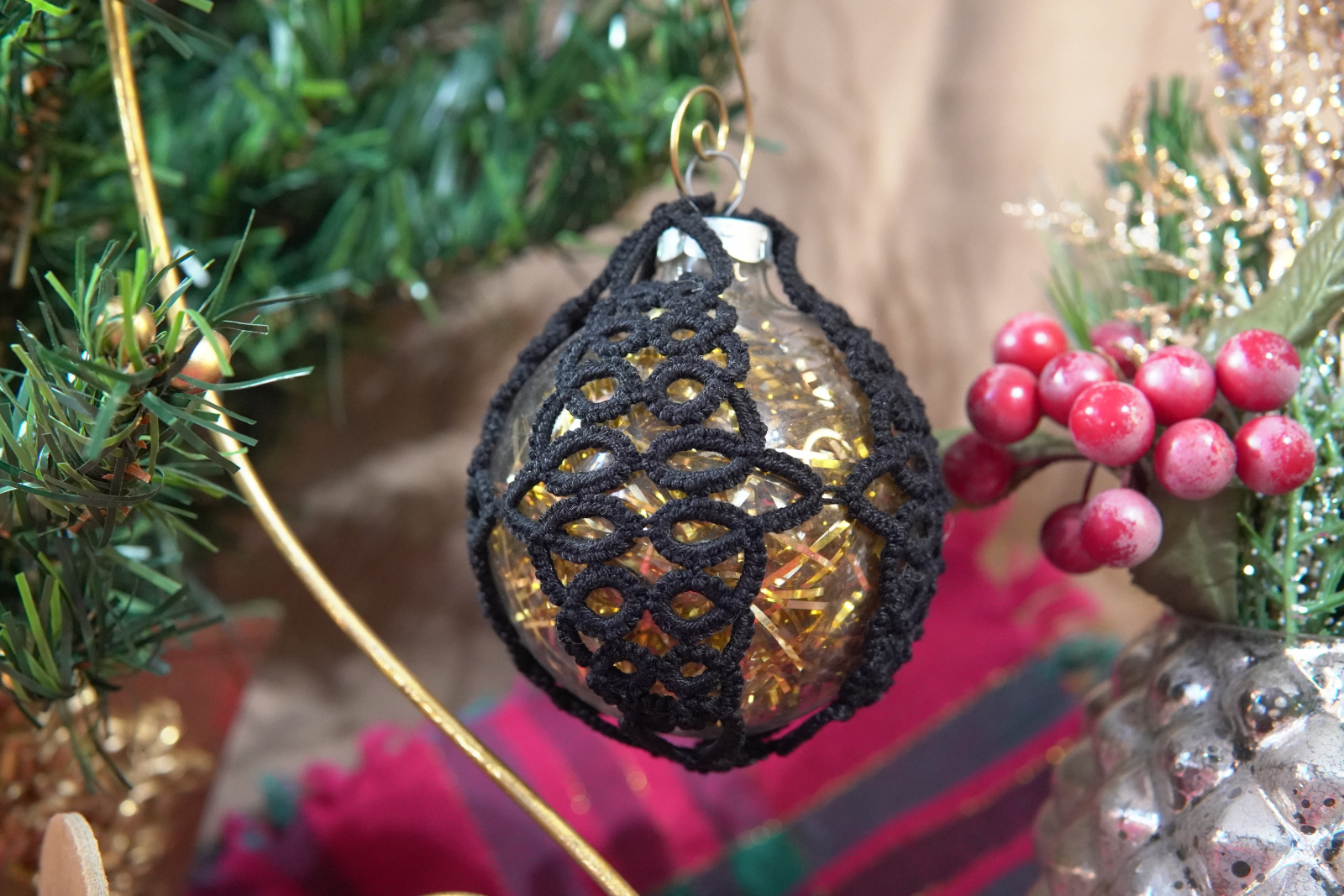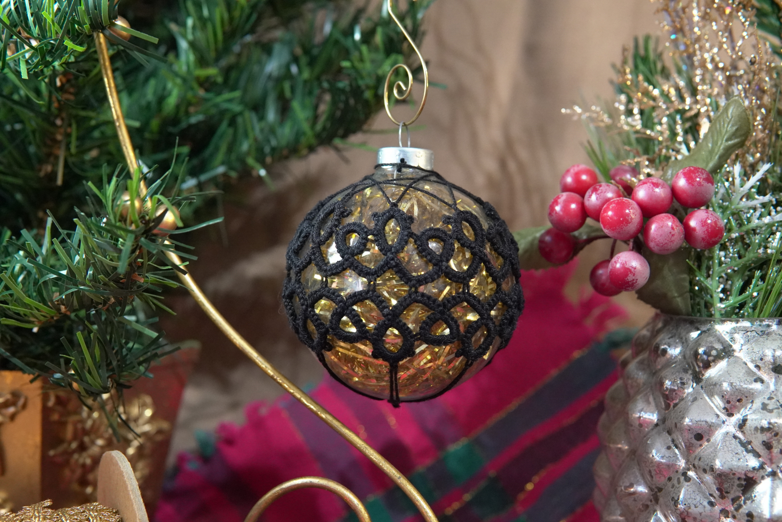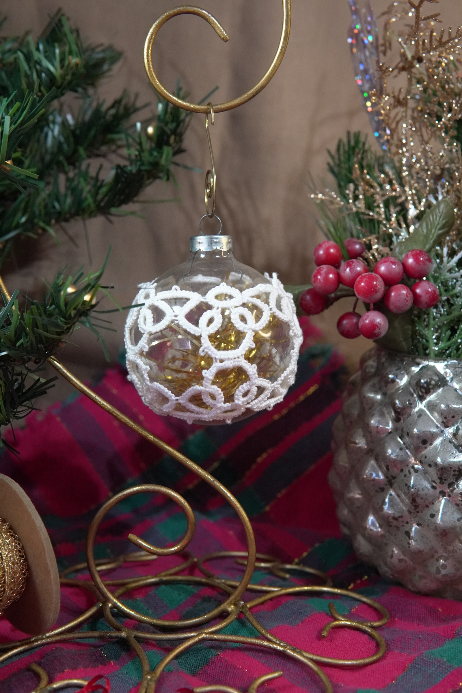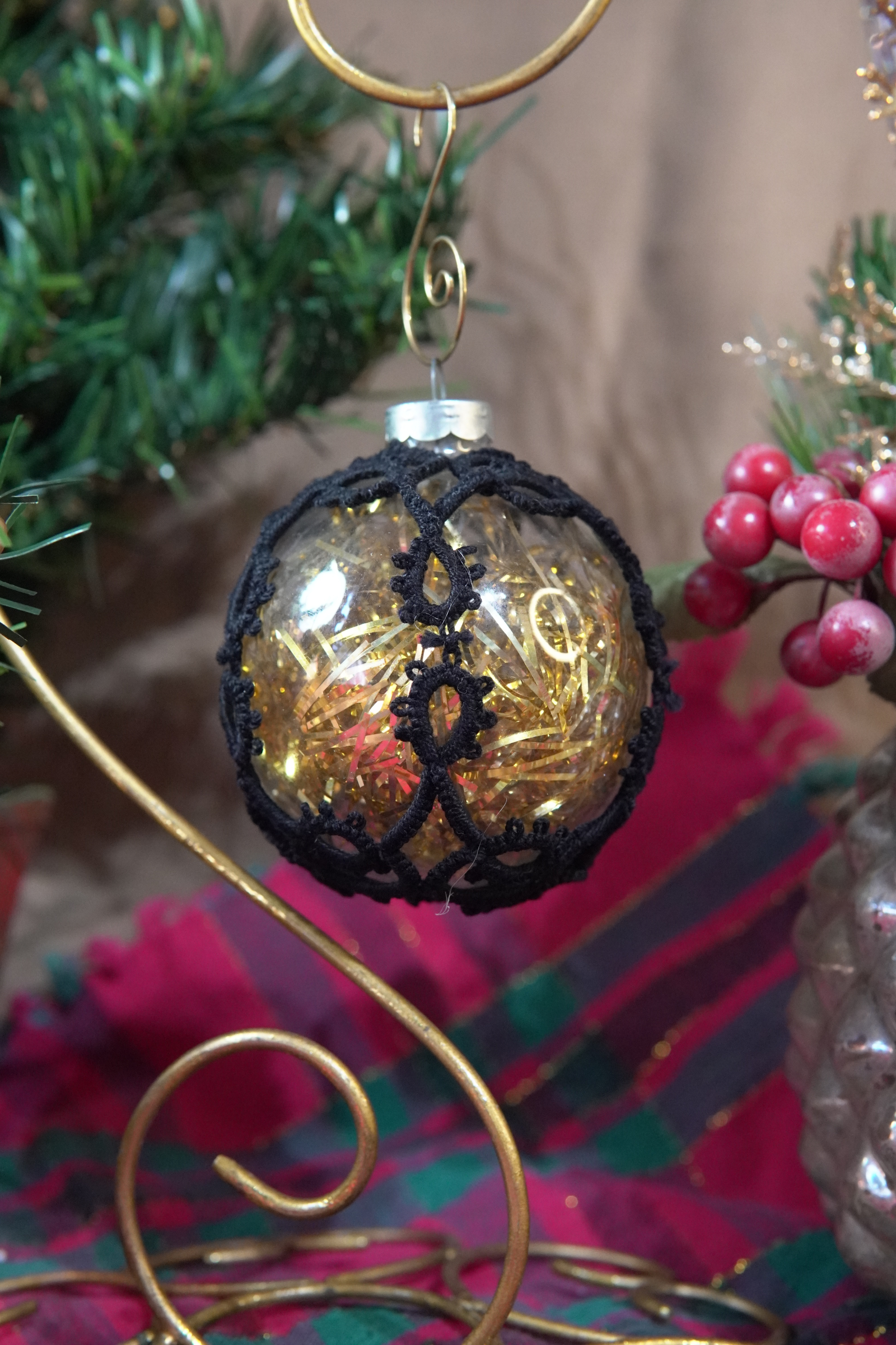 Bring heirloom charm to your holiday decorating with these glass ornaments wrapped in hand-tatted lace. Each ornament begins with a clear globe filled with warm gold shimmer, then is fitted with an intricate lace overlay—crafted stitch by stitch in your choice of black or white thread.