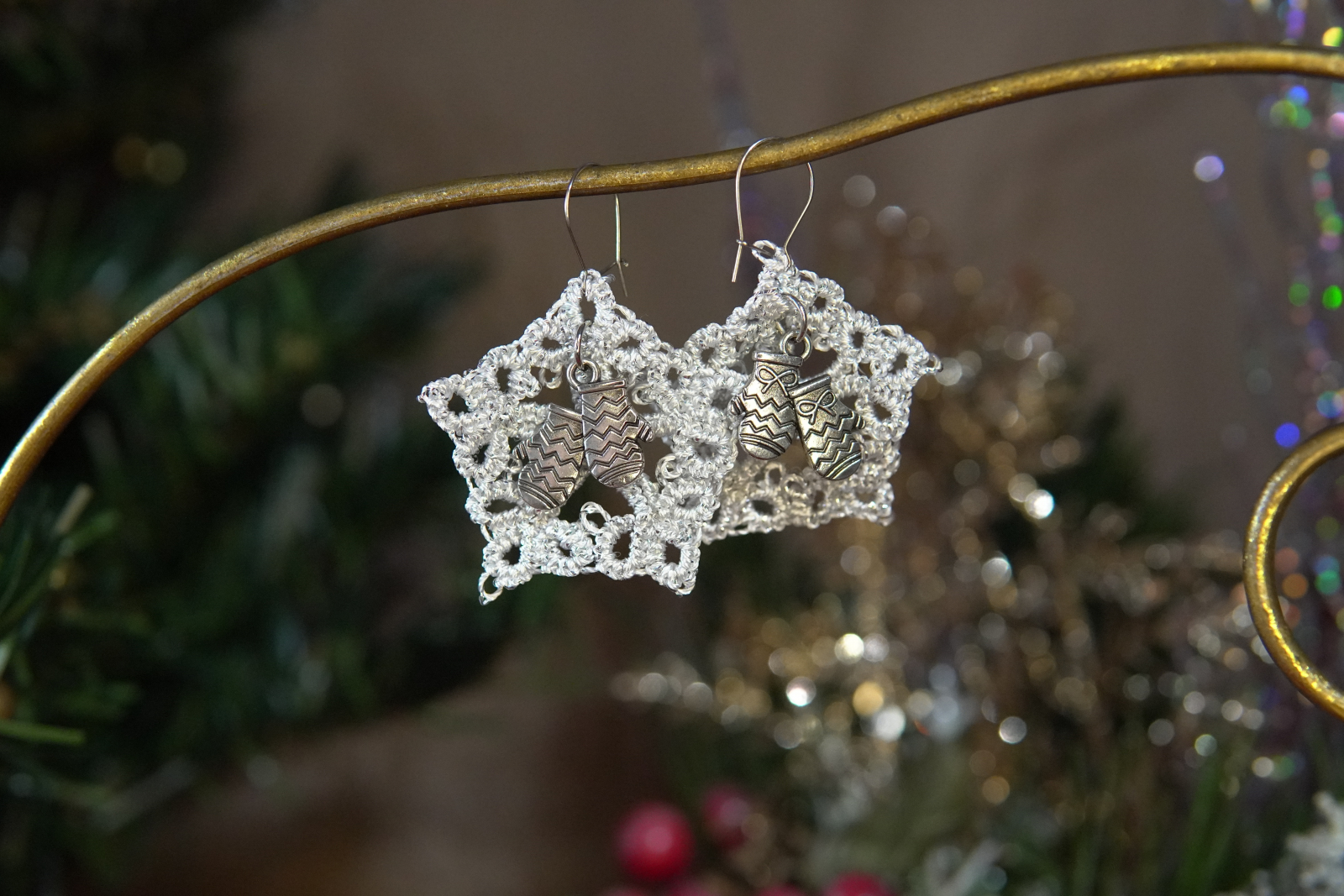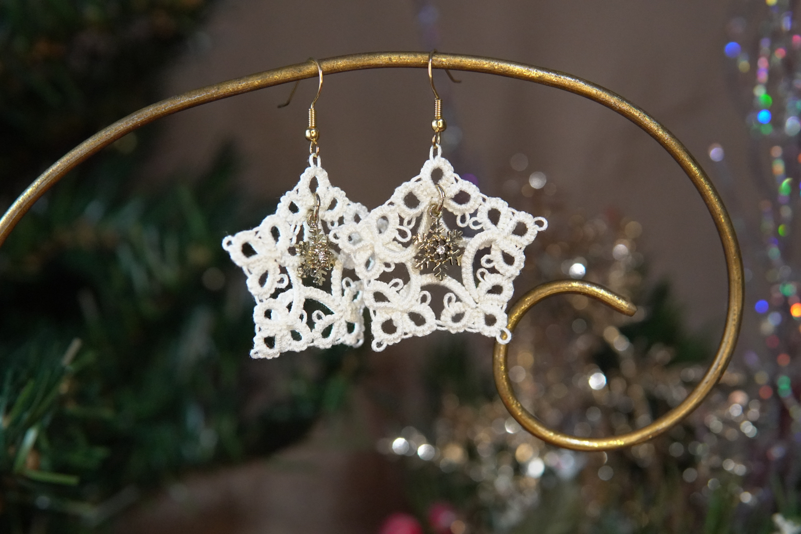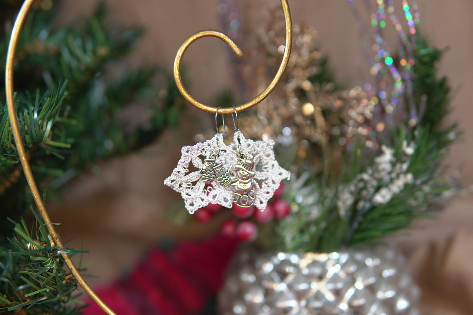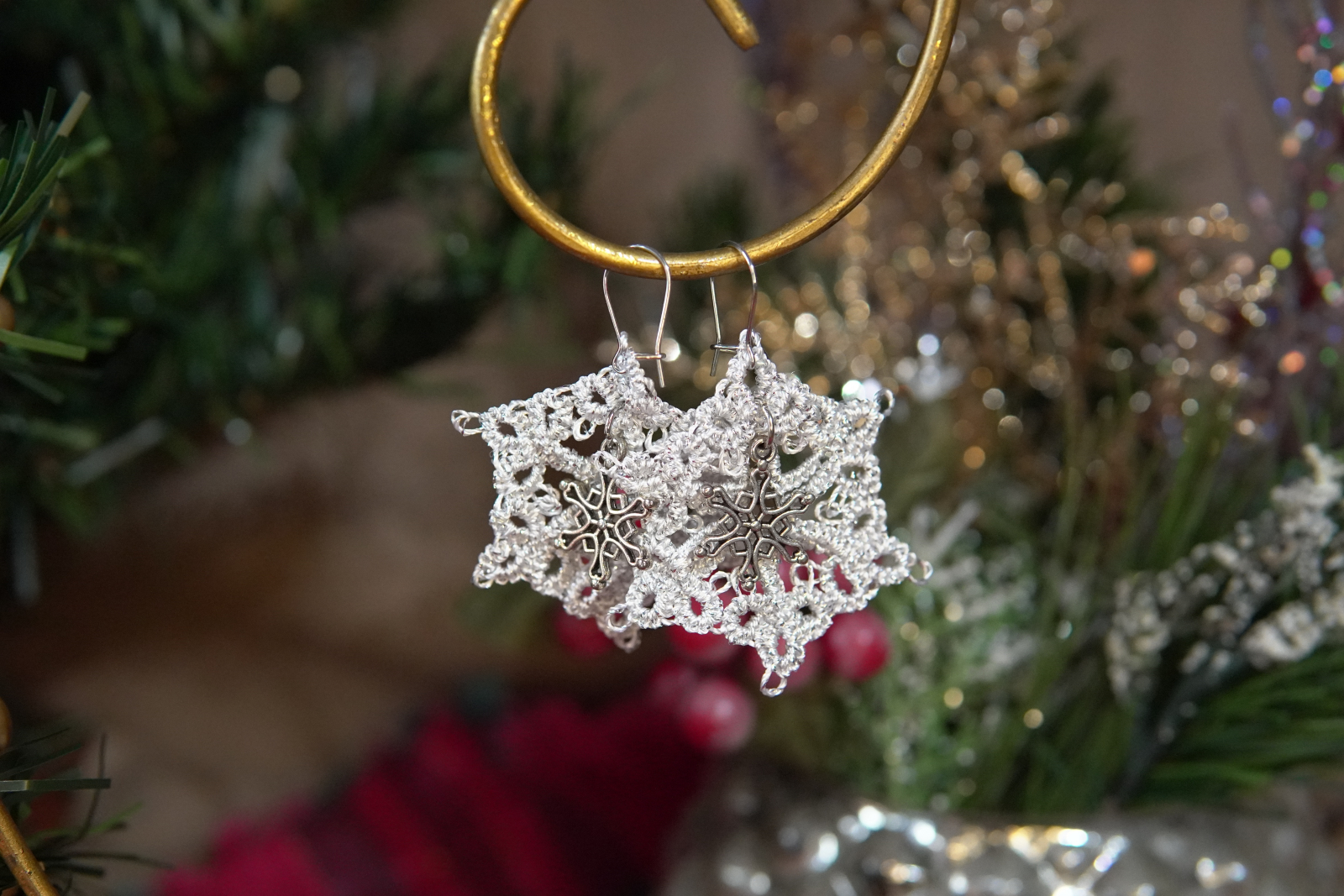 Tatted Winter Lace Earrings with Silver Charms – Holiday Jewelry (4 Styles) - Threadmarked