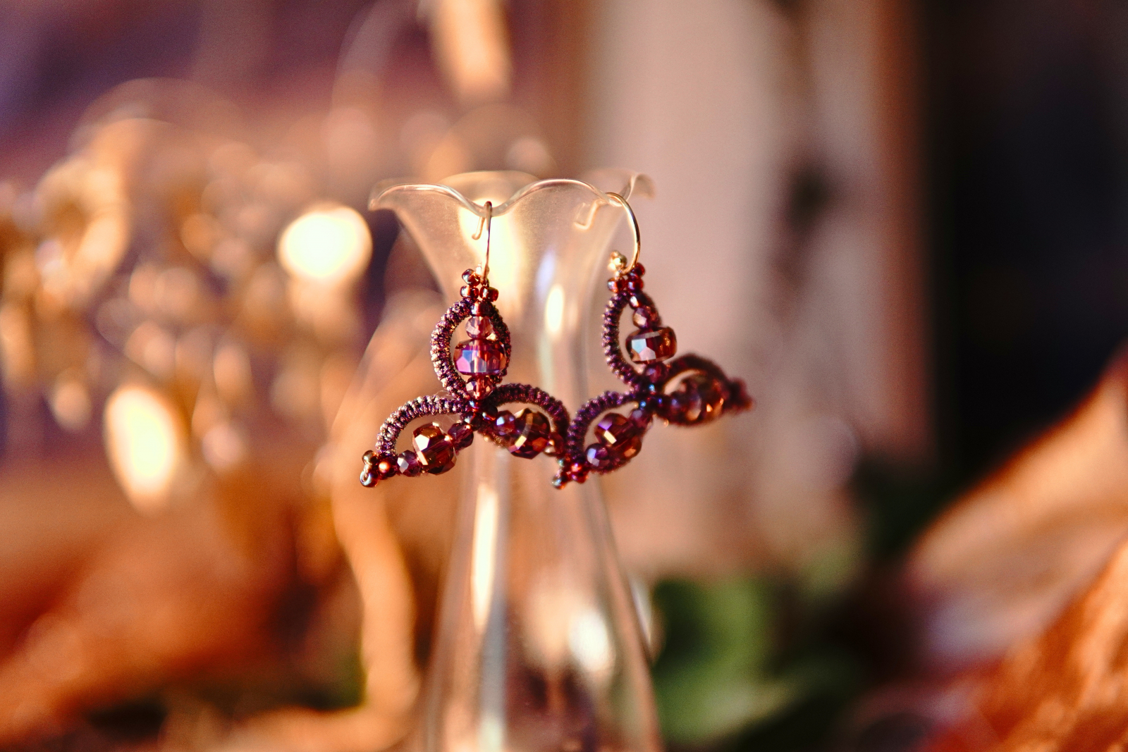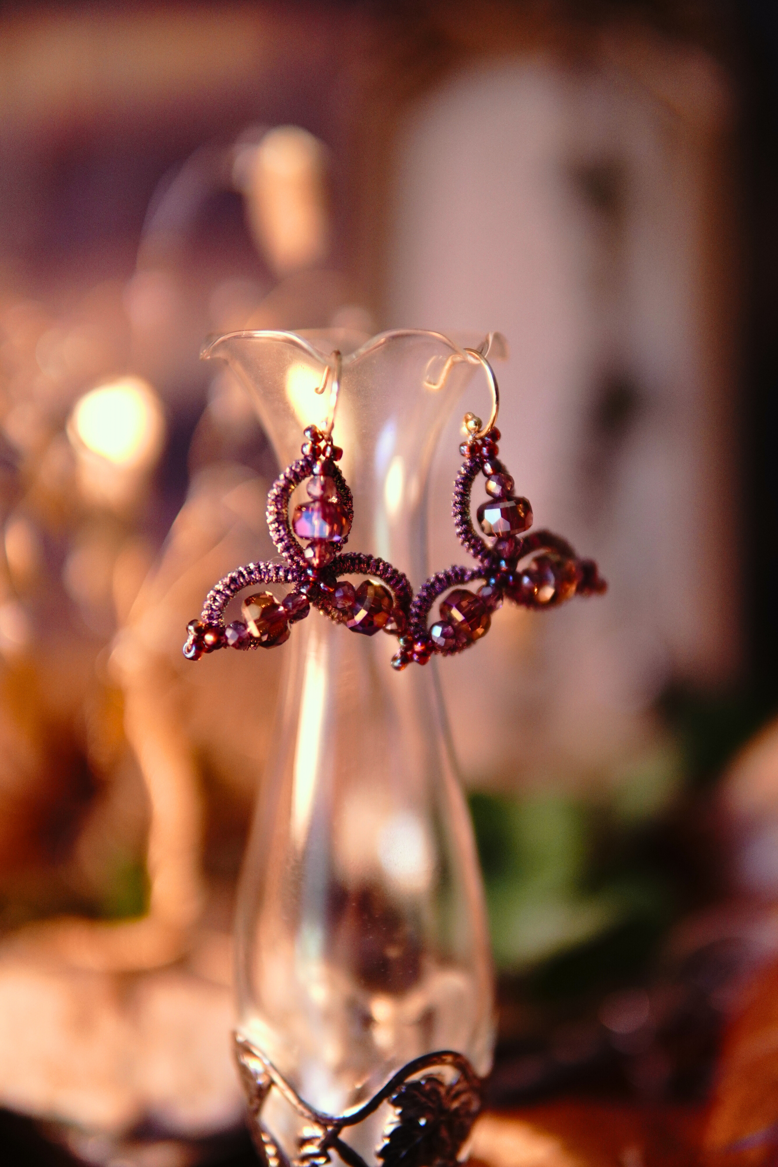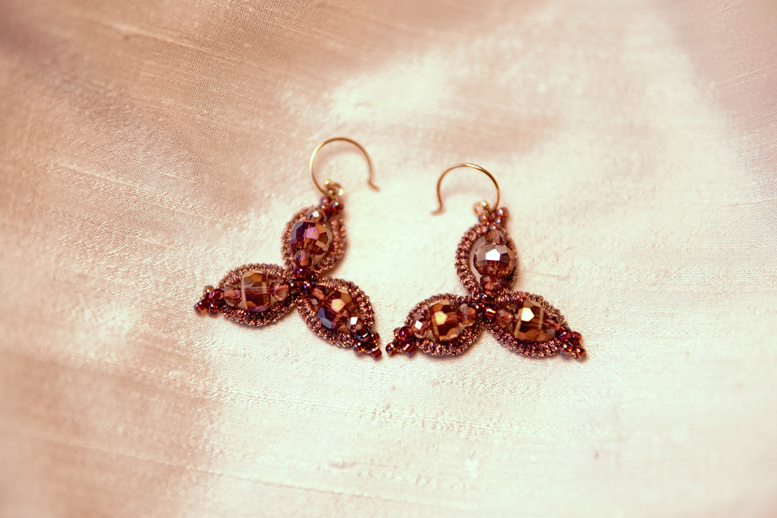 Needle-tatted using Italian polyester thread in rose, wine, and muted purple tones