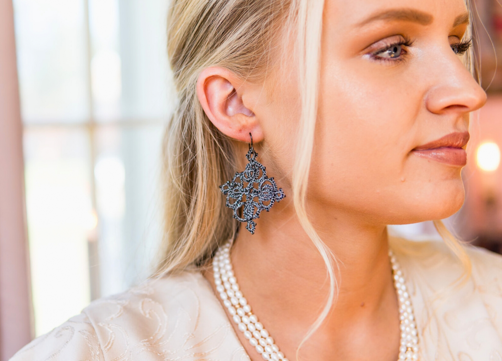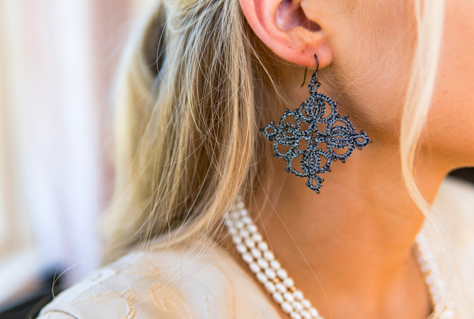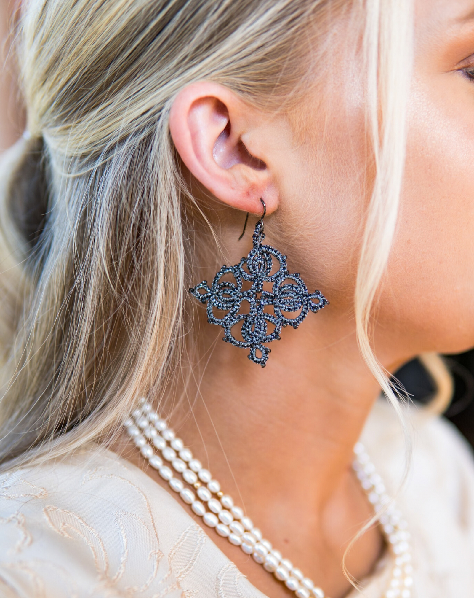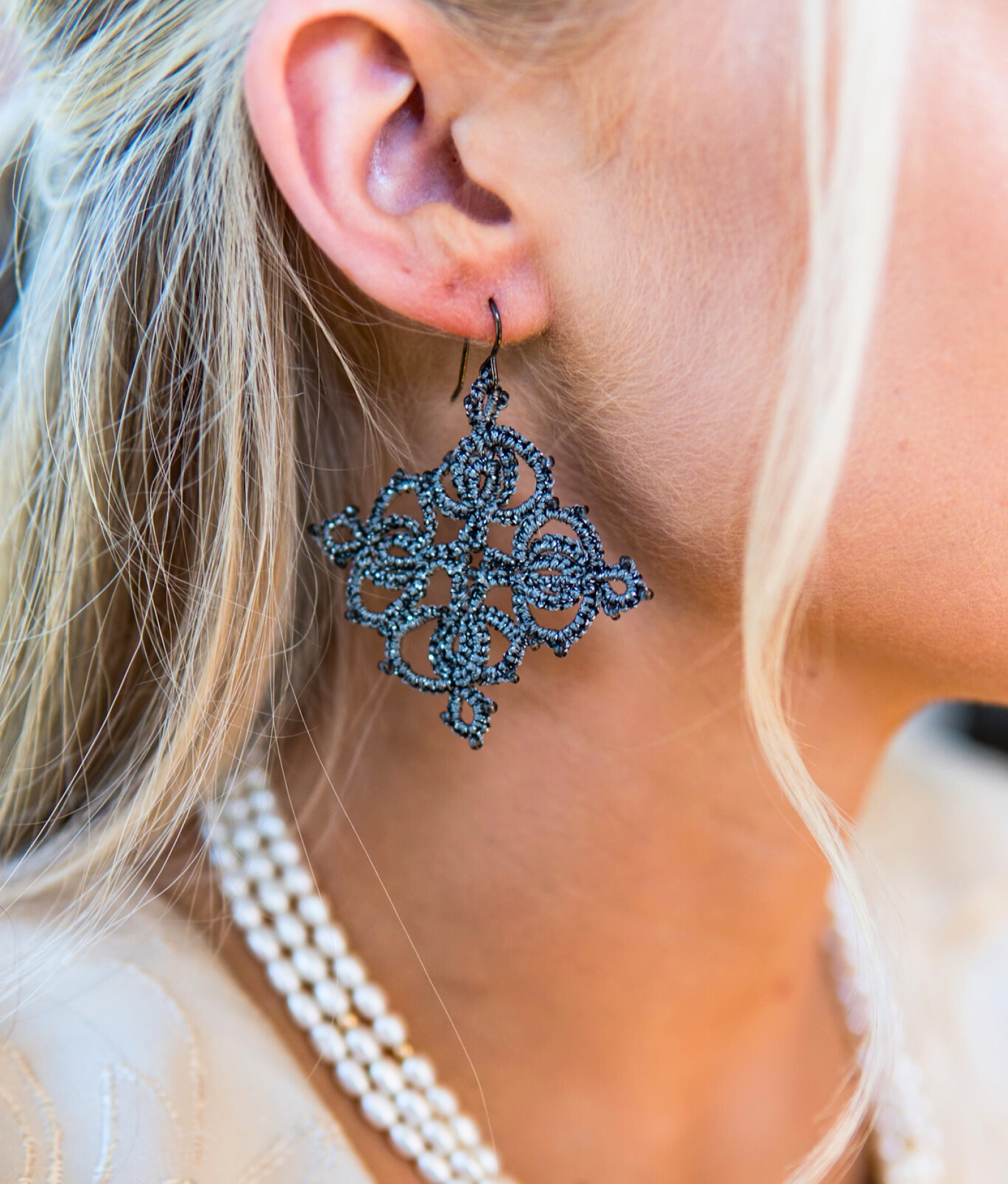 Lightweight yet intricate, these earrings are needle-tatted in deep charcoal cotton thread, accented with subtle beading that catches the light without overwhelming the pattern. This is lace meant to linger—quietly ornate, beautifully feminine, and steeped in the quiet elegance of a bygone age.