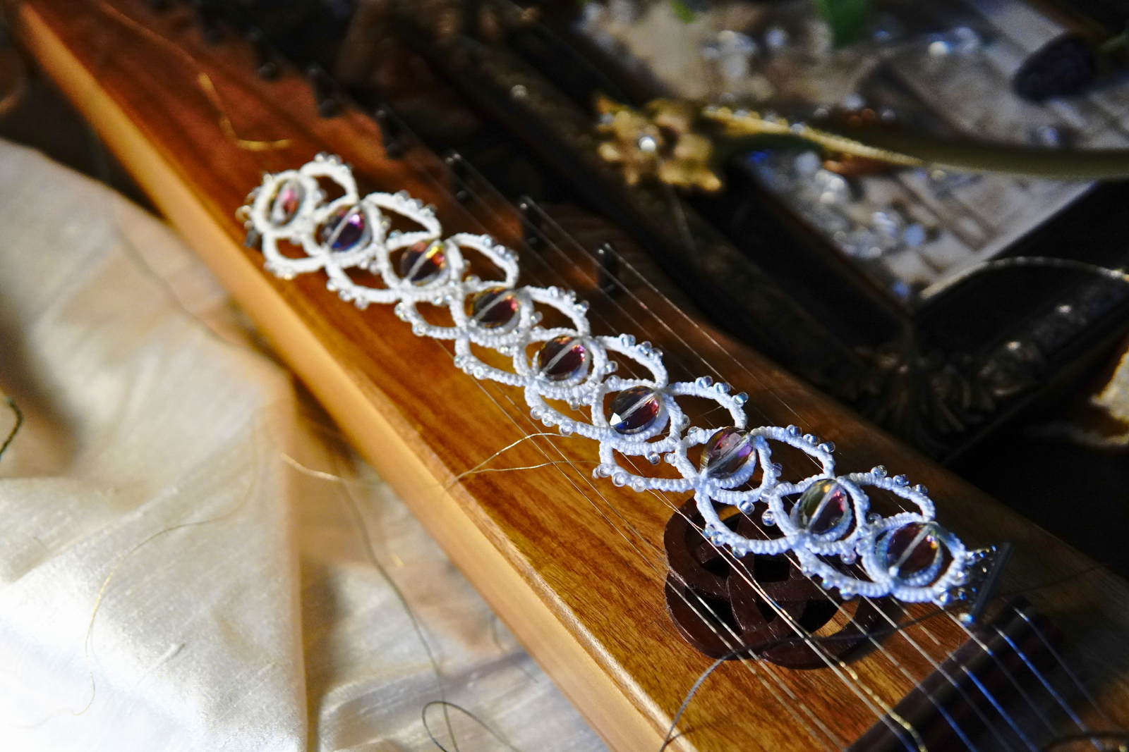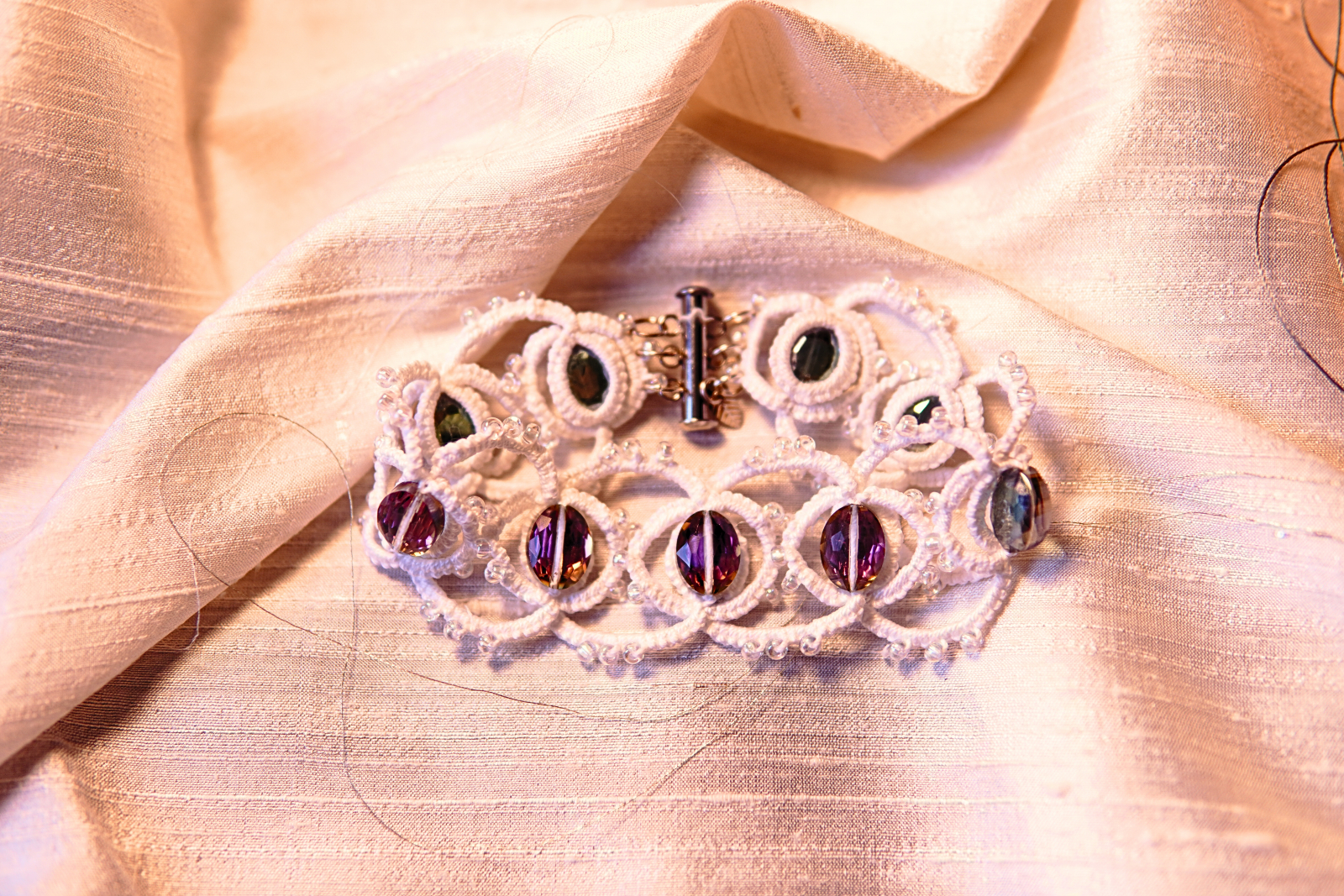 Needle-tatted in white cotton thread and accented with shimmering glass beads surrounding faceted Aurora Borealis crystals. Finished with a stainless steel locking slide clasp for secure wear.