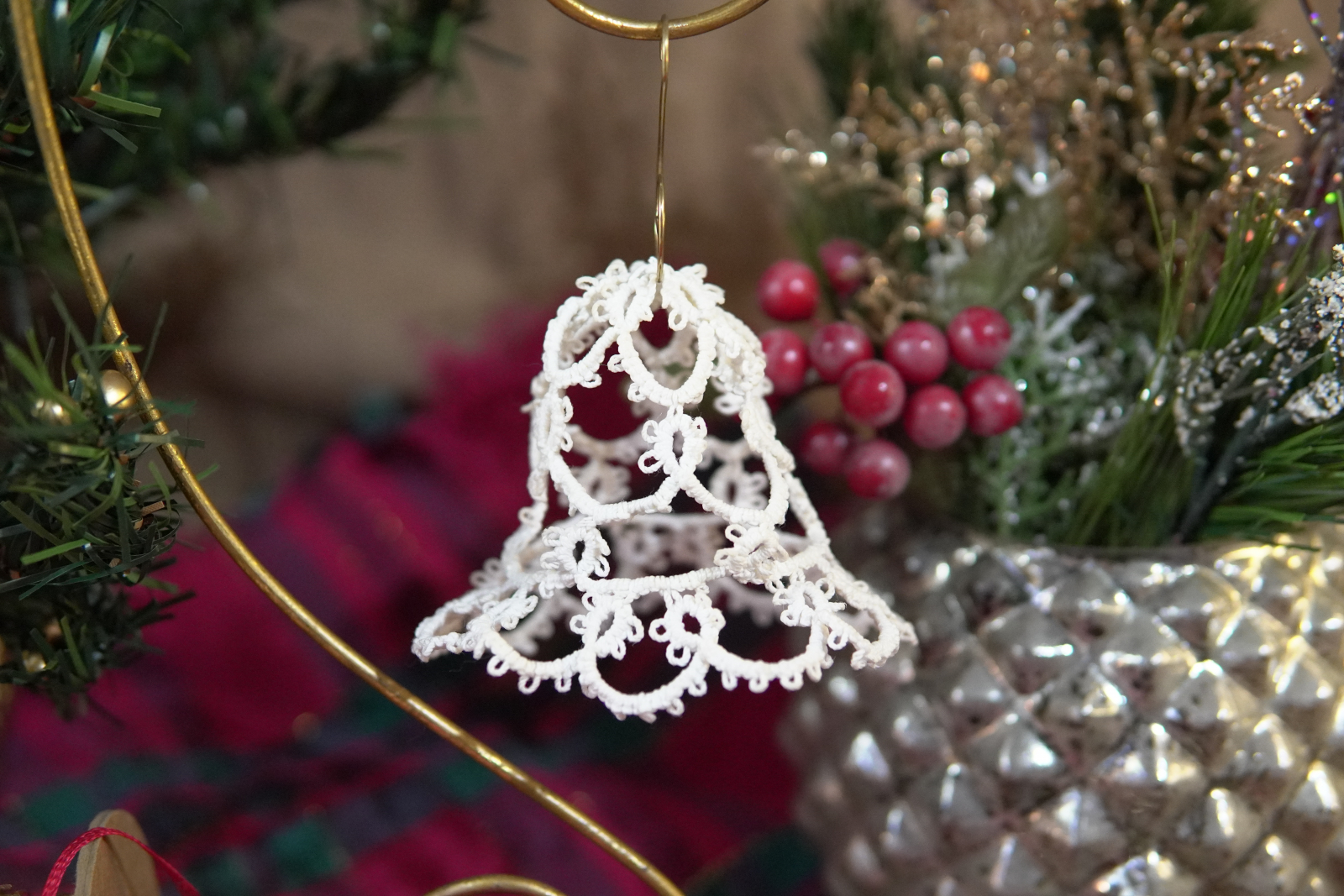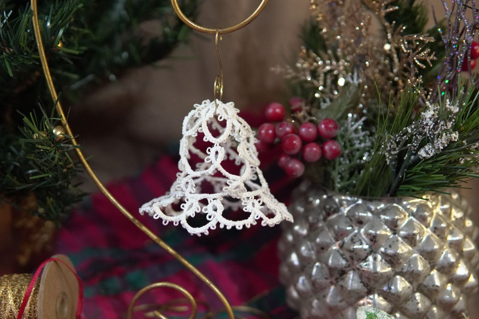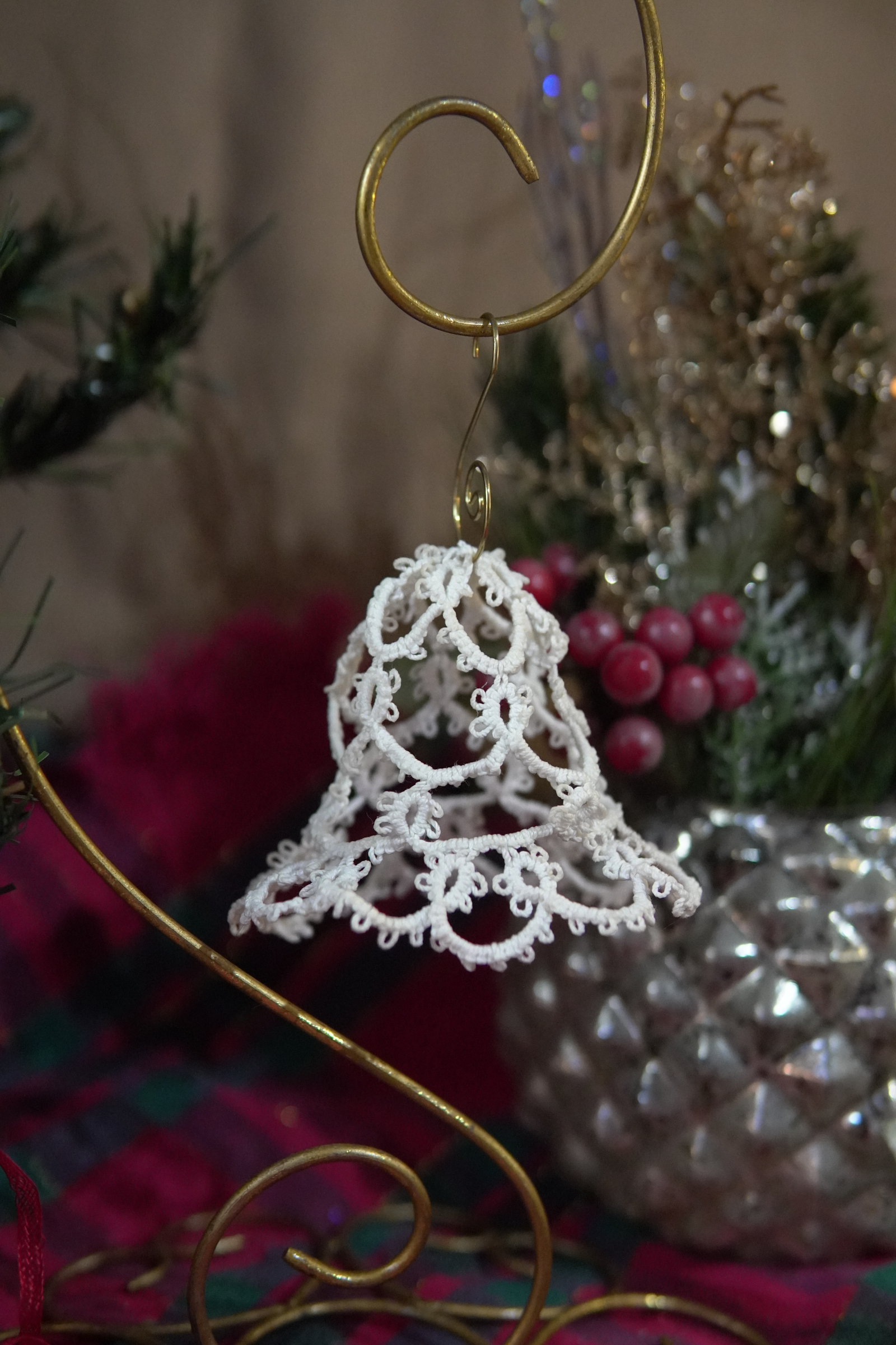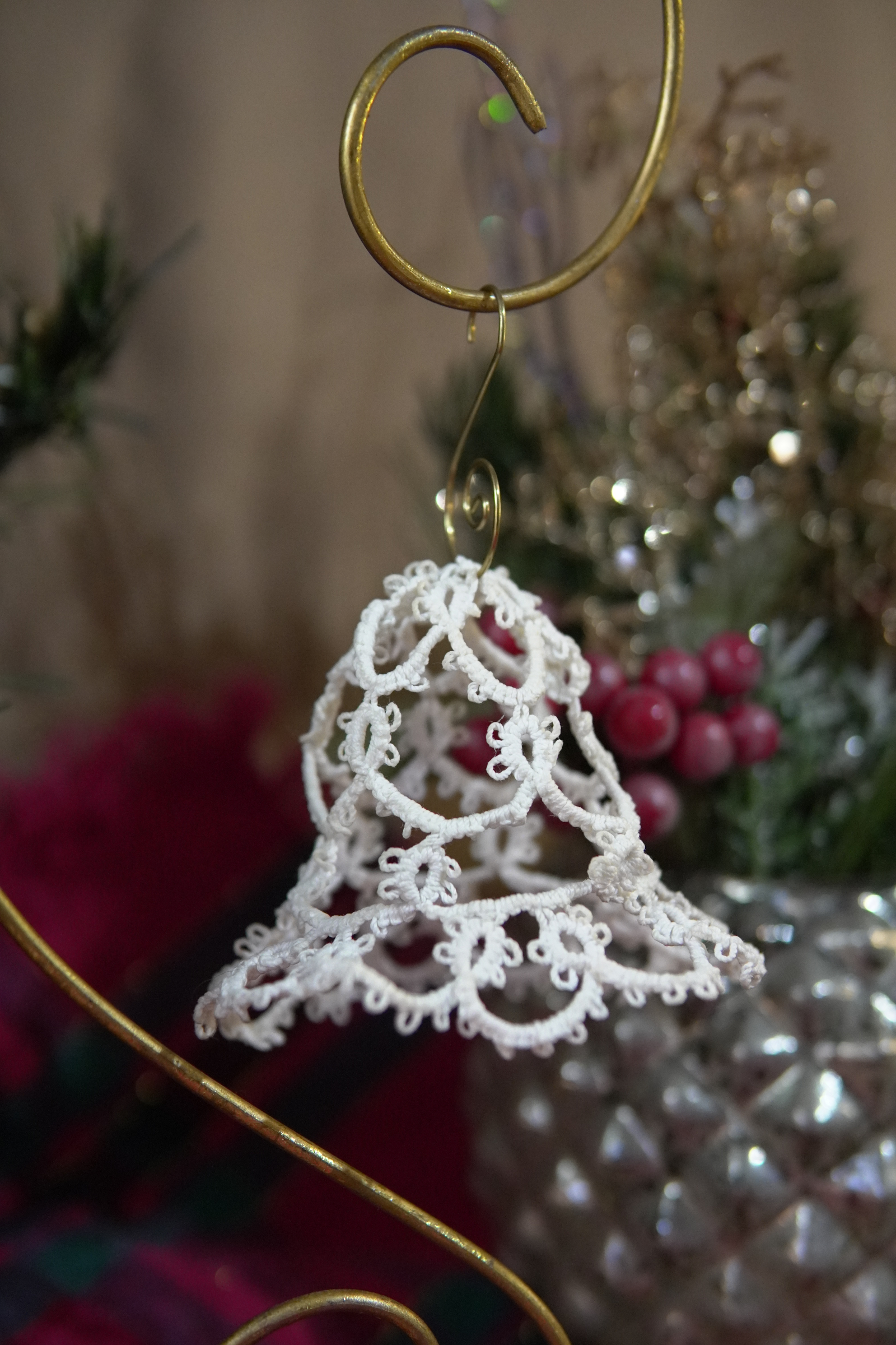 Bring timeless elegance to your holiday décor with this delicate tatted lace bell ornament, handcrafted in crisp white thread. Its open, airy structure catches the lights of your tree beautifully, creating a soft vintage glow. Lightweight, classic, and full of heirloom charm—perfect for gifting or adding handmade warmth to your seasonal display.