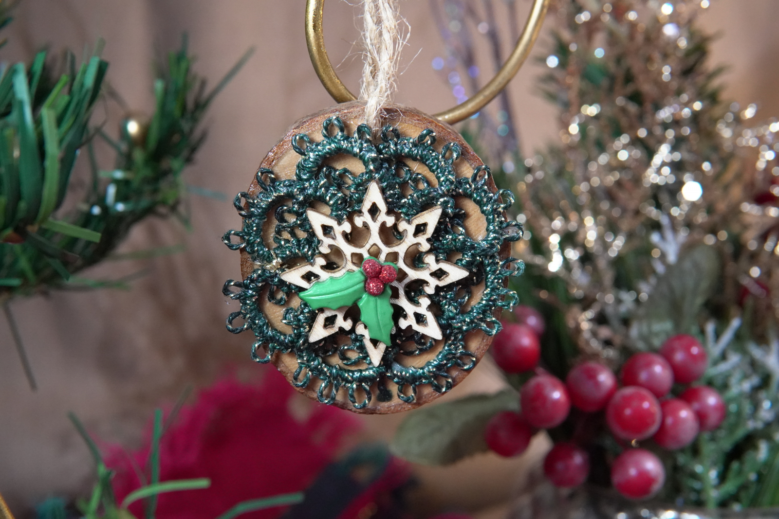 Wood Slice Tatted Wreath Ornament – Snowflake, Poinsettia, or Holly | Threadmarked Christmas Décor